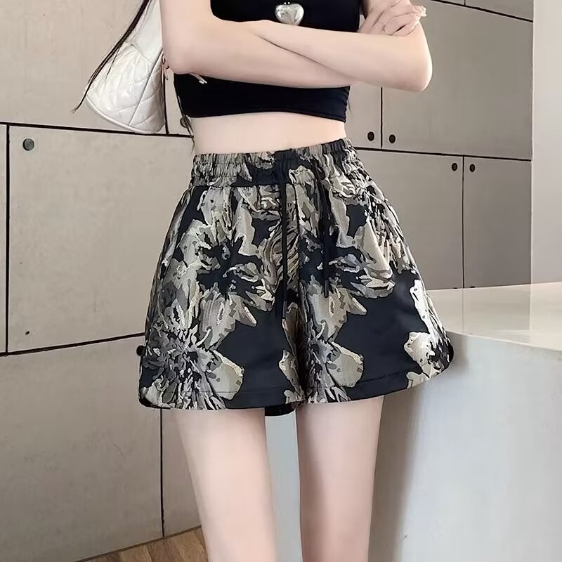 PF345#欧货夏季新款冰丝短裤2024女松紧腰宽松百搭显瘦几何A字阔腿裤