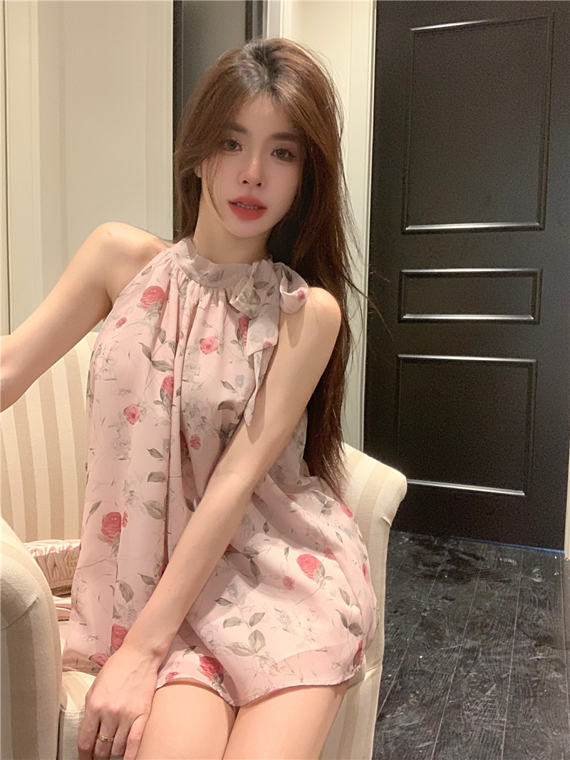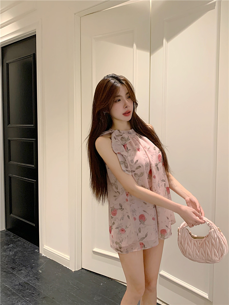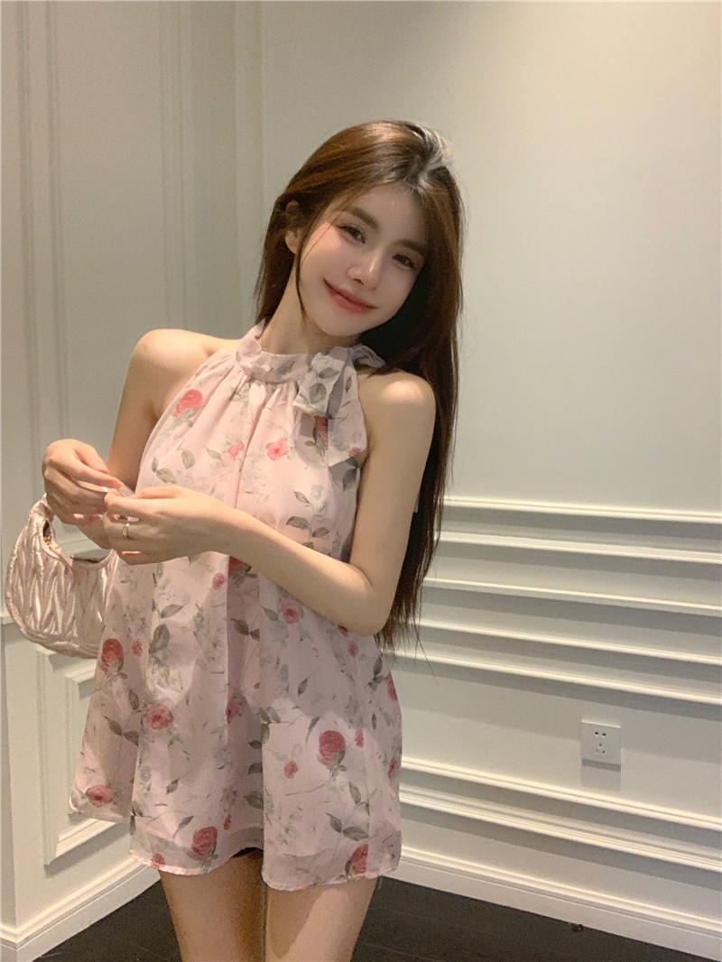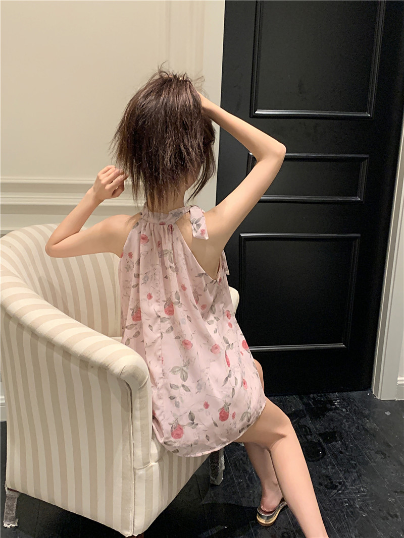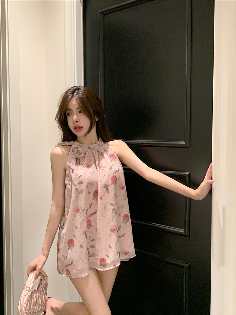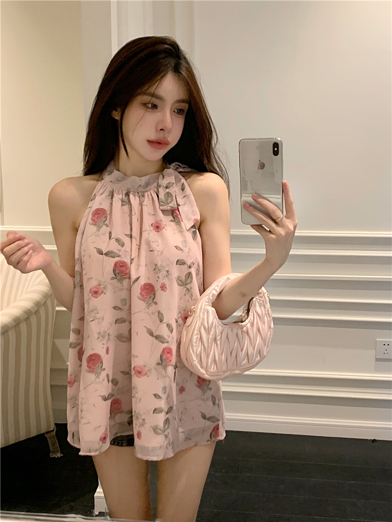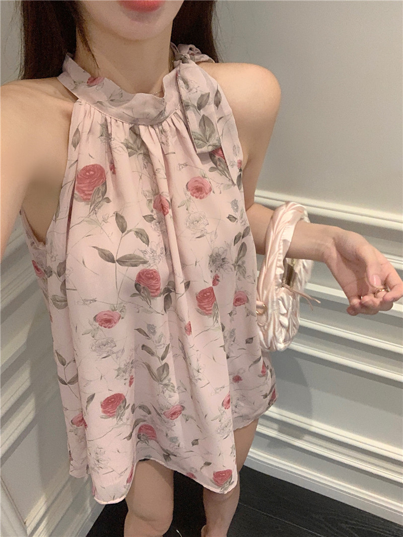 PF413#田园抹胸型艺术绘画薄雾玫瑰温柔气质系绳挂脖无袖雪纺上衣