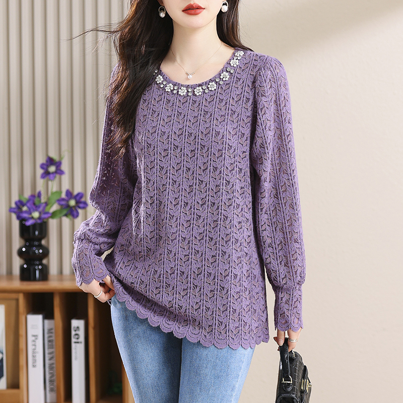 PF453#大码女装2024春季新款胖mm镶钻蕾丝衫洋气圆领长袖百搭打底上衣