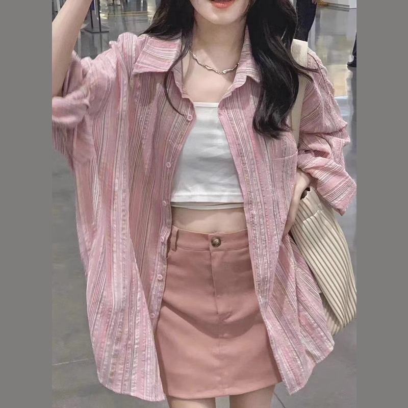 PF475#新款大码女装韩国chic粉色条纹衬衫设计感慵懒风防晒衬衣