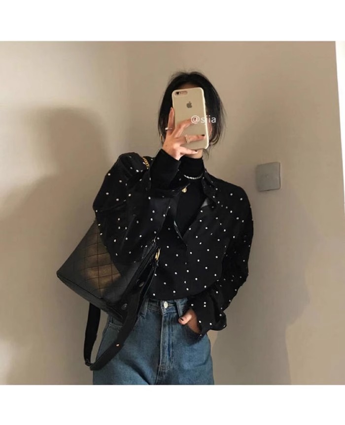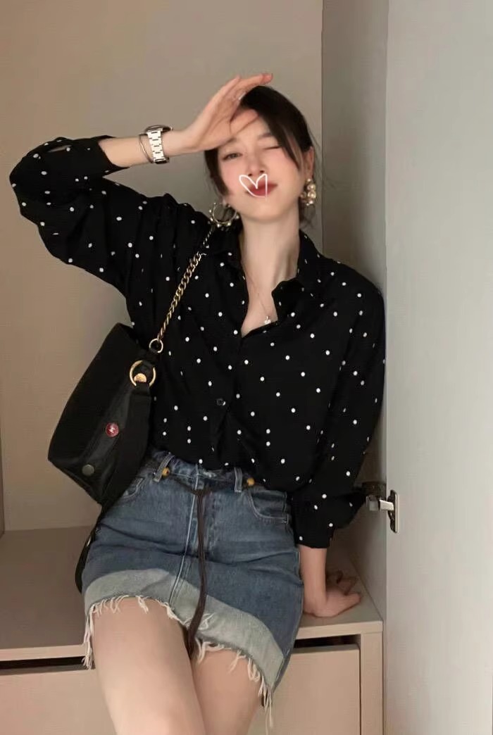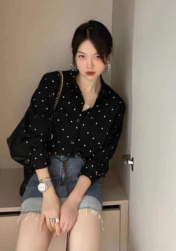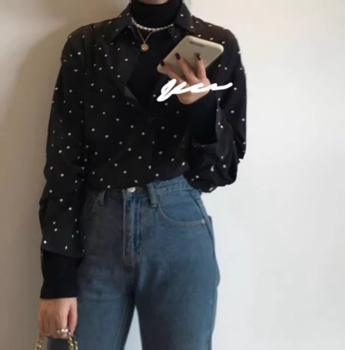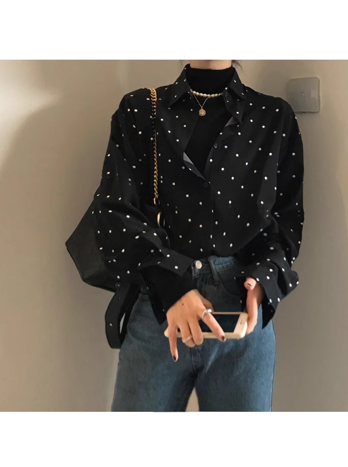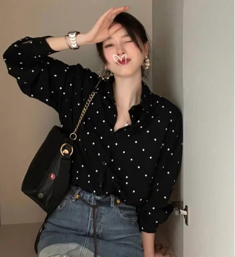PF476#大码女装韩国chic赫本风翻领撞色波点宽松百搭长袖衬衫