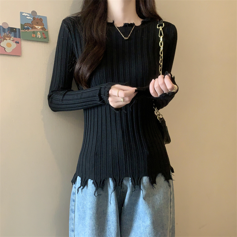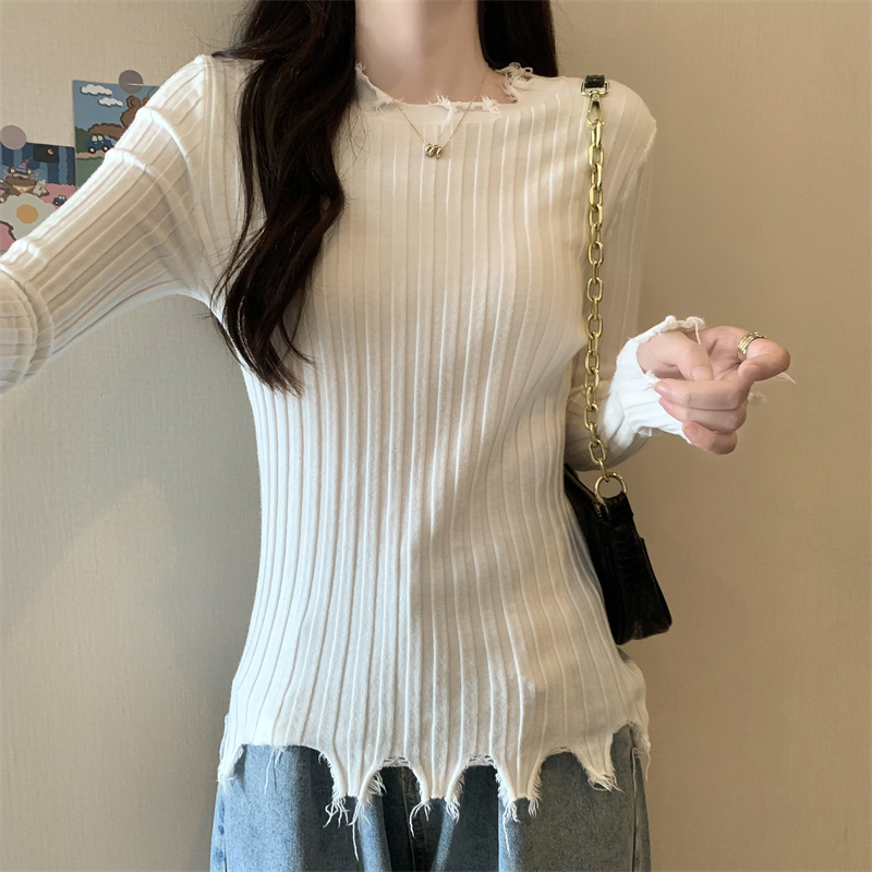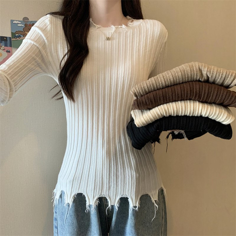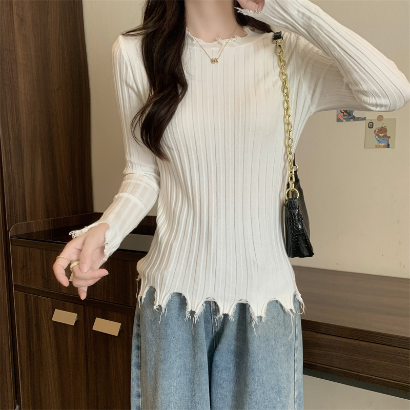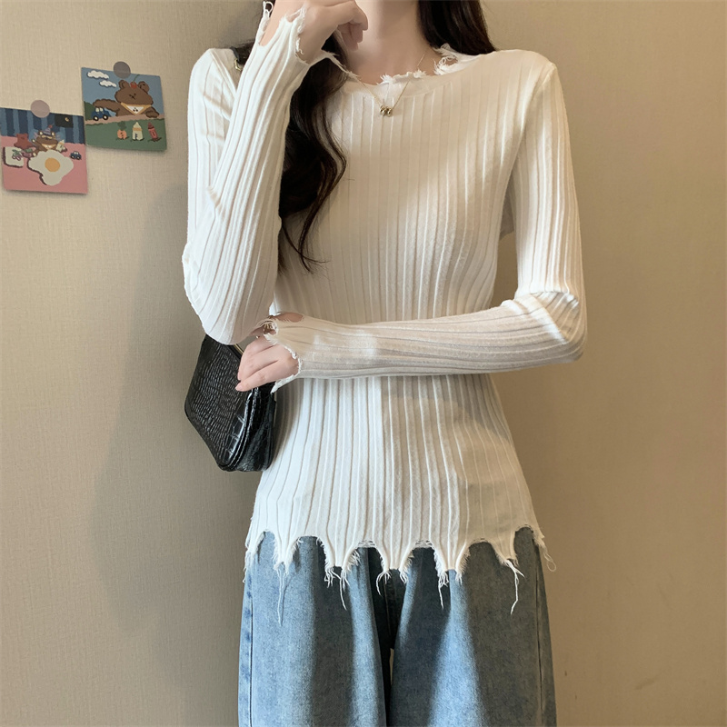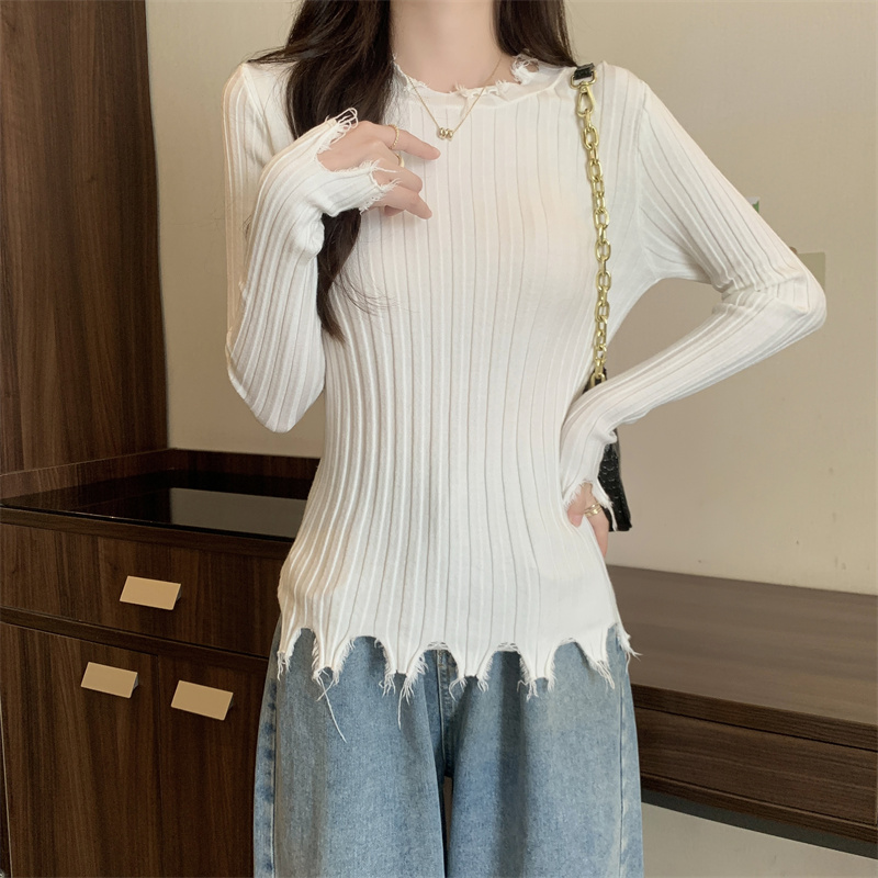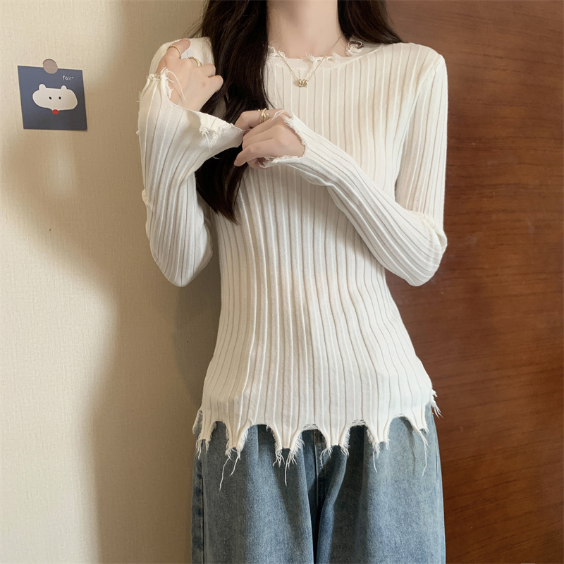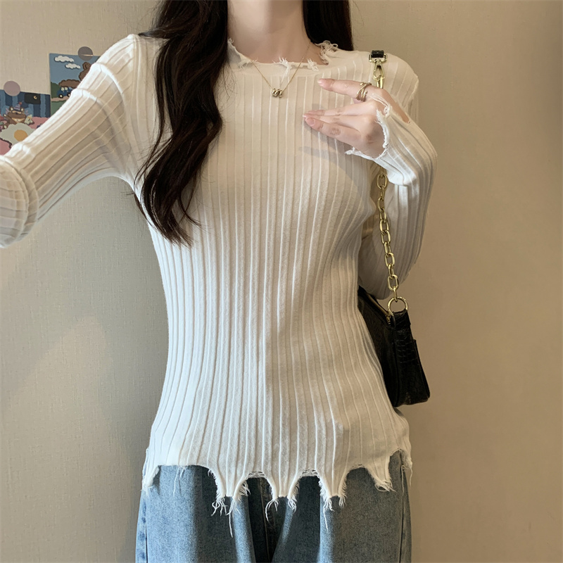 PF479#新品内搭显瘦针织打底衫不规则破洞长袖别到致上衣