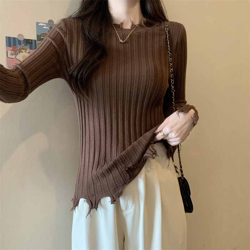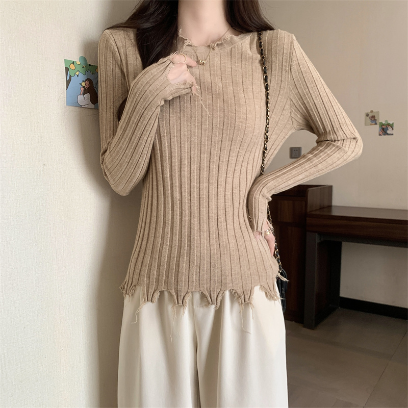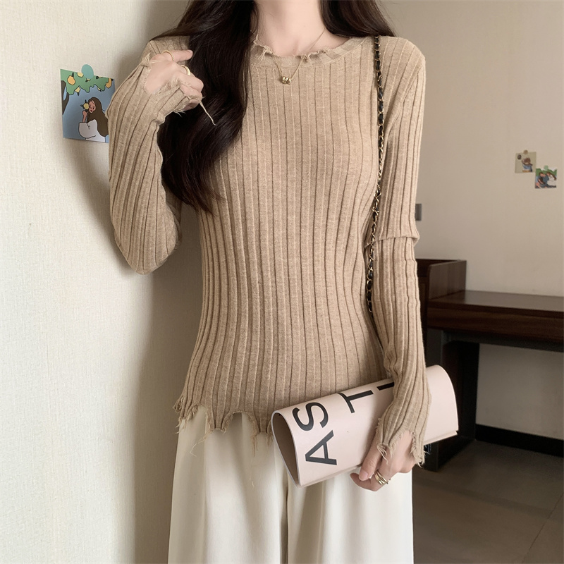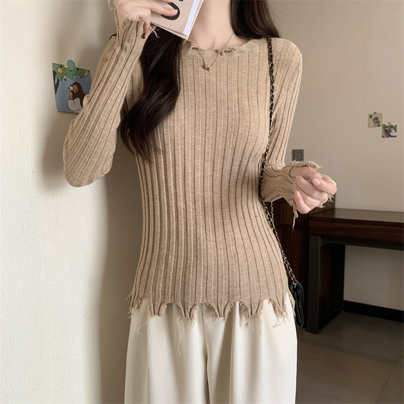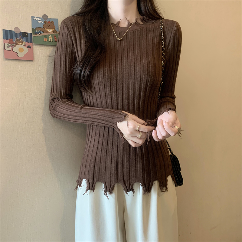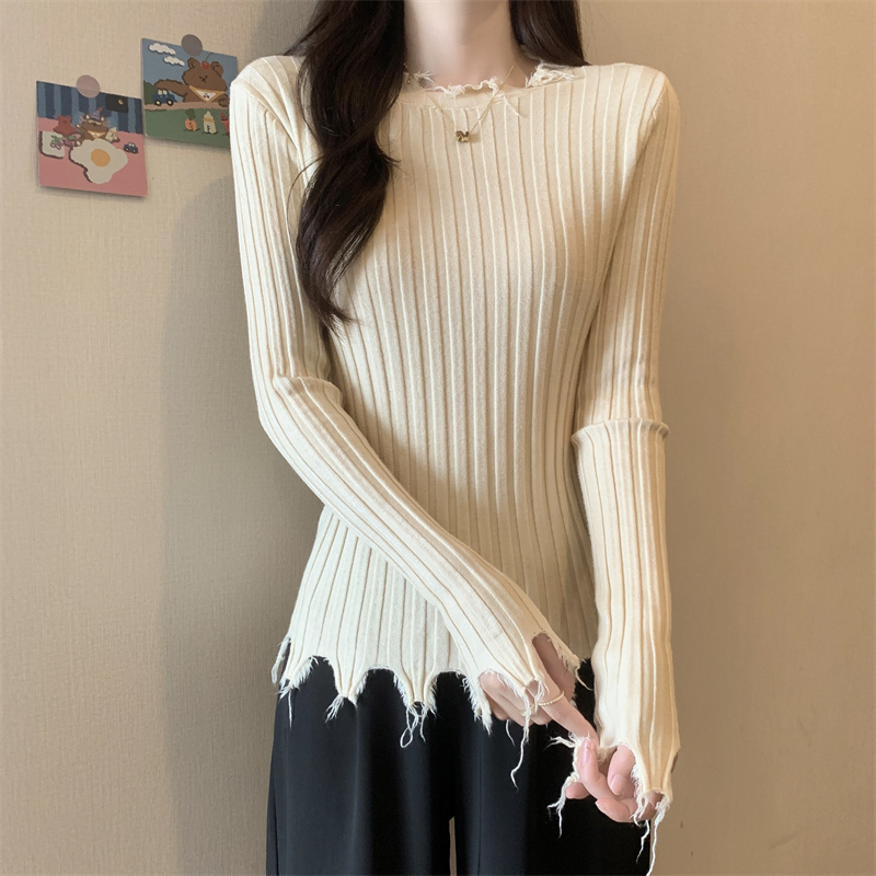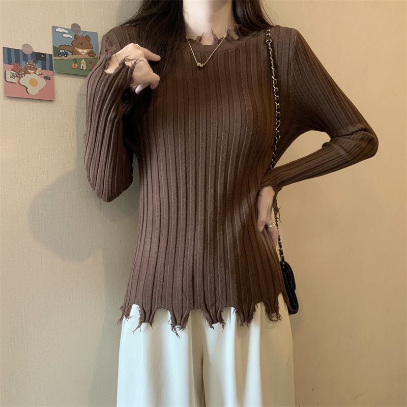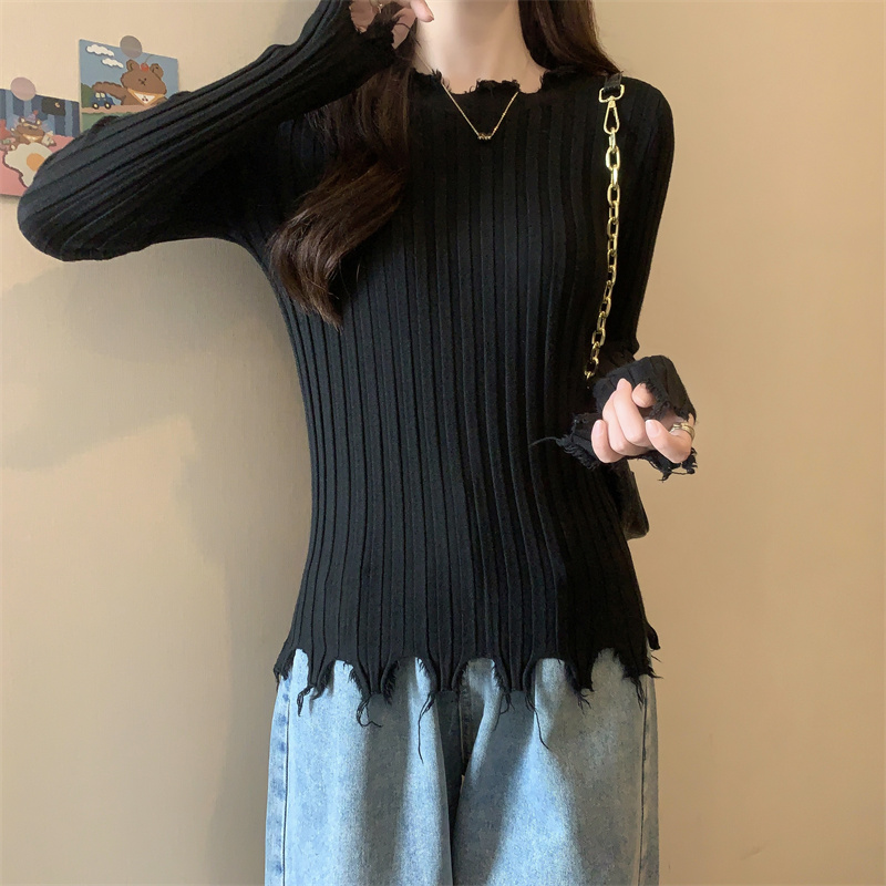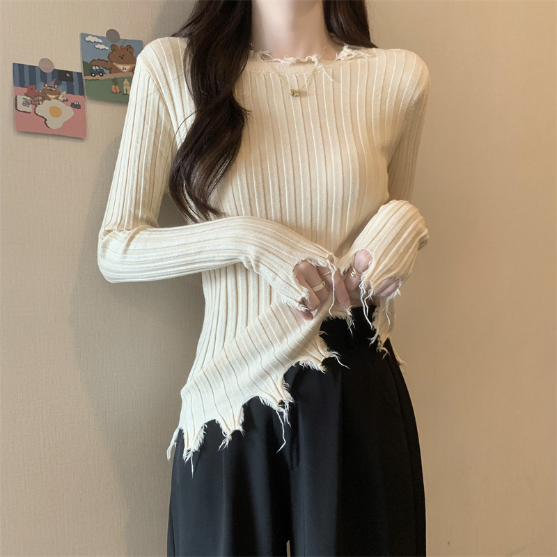 PF479#新品内搭显瘦针织打底衫不规则破洞长袖别到致上衣