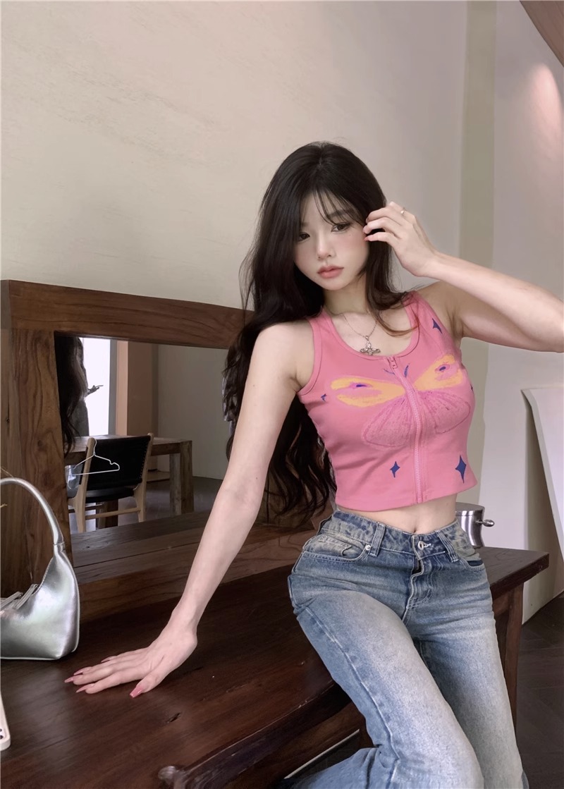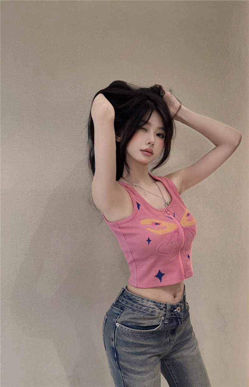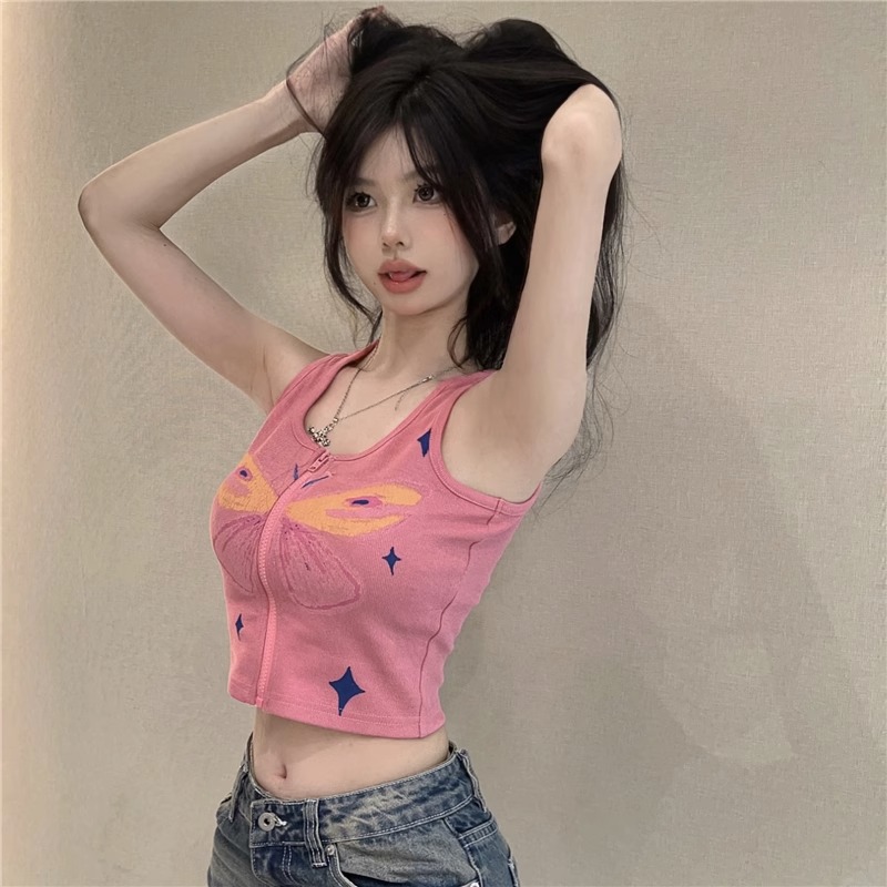 PF515#纯欲风粉红色开衫无袖小背心女夏ins修身t恤休闲运动短款露脐上衣