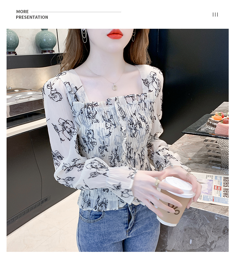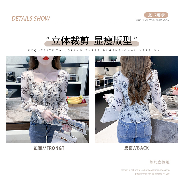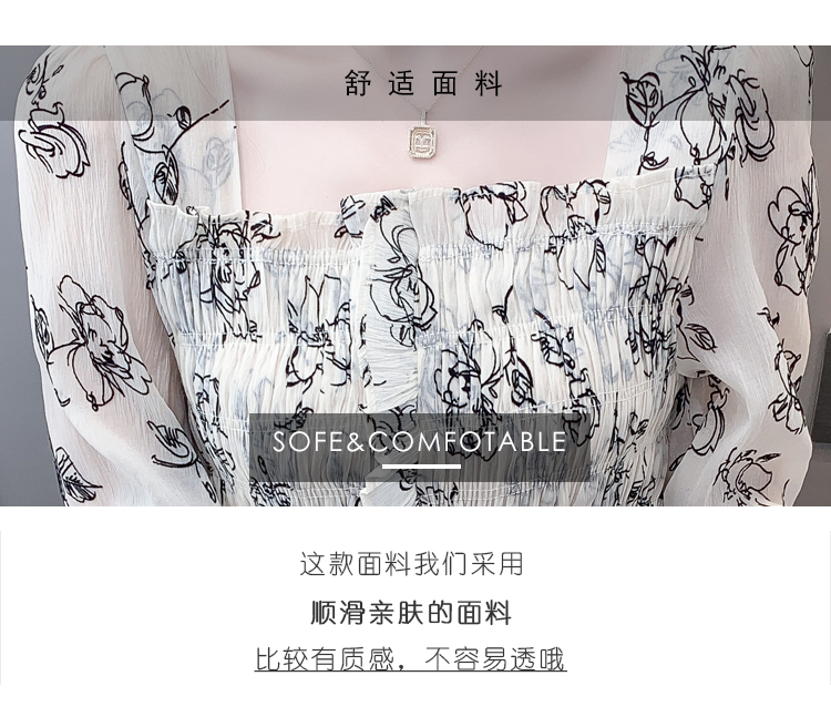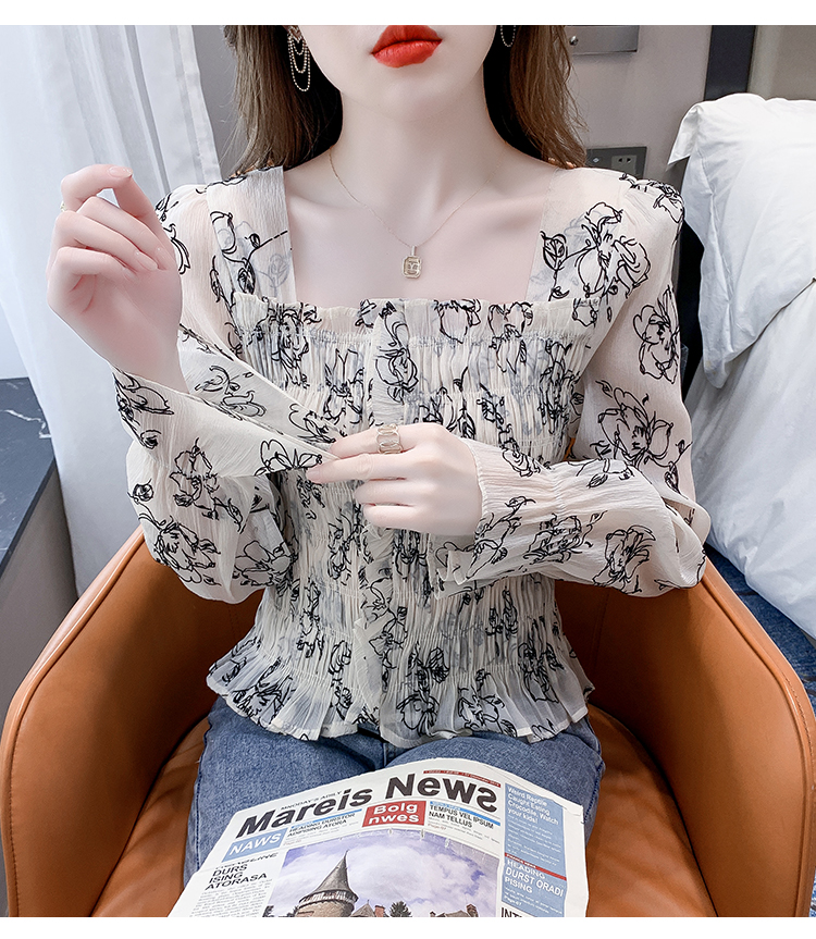 PF536#新款法式温柔甜美雪纺衬衫女花布长袖一字肩短款上衣