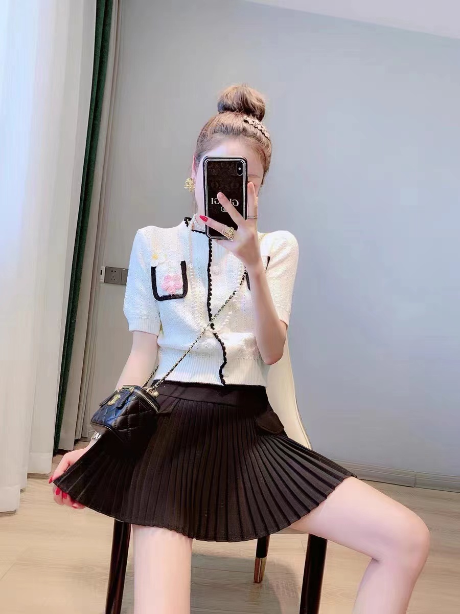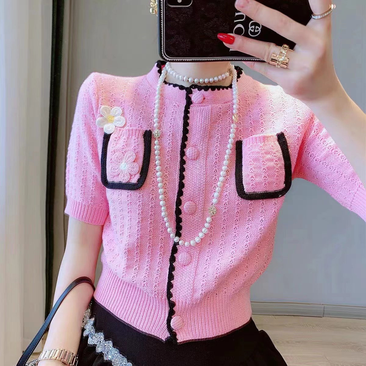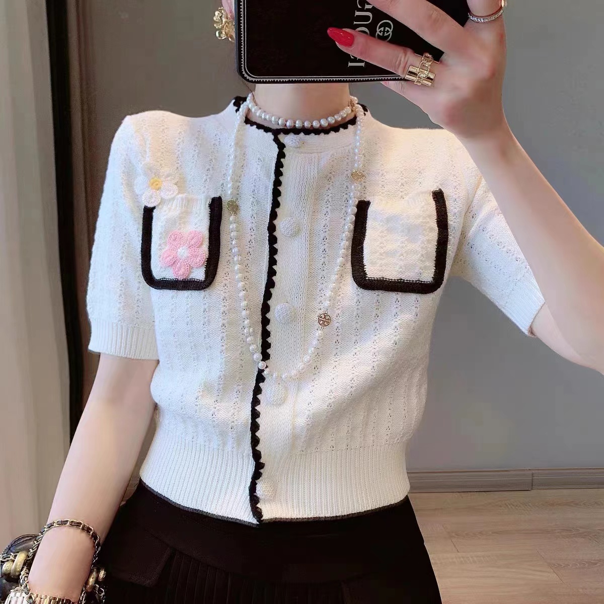 PF543#新款短袖圆领立体花朵镂空刺绣假口袋针织衫开衫上衣女薄