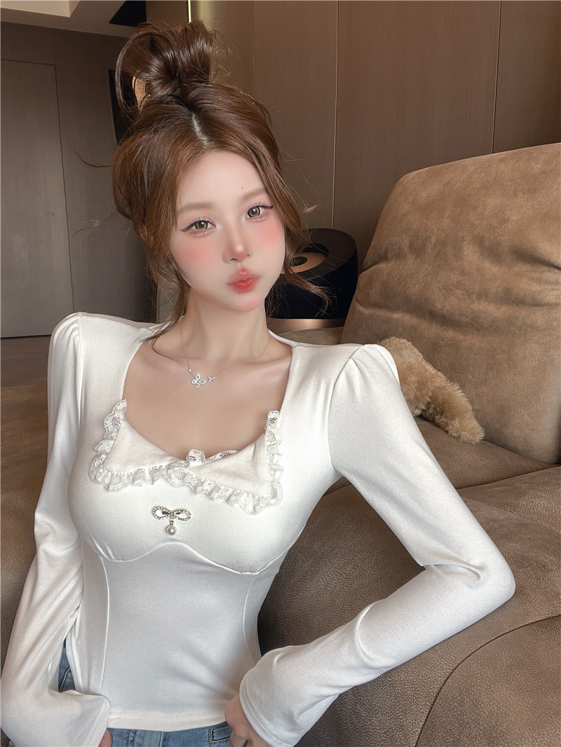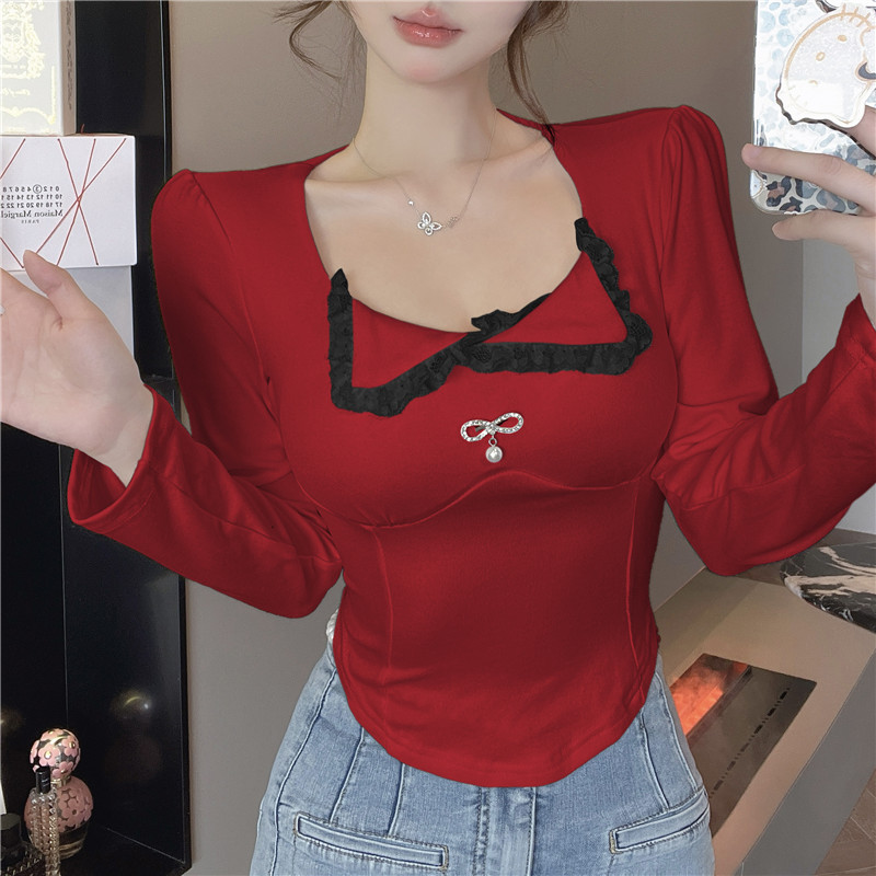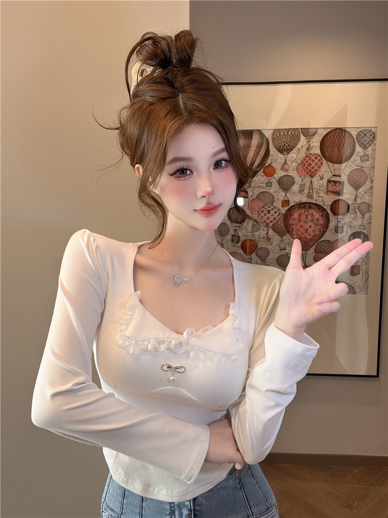 PF563#蕾丝翻领长袖打底衫t恤显瘦辣妹短款纯棉上衣女