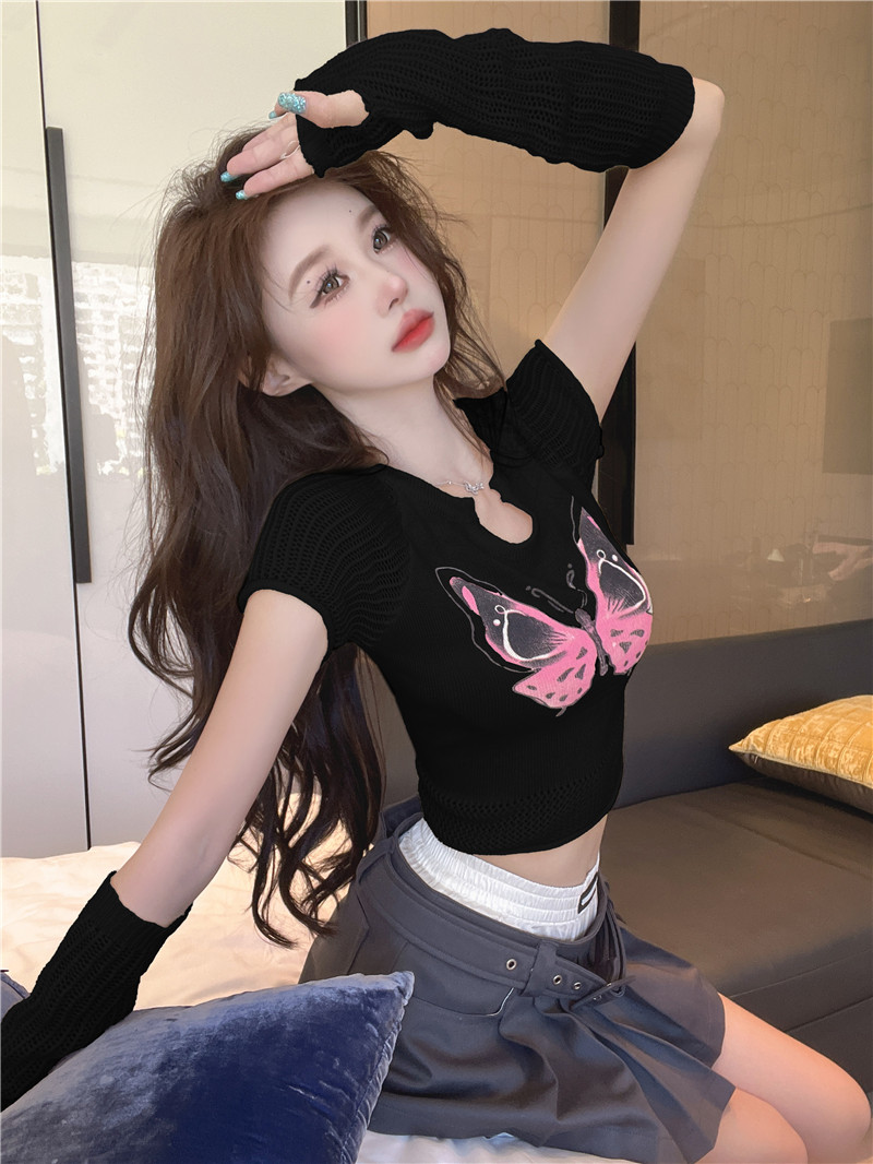 PF566#新款纯欲甜酷辣妹蝴蝶印花两穿短款针织上衣女配袖套
