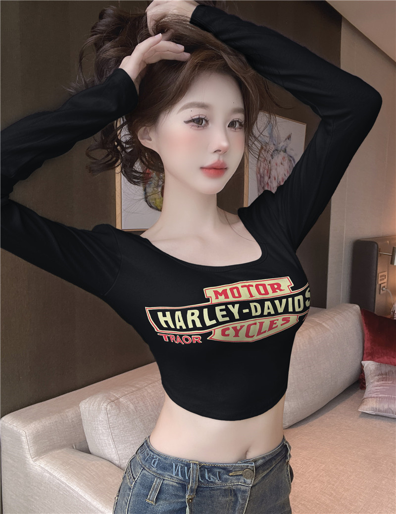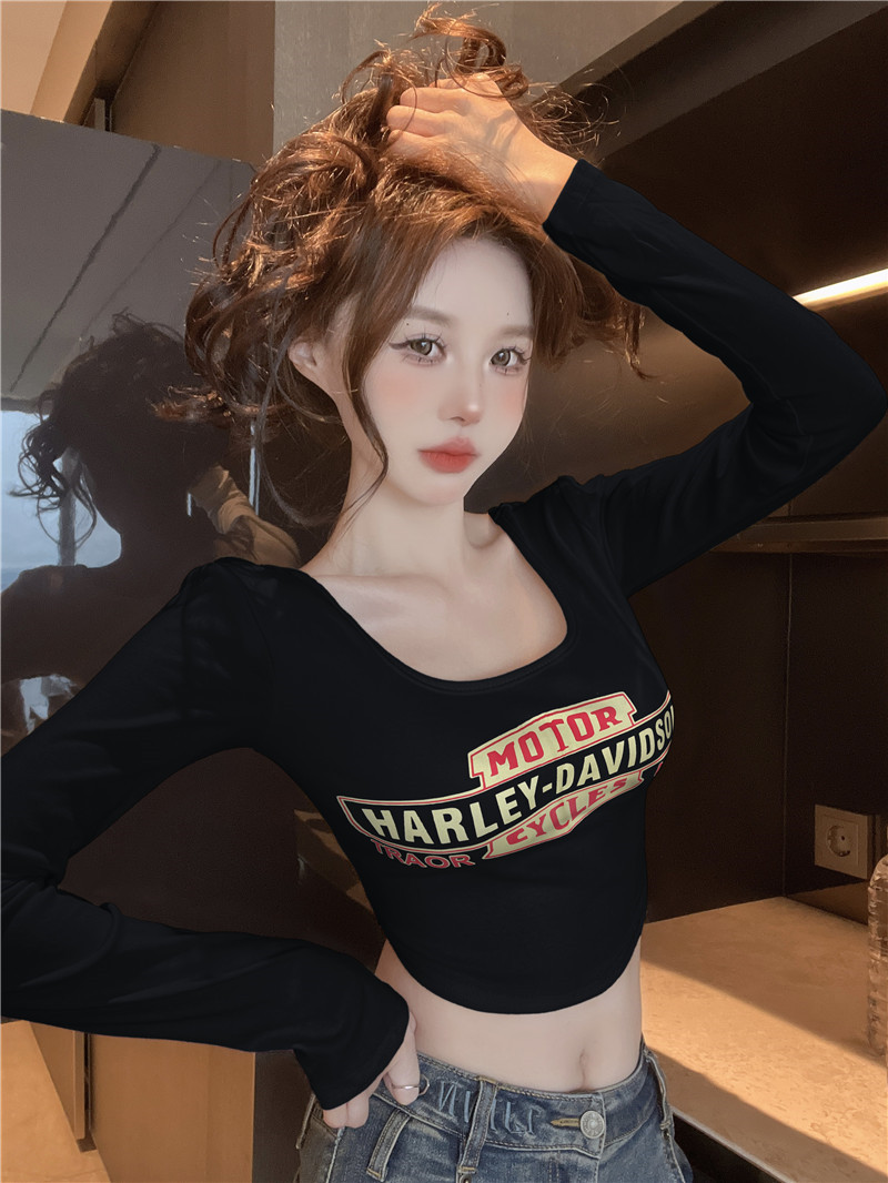 PF568#方领修身显瘦字母印花纯棉t恤复古正肩长袖上衣女