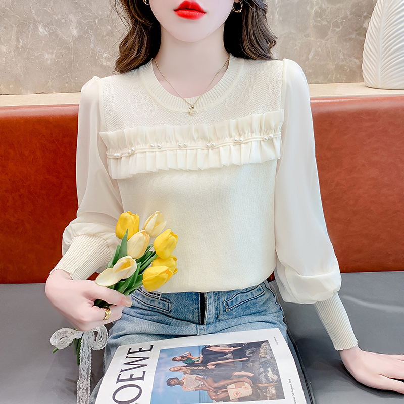PF570#时尚圆领珍珠冰爽丝拼接法式网纱拼接雪纺袖上衣