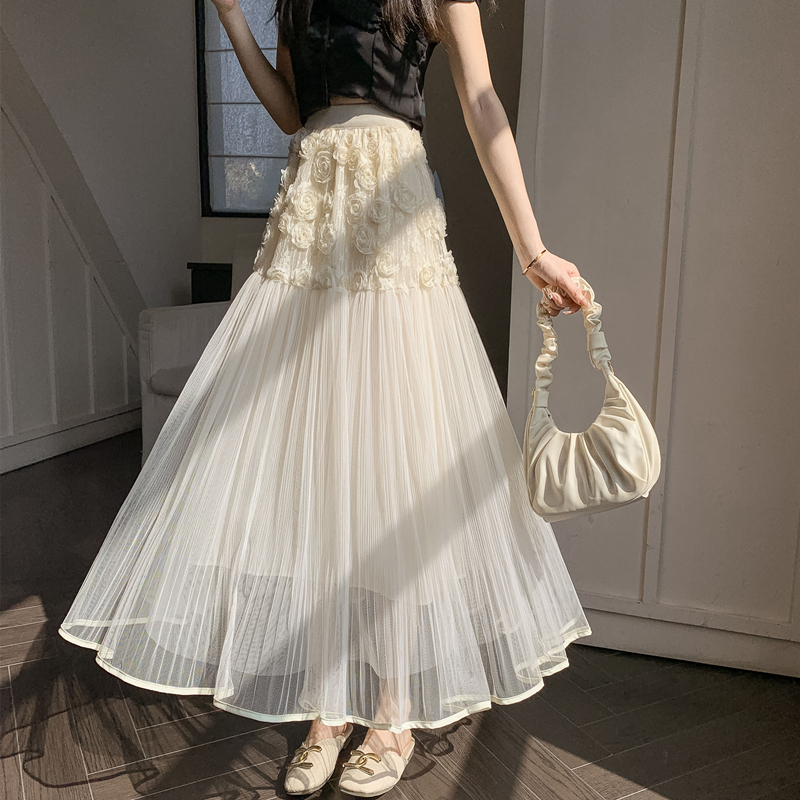 PF612#新款法式复古设计感重工立体花朵大摆高腰网纱半身裙