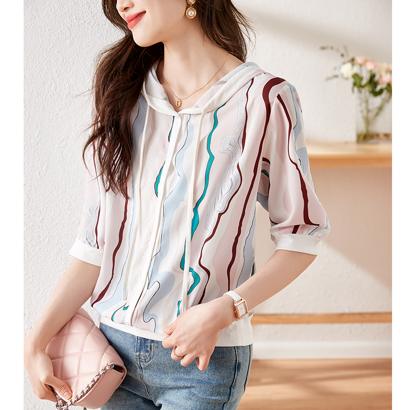 PF628#高端韩国丝印花2024夏季新款连帽条纹半袖防晒外搭上衣