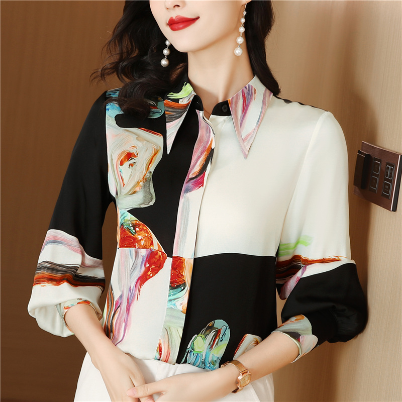 PF634#真丝衬衫时尚女装重磅桑蚕丝印花长袖上衣宽松百搭花衬衣