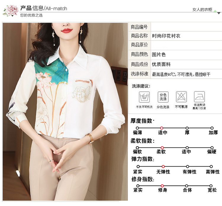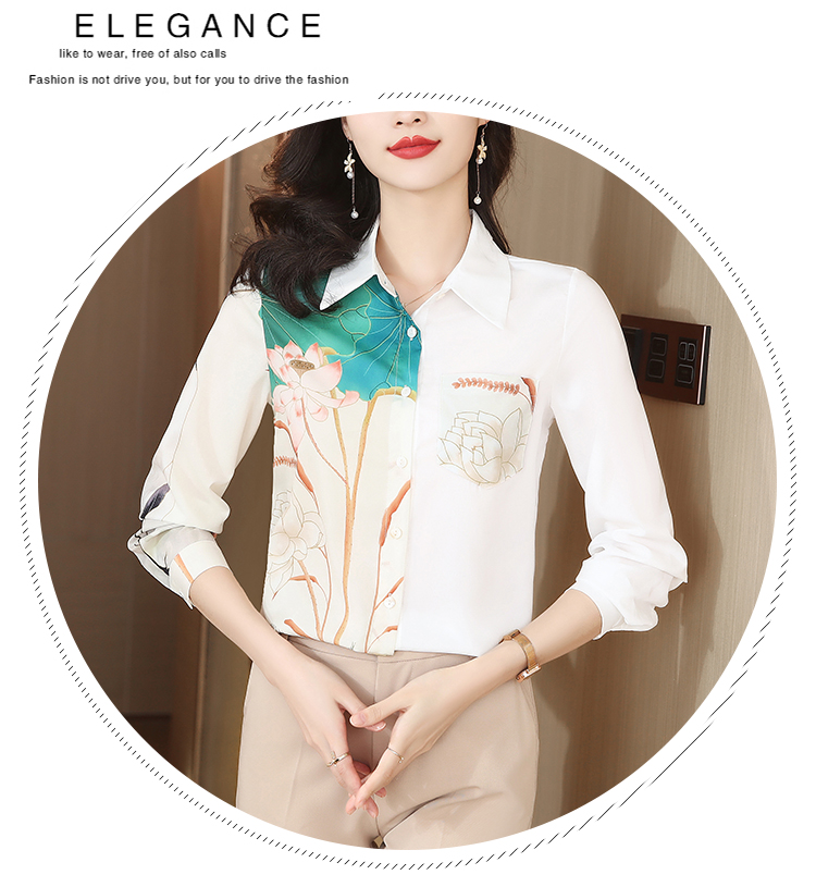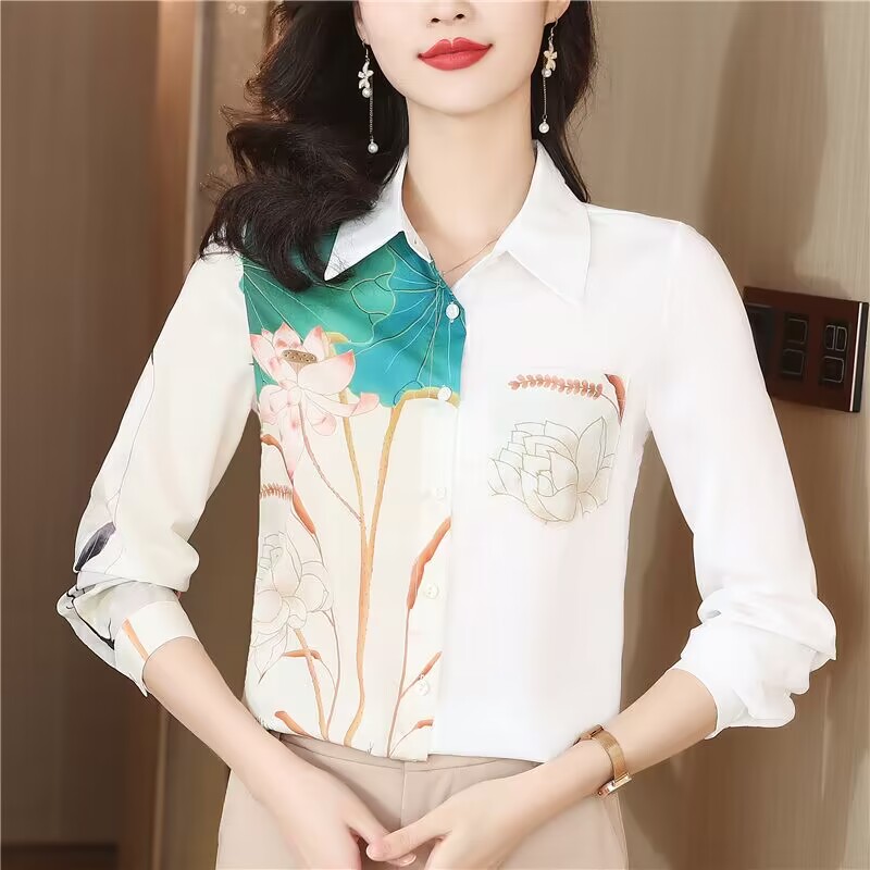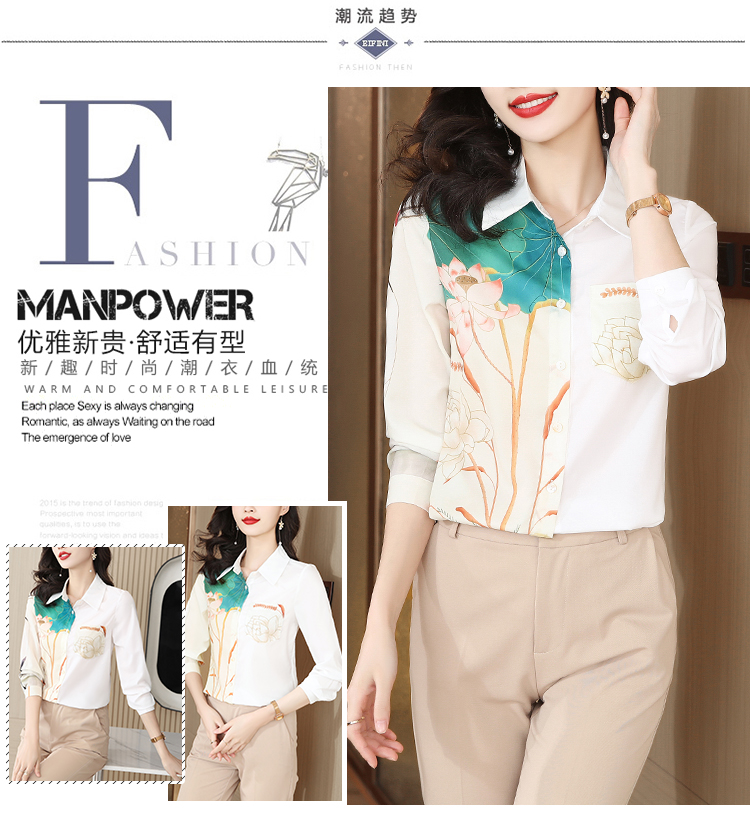 PF641#高级感中国风雪纺衫女春装新款长袖印花拼接衬衫女遮肚子百搭衬衣