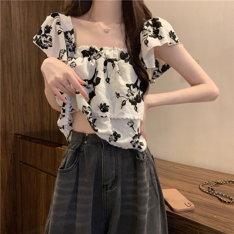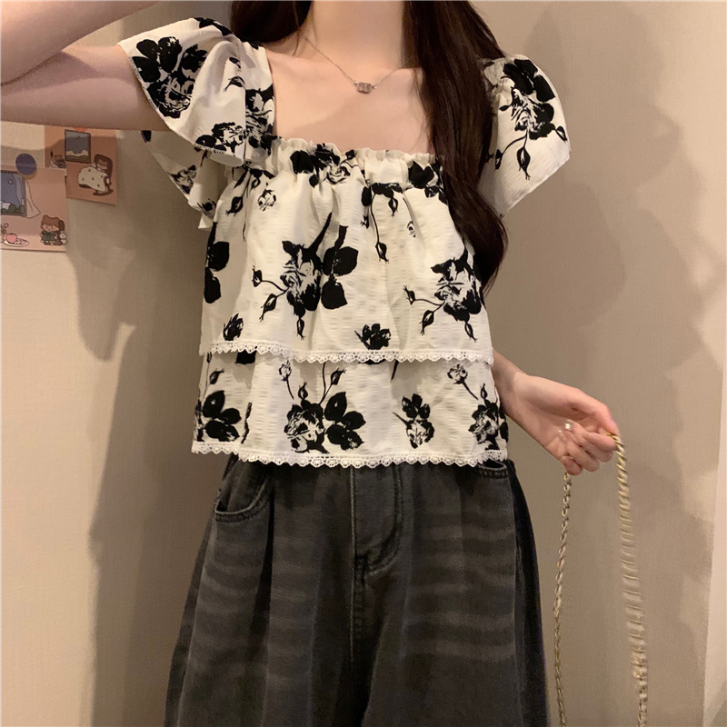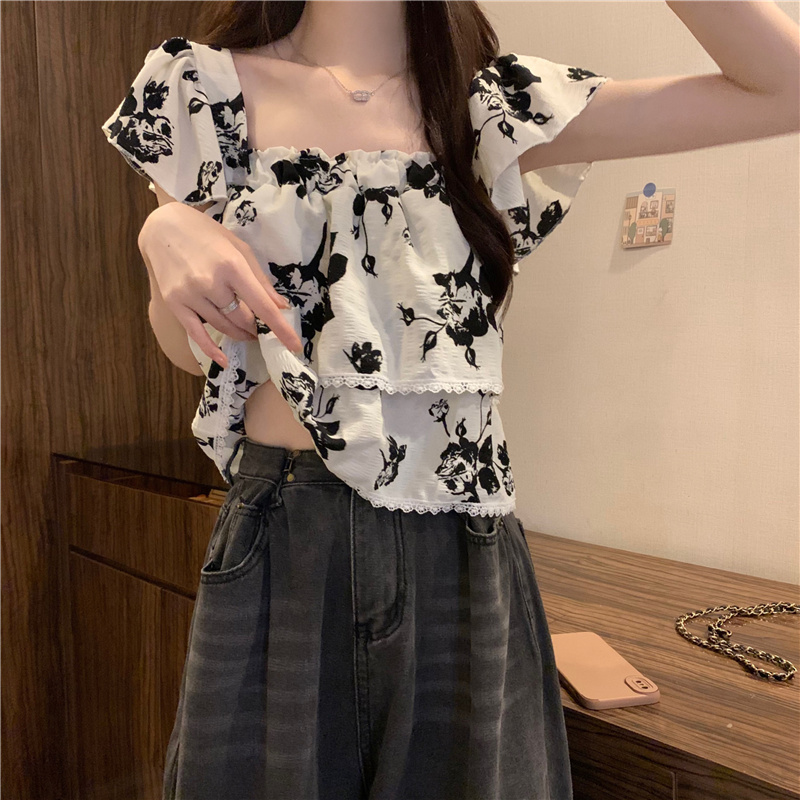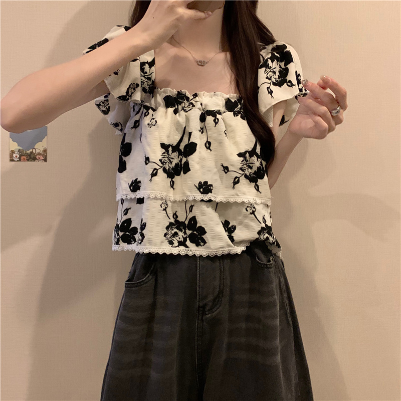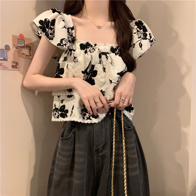 PF664#新款韩版夏季百搭宽松小众设计感方领短款衬衫上衣女