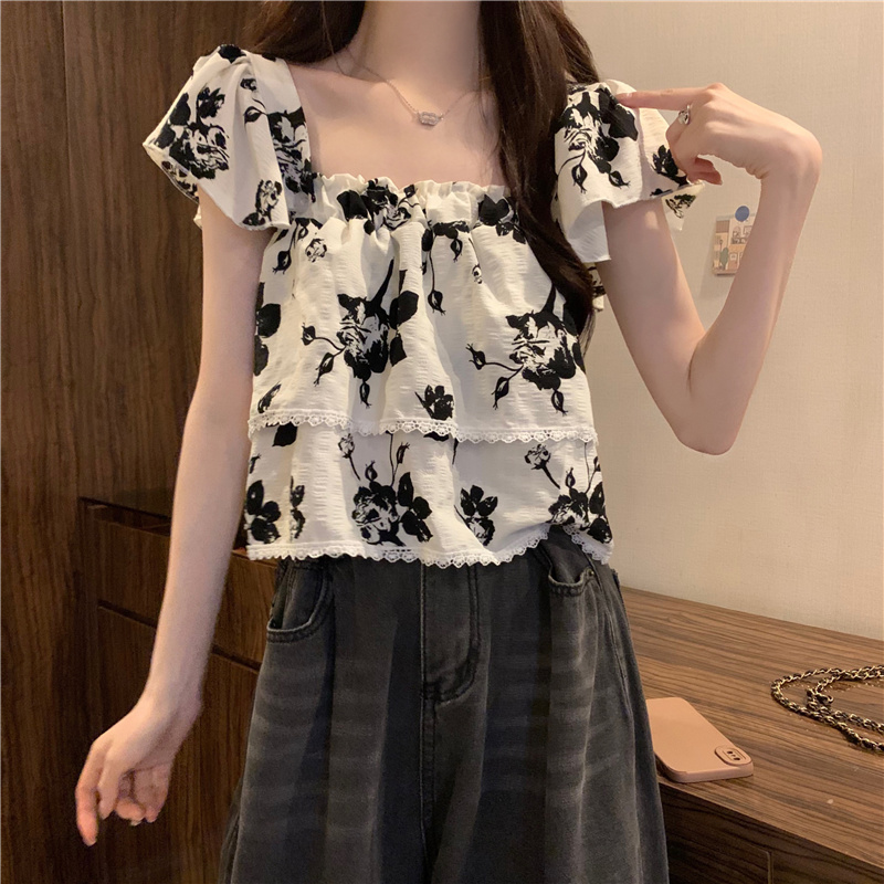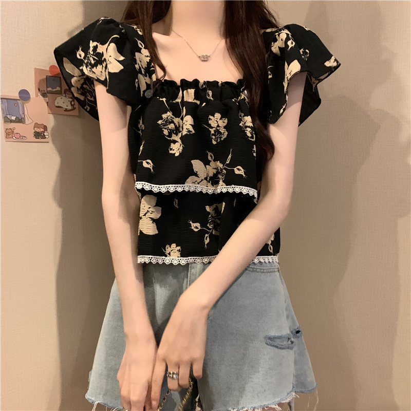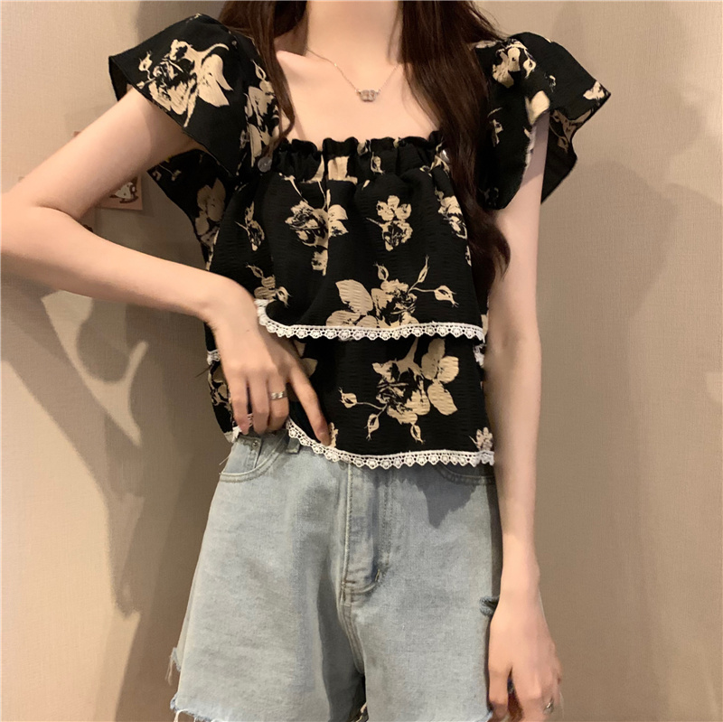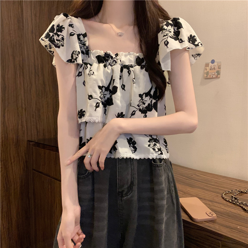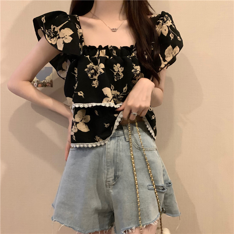 PF664#新款韩版夏季百搭宽松小众设计感方领短款衬衫上衣女
