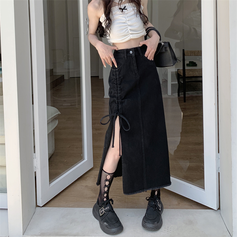 PF673#新款牛仔半身裙女大码高腰显瘦小众设计感系带开叉中长A字裙