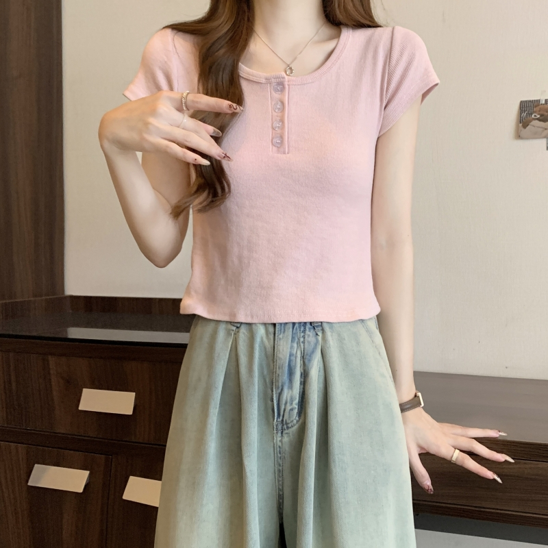 PF701#40支纯棉短袖T恤女2024年韩版新款修身短款纽扣轻熟纯色上衣