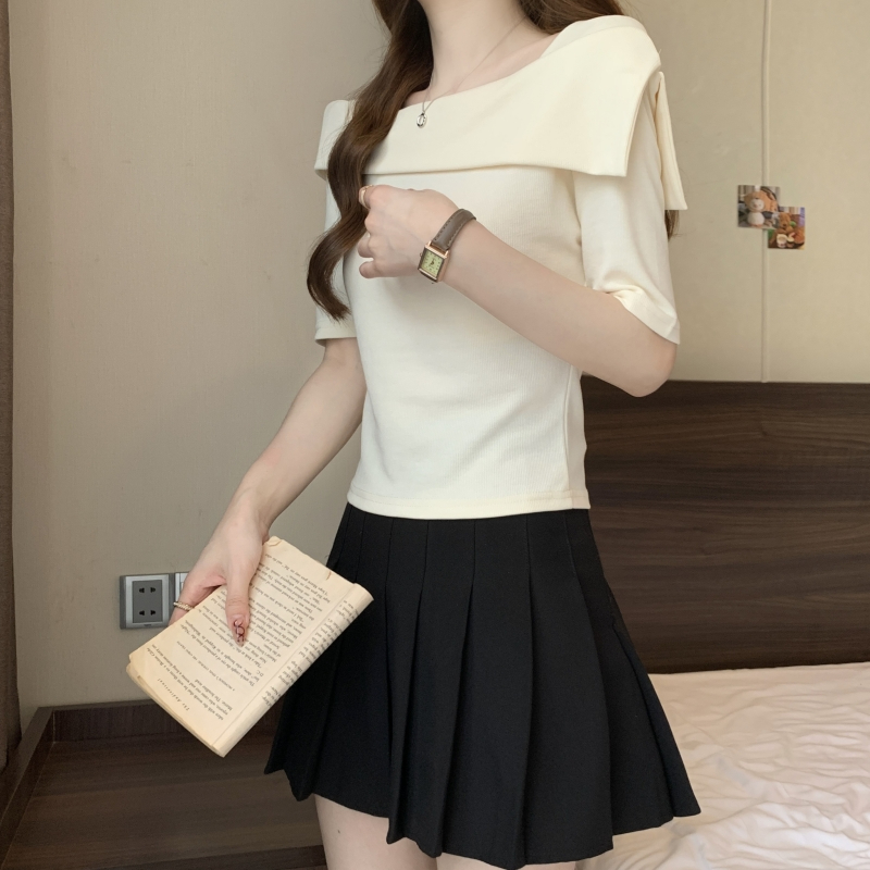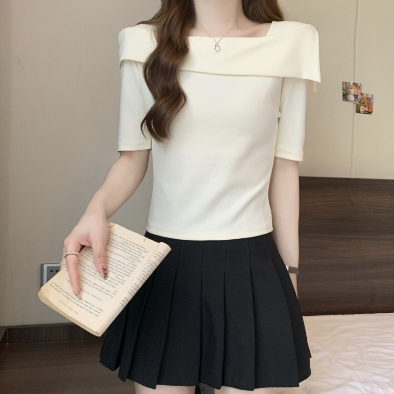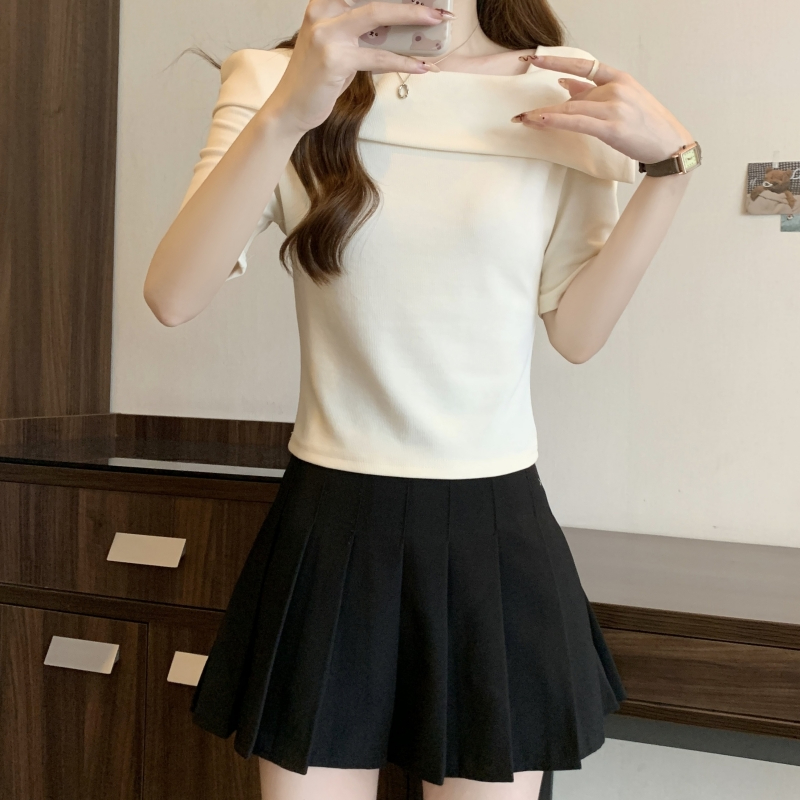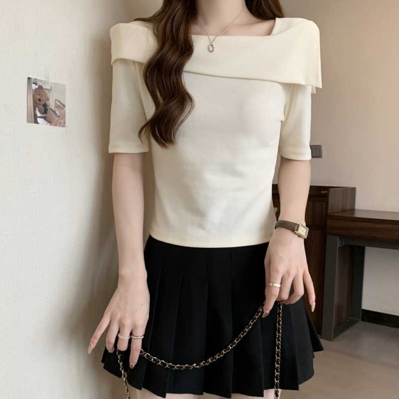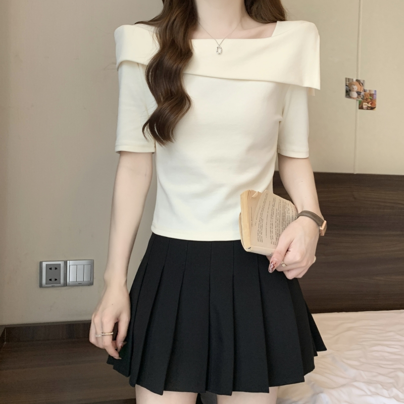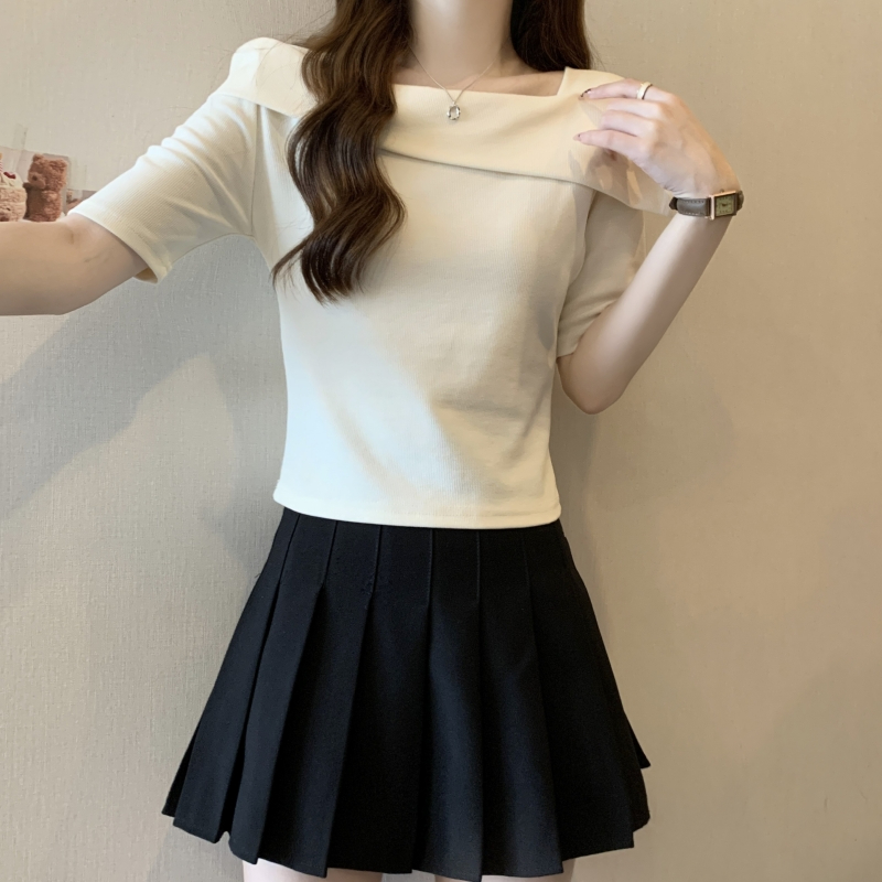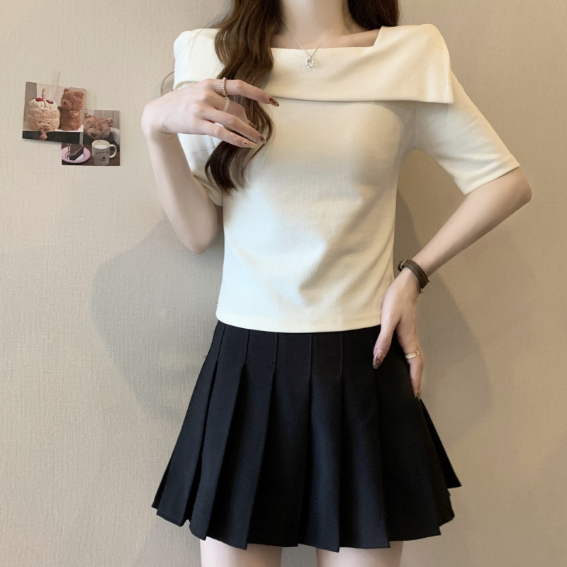 PF702#纯棉短袖t恤女2024夏季韩版新款一字肩别致露锁骨轻奢上衣