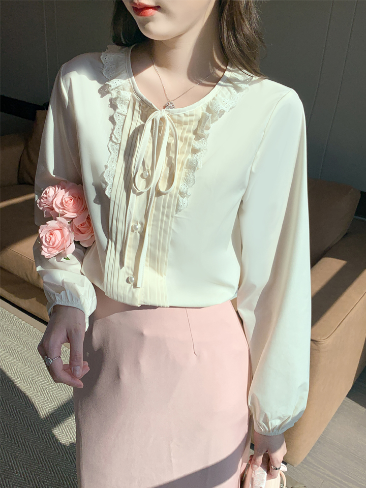 PF714#新款法式小众设计上衣春装女刺绣木耳边高级感长袖衬衫