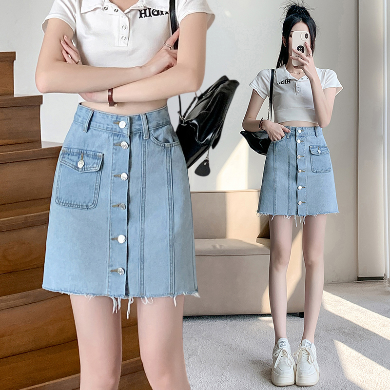PF766#牛仔短裙高腰A字裙2024年春韩国新款单排扣简约半身裙女夏季