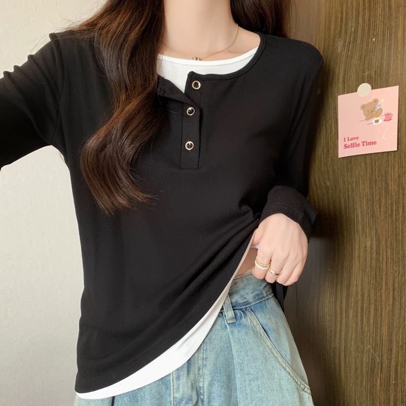 PF848#新款小排扣纯色宽松显瘦上衣圆领黑白假两件长袖T恤女