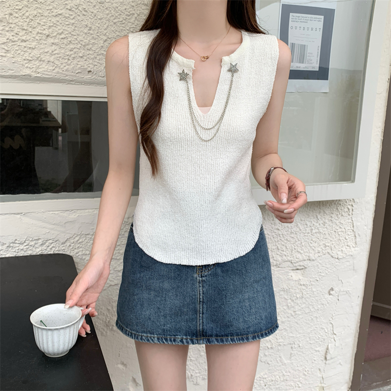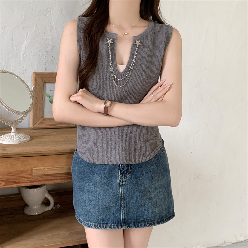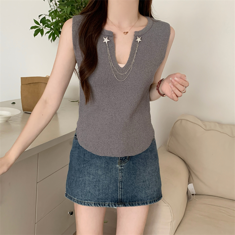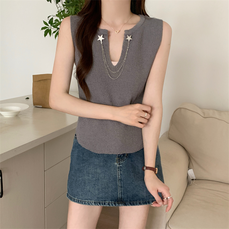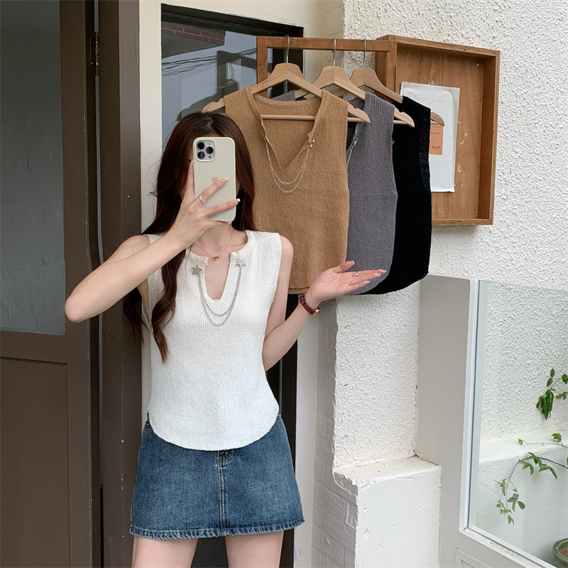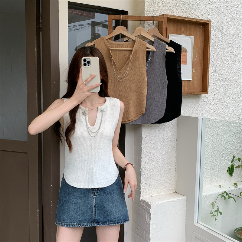 PF969#韩版小众链条设计感休闲纯色无袖背心短款针织上衣女