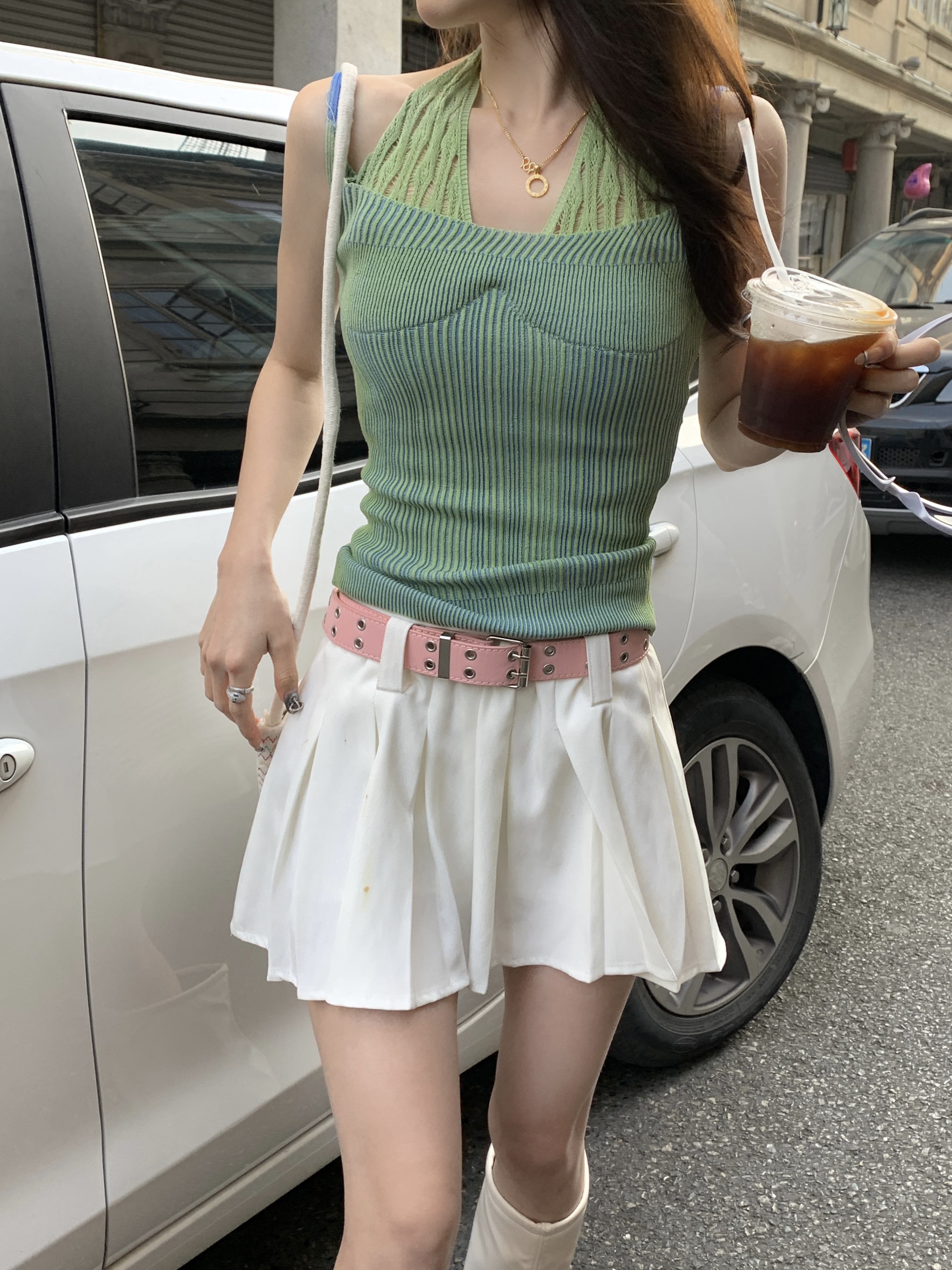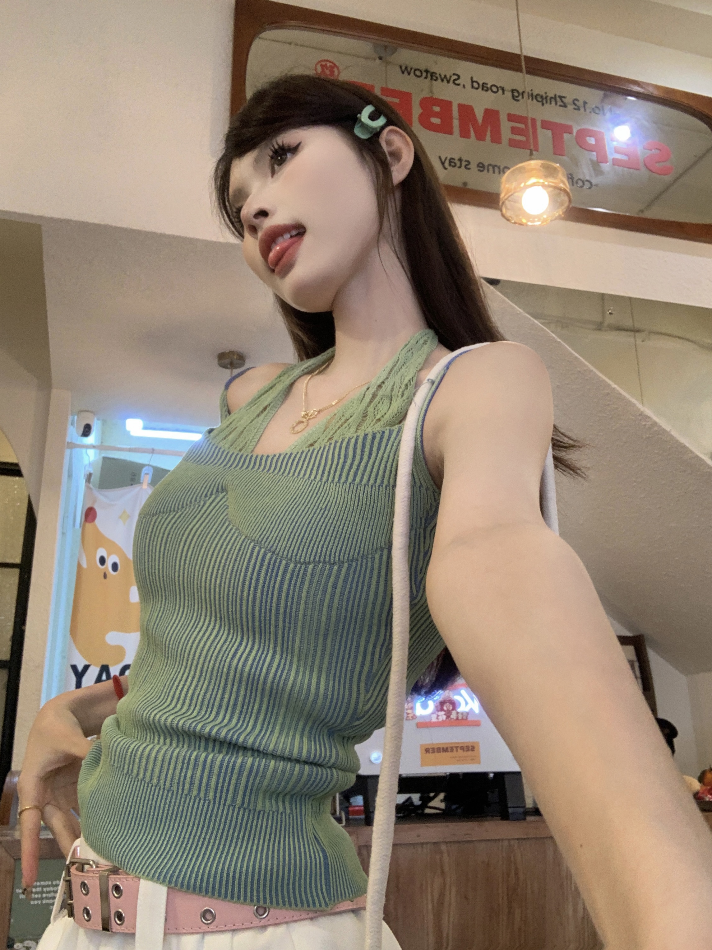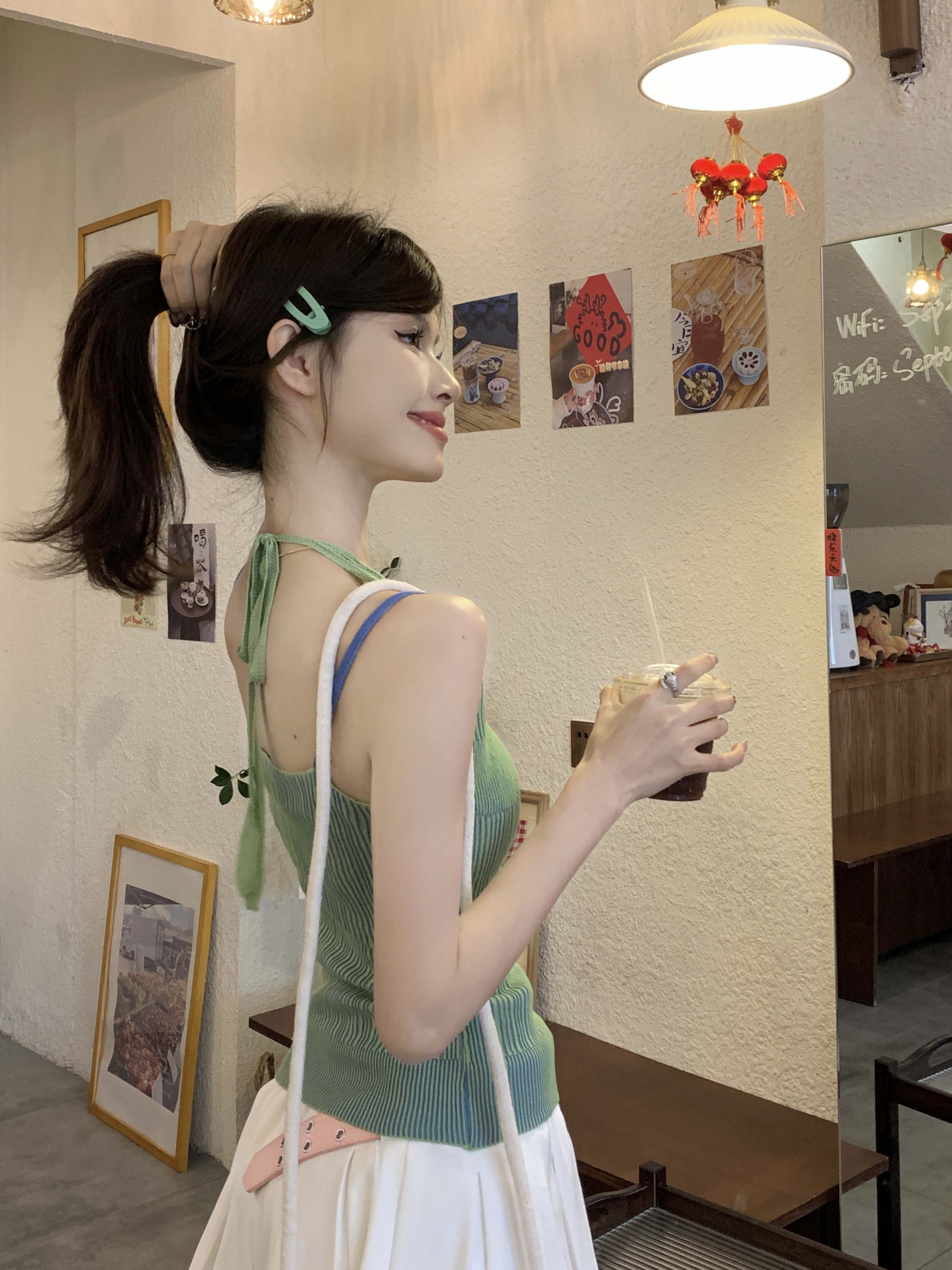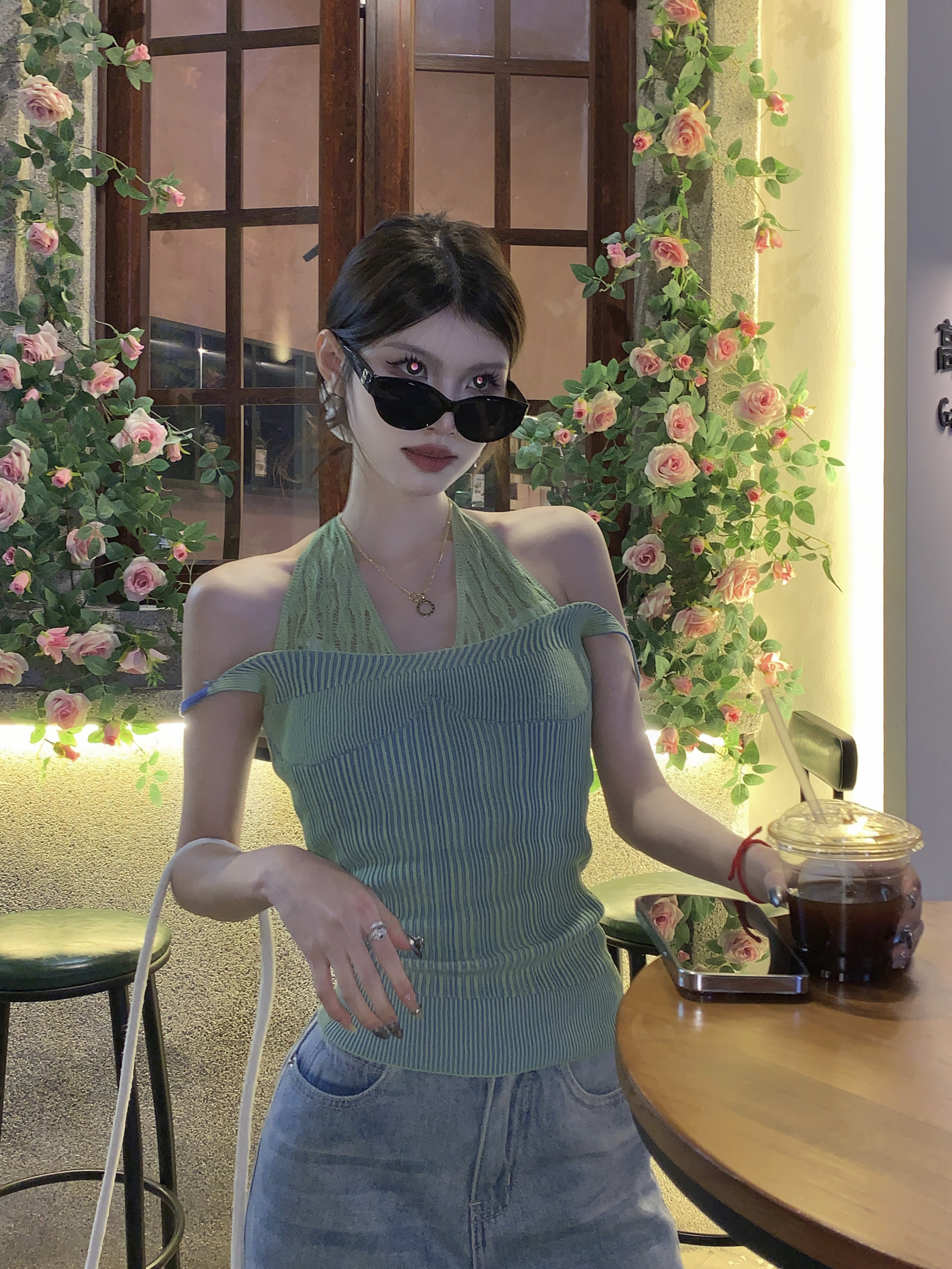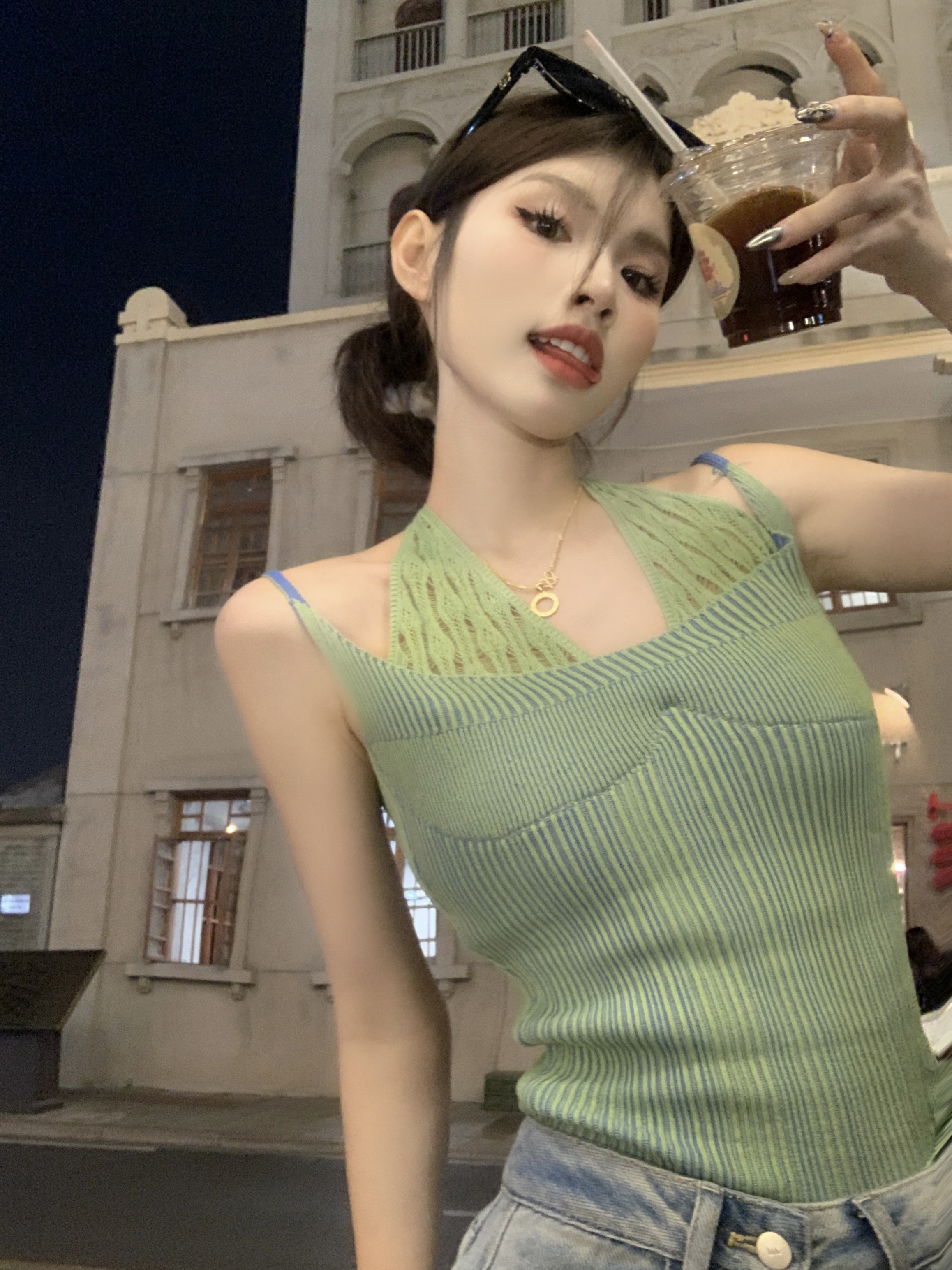 PF1014#假两件条纹针织挂脖吊带小背心女甜辣设计感小众外穿上衣