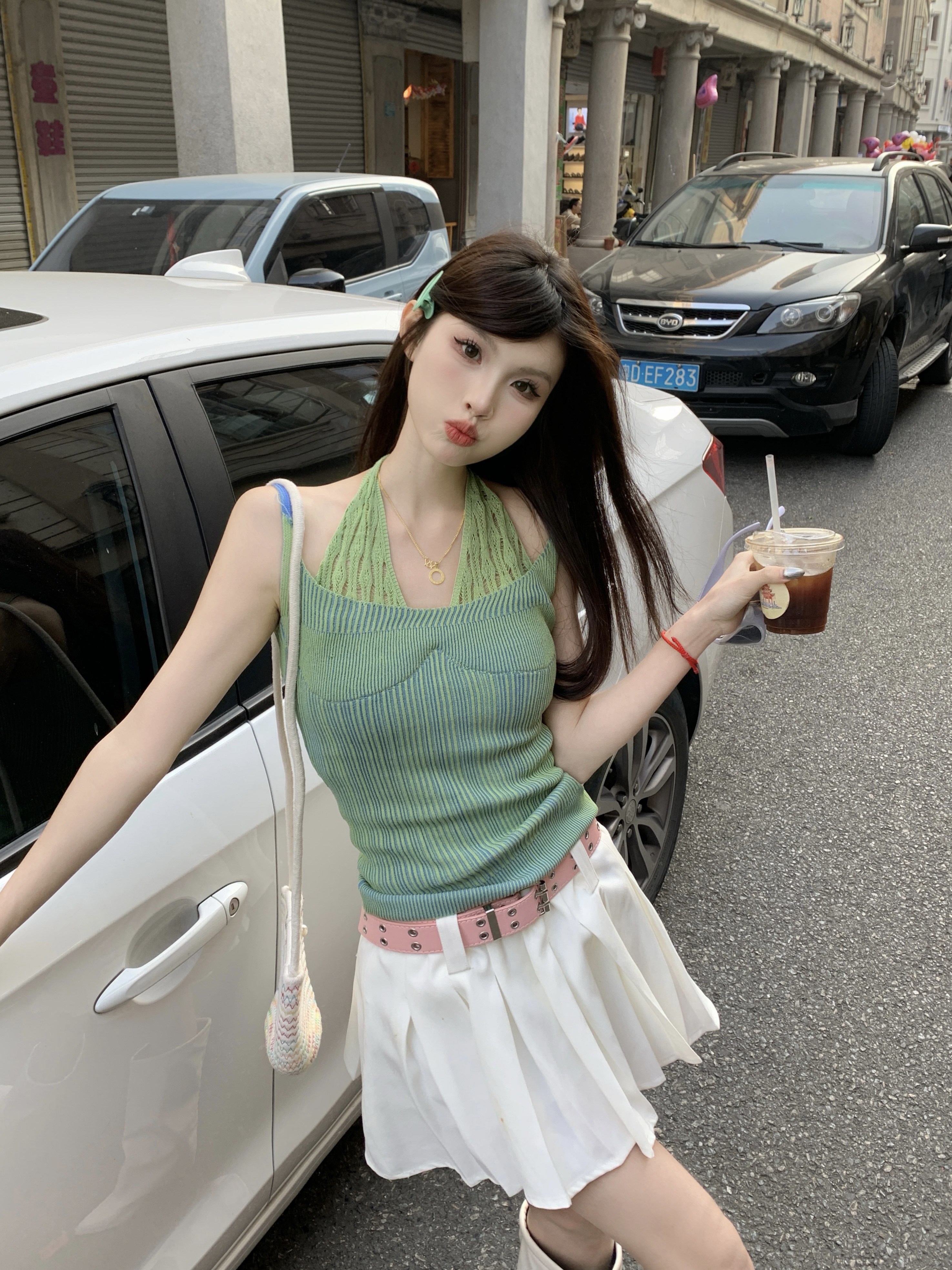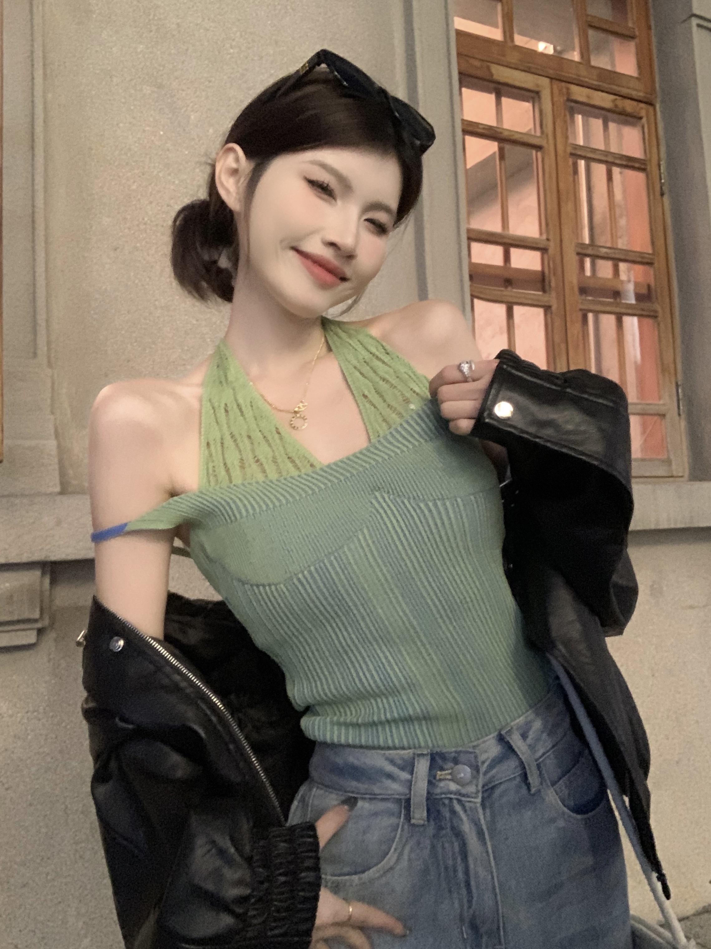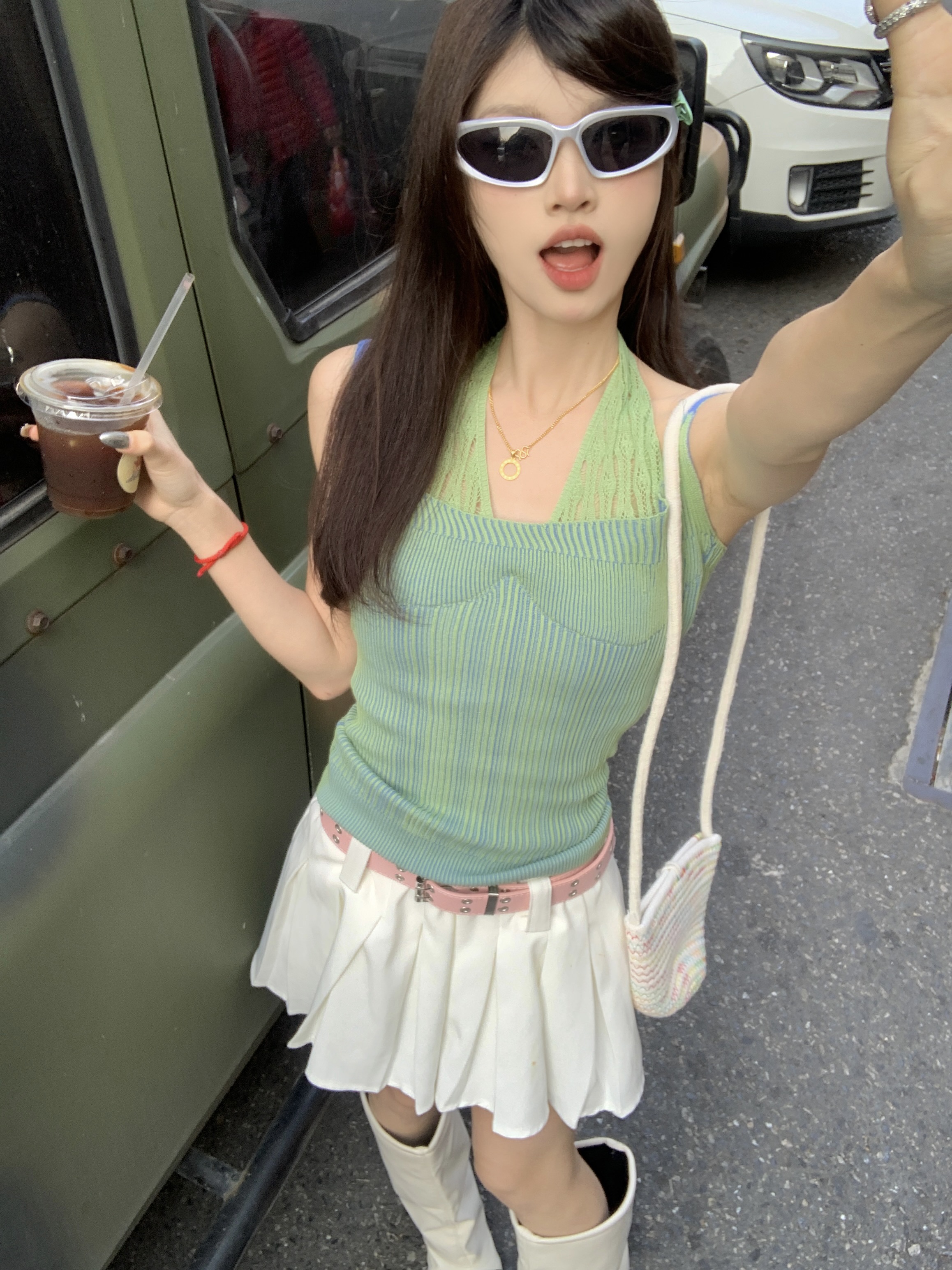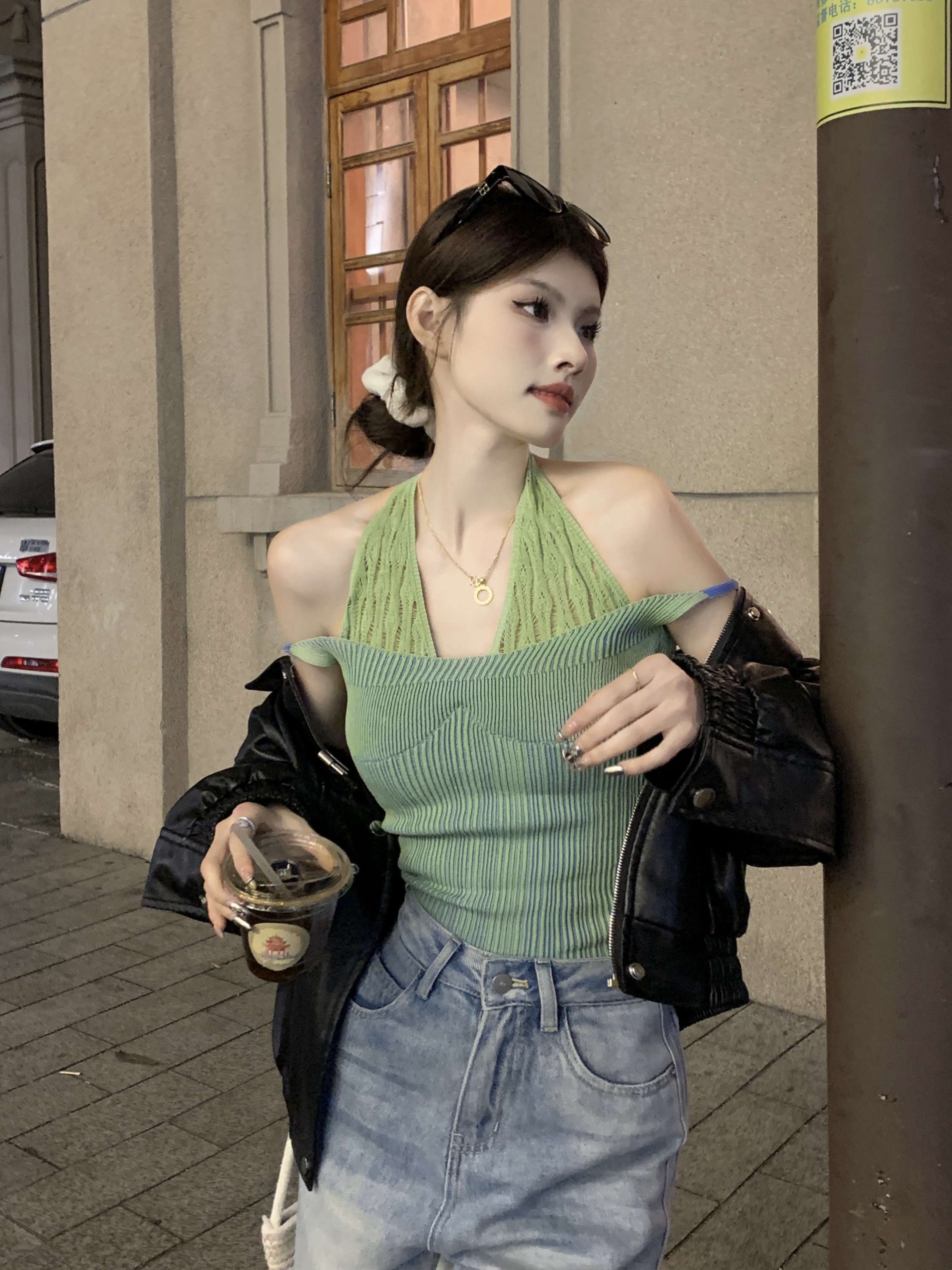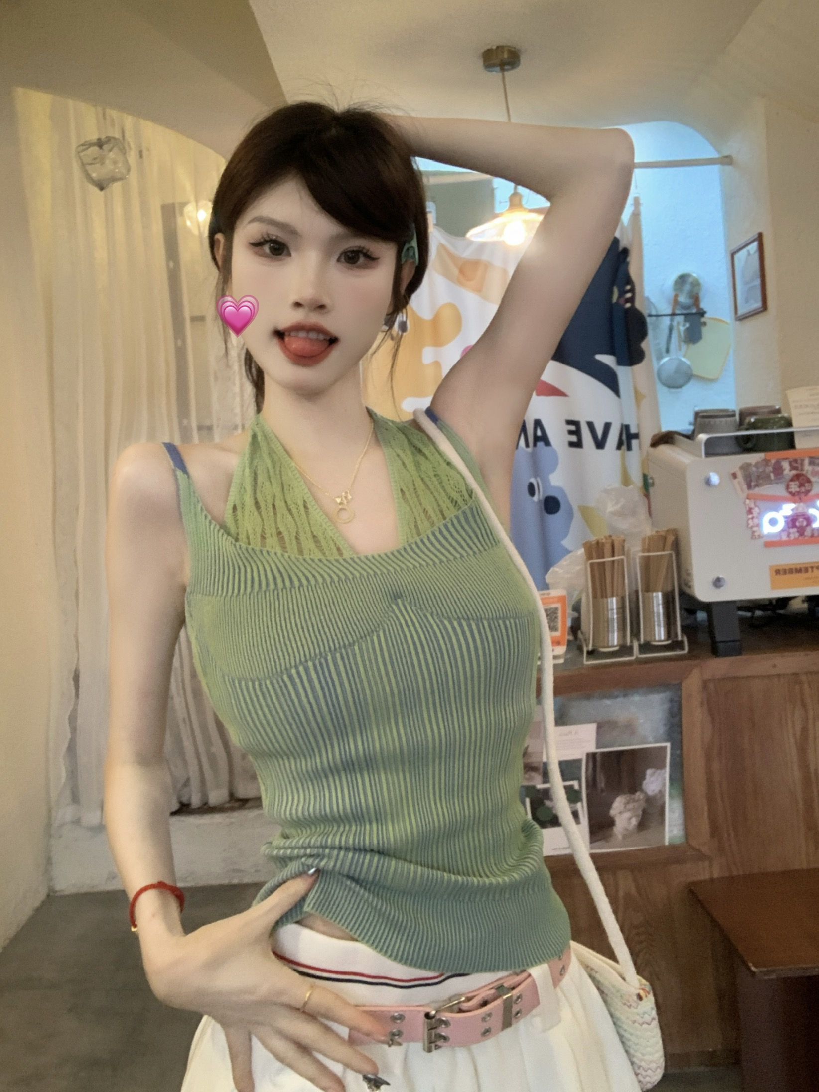 PF1014#假两件条纹针织挂脖吊带小背心女甜辣设计感小众外穿上衣
