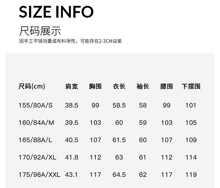 因裁剪工艺和丈量手法不同,可能存在1~3CM 左右误差,尺码仅供参考,以实物为准