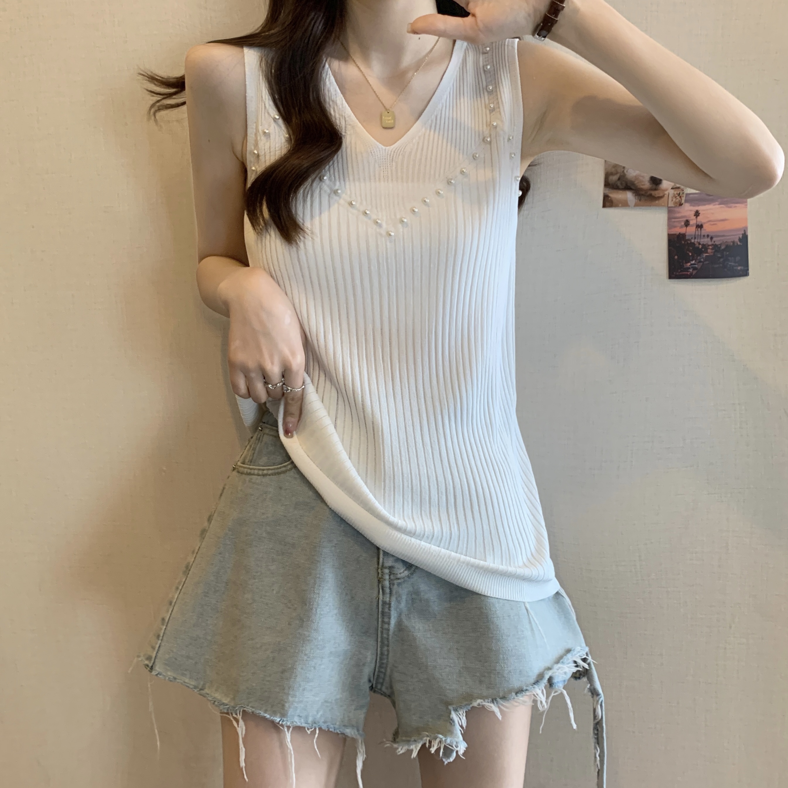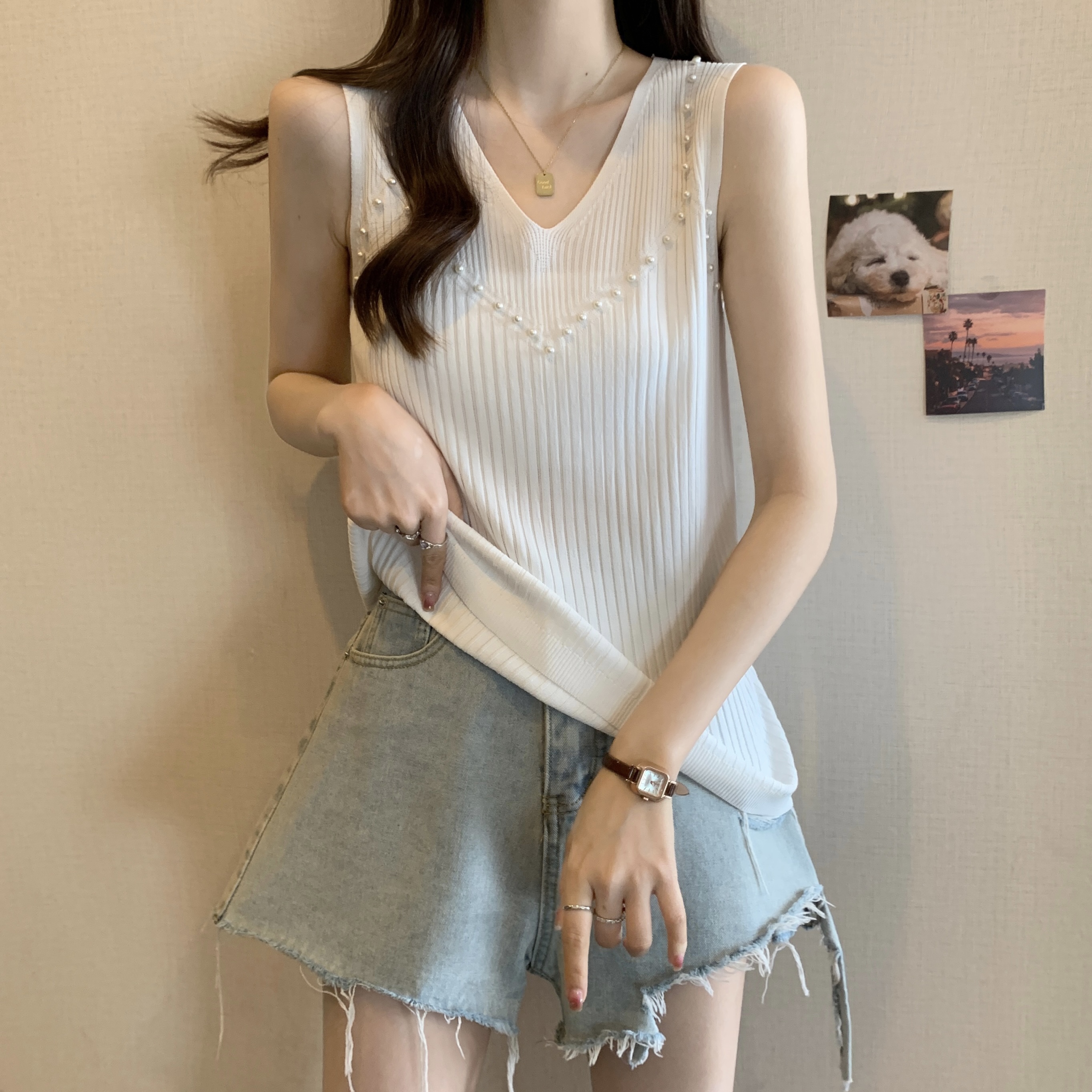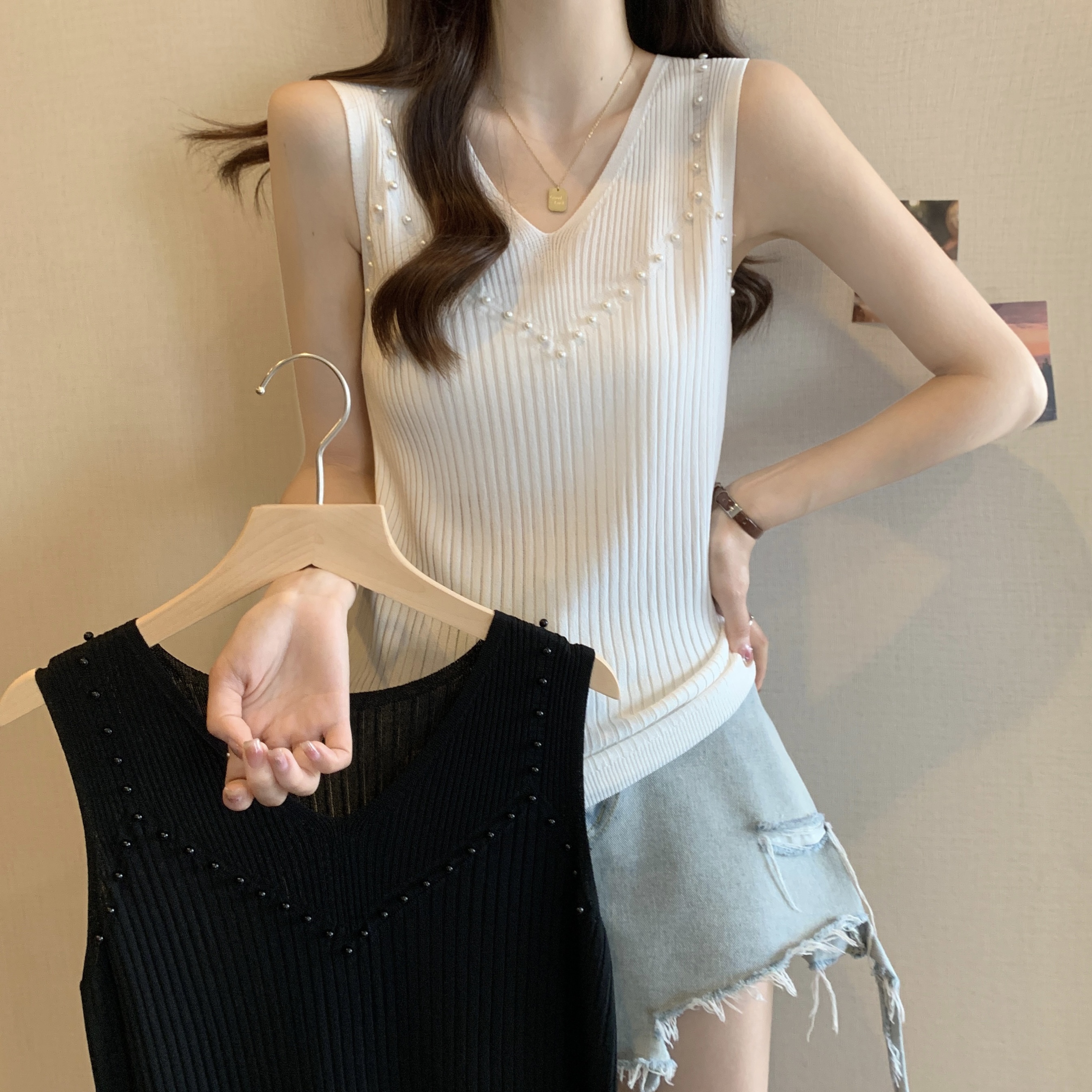 PF1155#大码新款设计感甜美风V领曲珠纯色背心吊带显瘦遮肉上衣