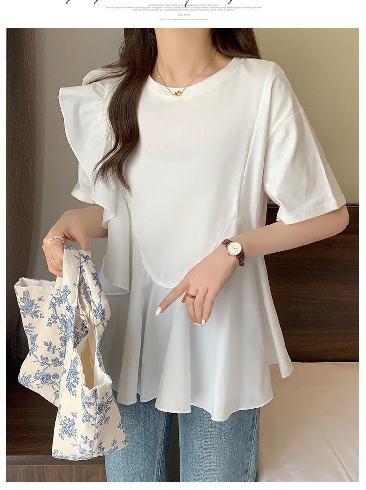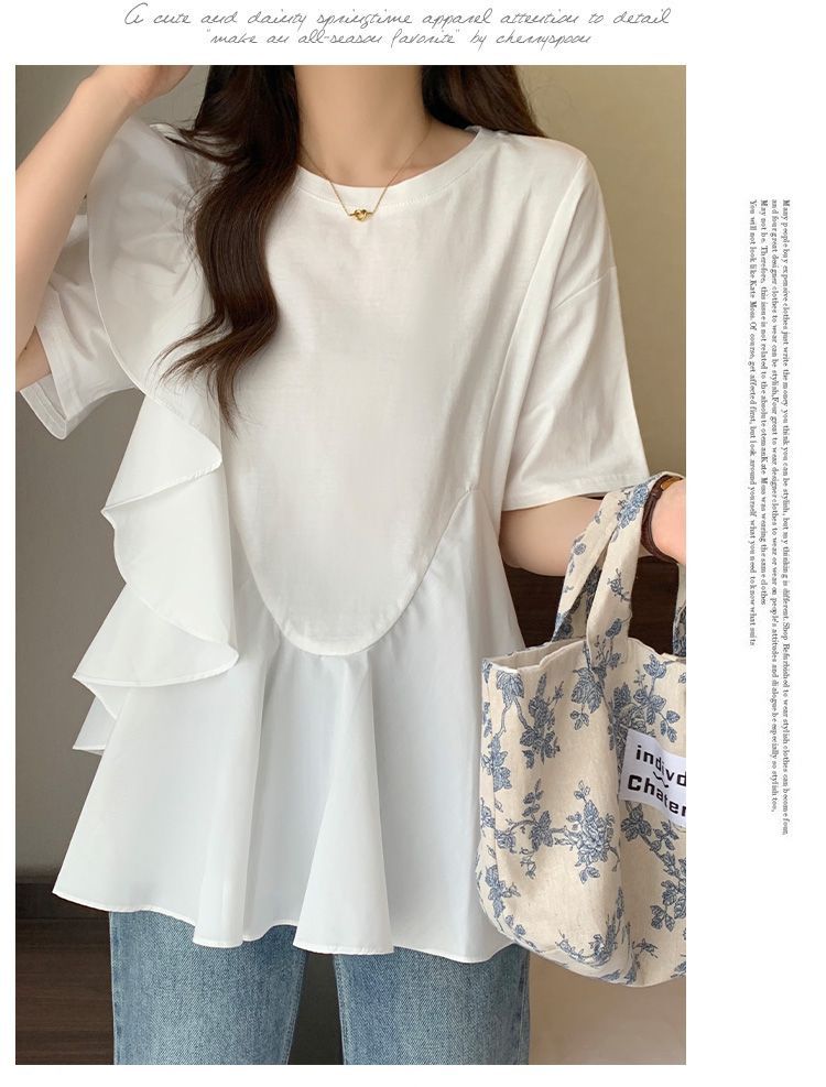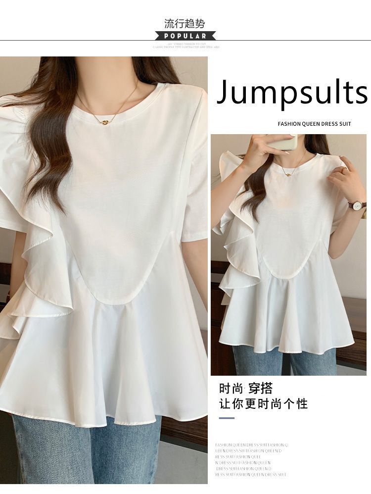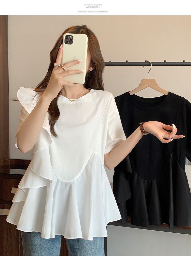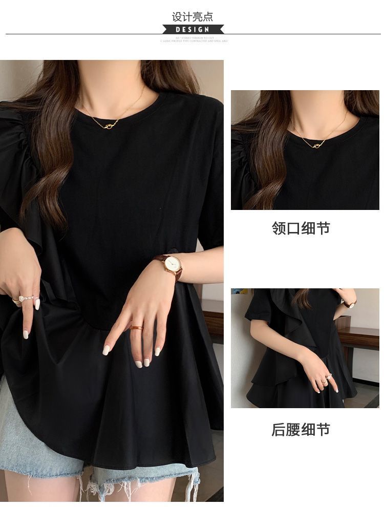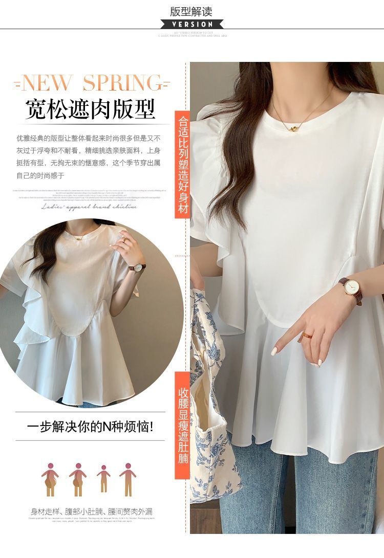 PF1173#洋气荷叶边短袖T恤女 新款大码胖mm显瘦遮肚减龄小衫上衣