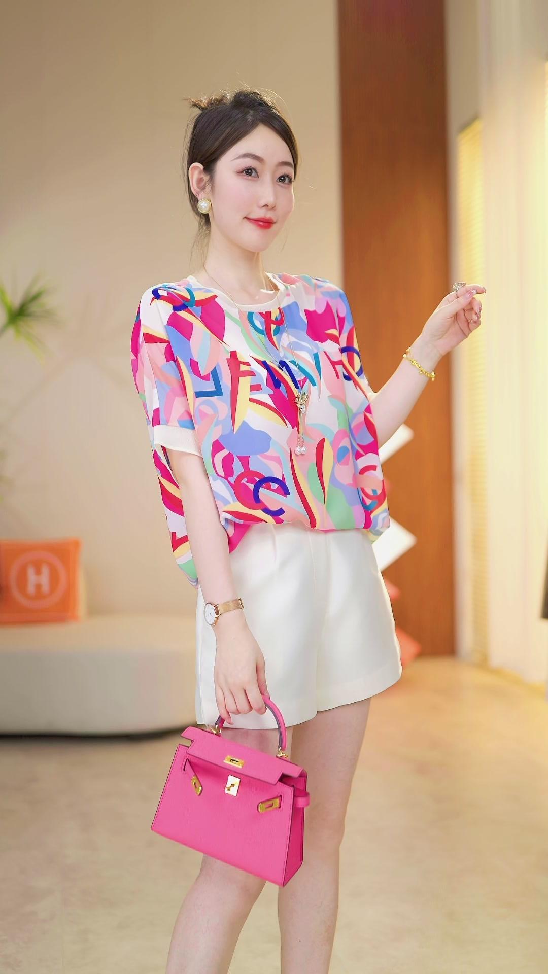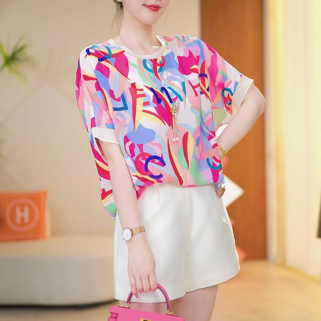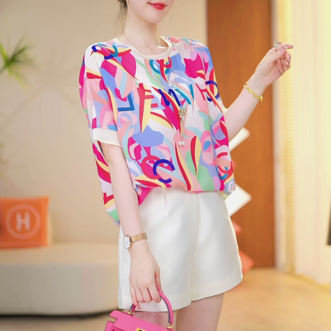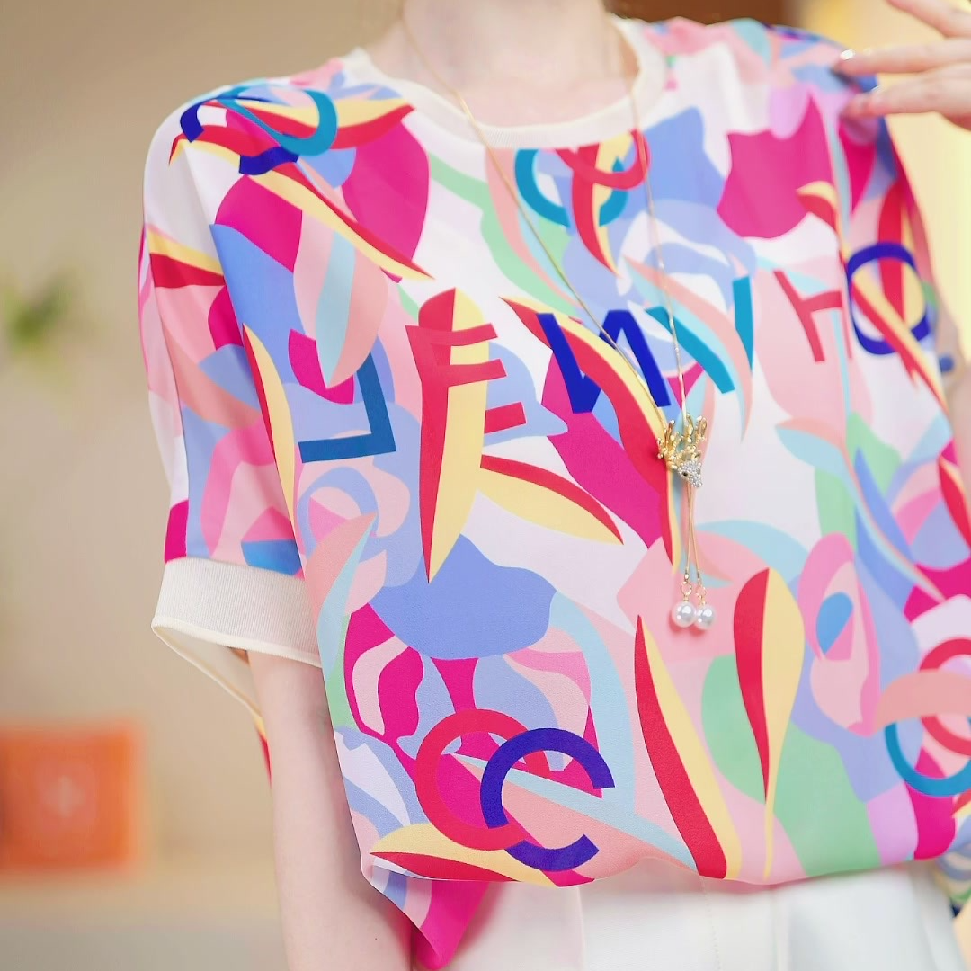 PF1178#爆款时尚气质字母几何图案圆领 短袖宽松T恤新款减龄上衣