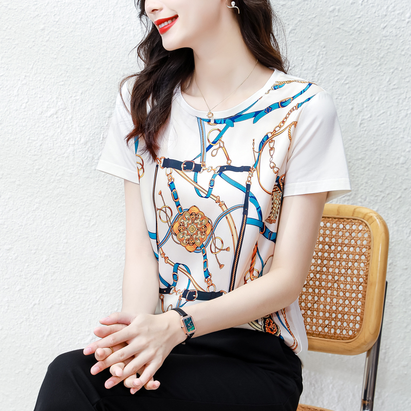 PF1214#新款重磅真丝T恤宽松女短袖印花白色圆领小衫半袖上衣