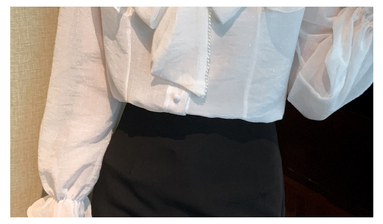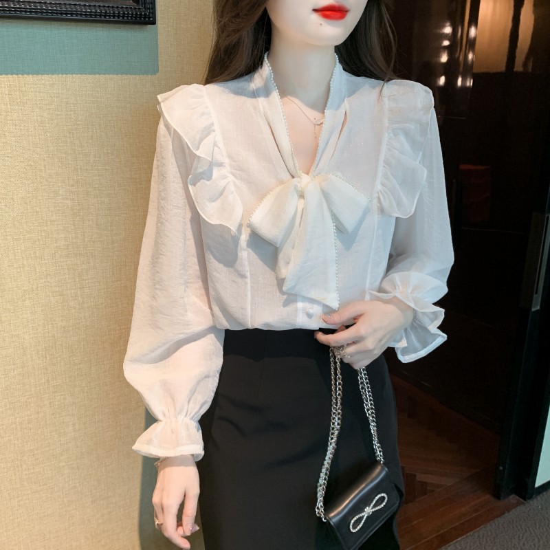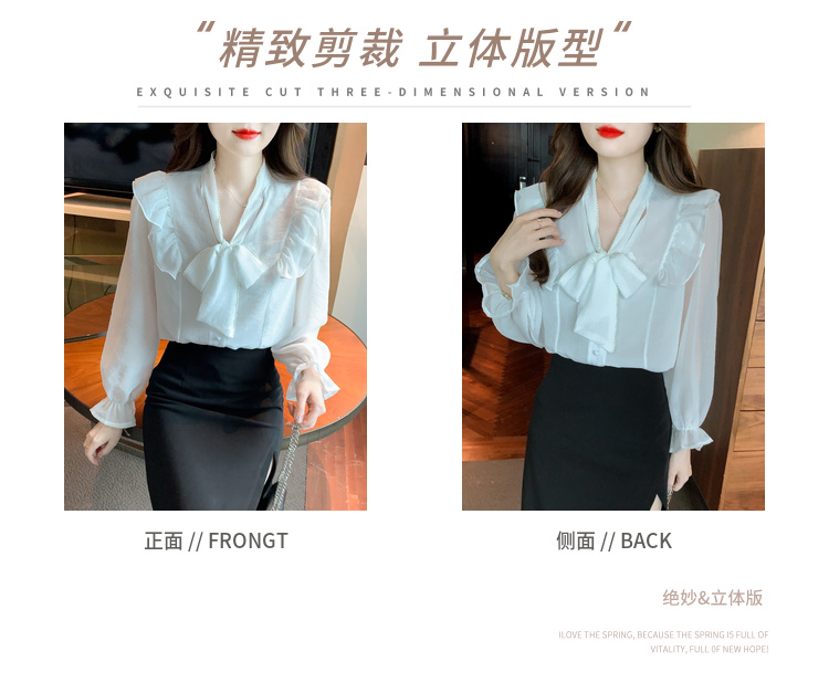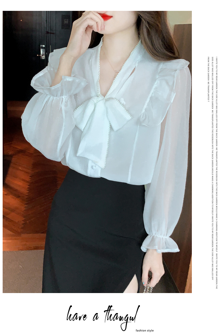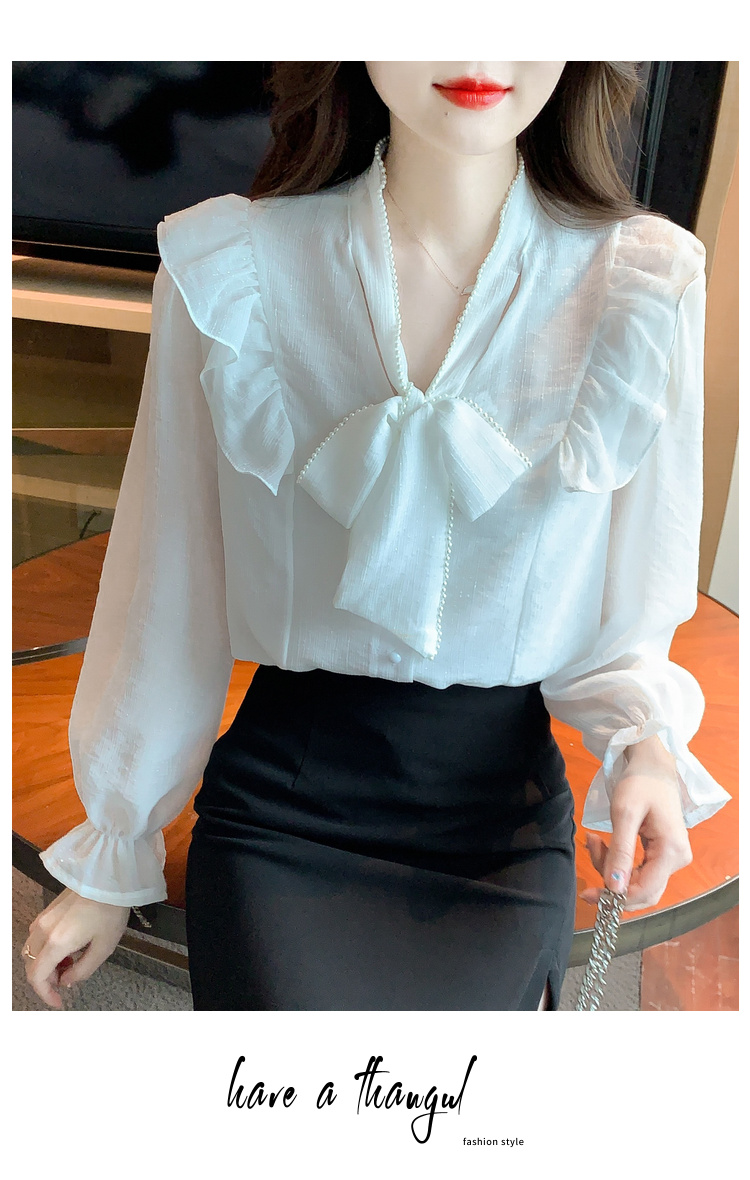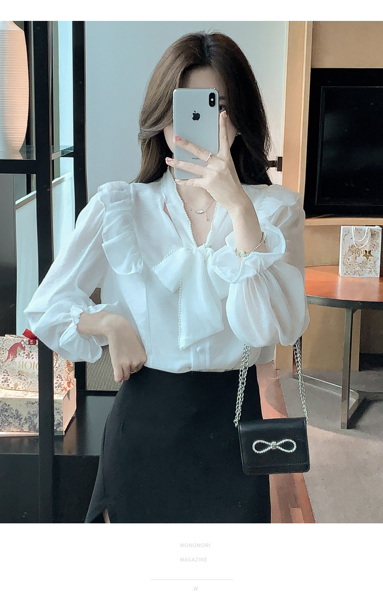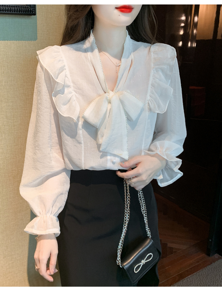 PF1230#雪纺衫荷叶边纯色上衣气质飘带设计感V领喇叭袖纯色