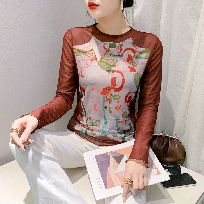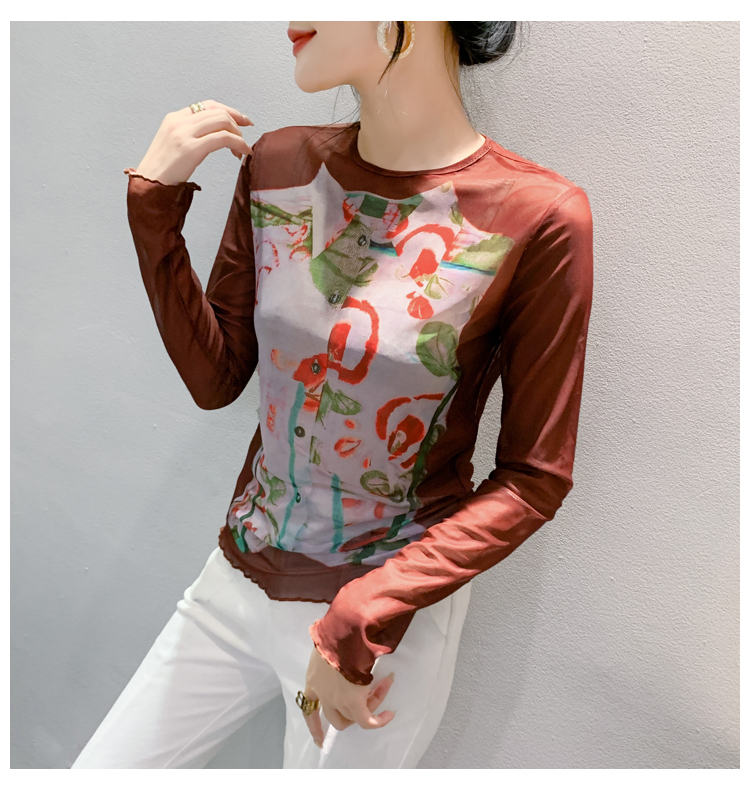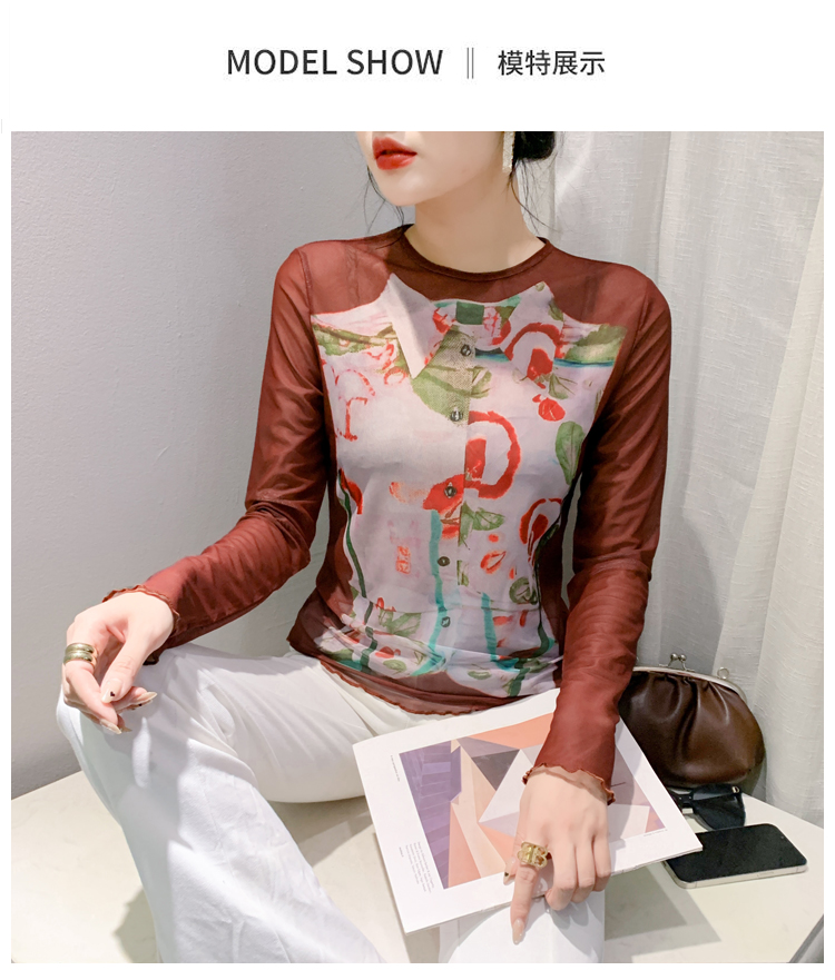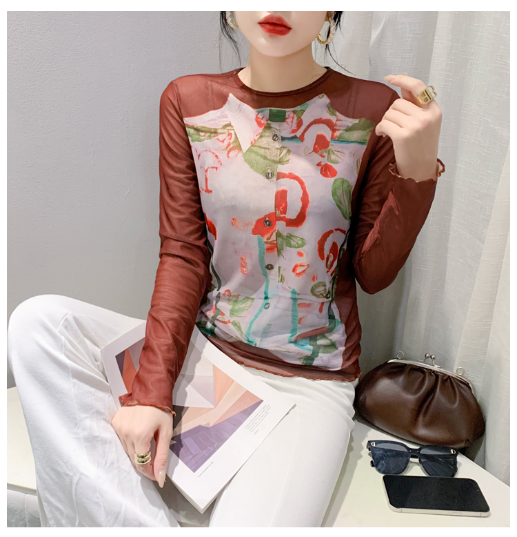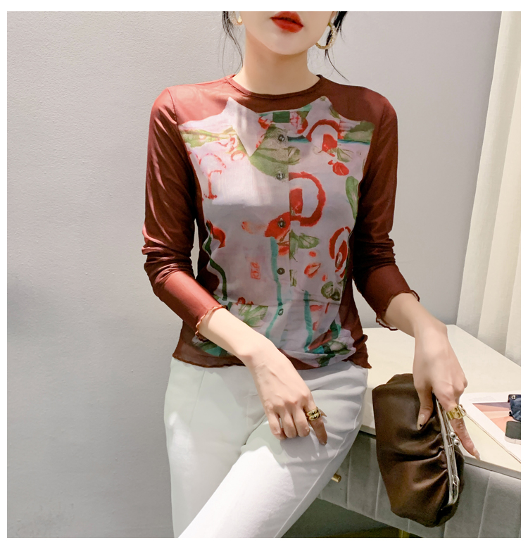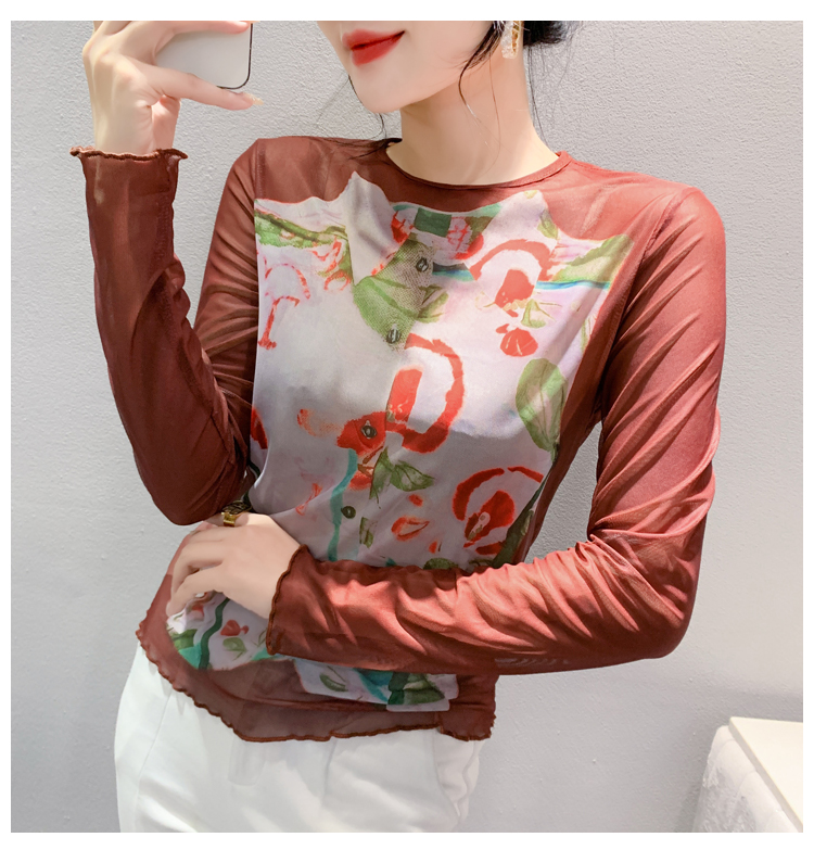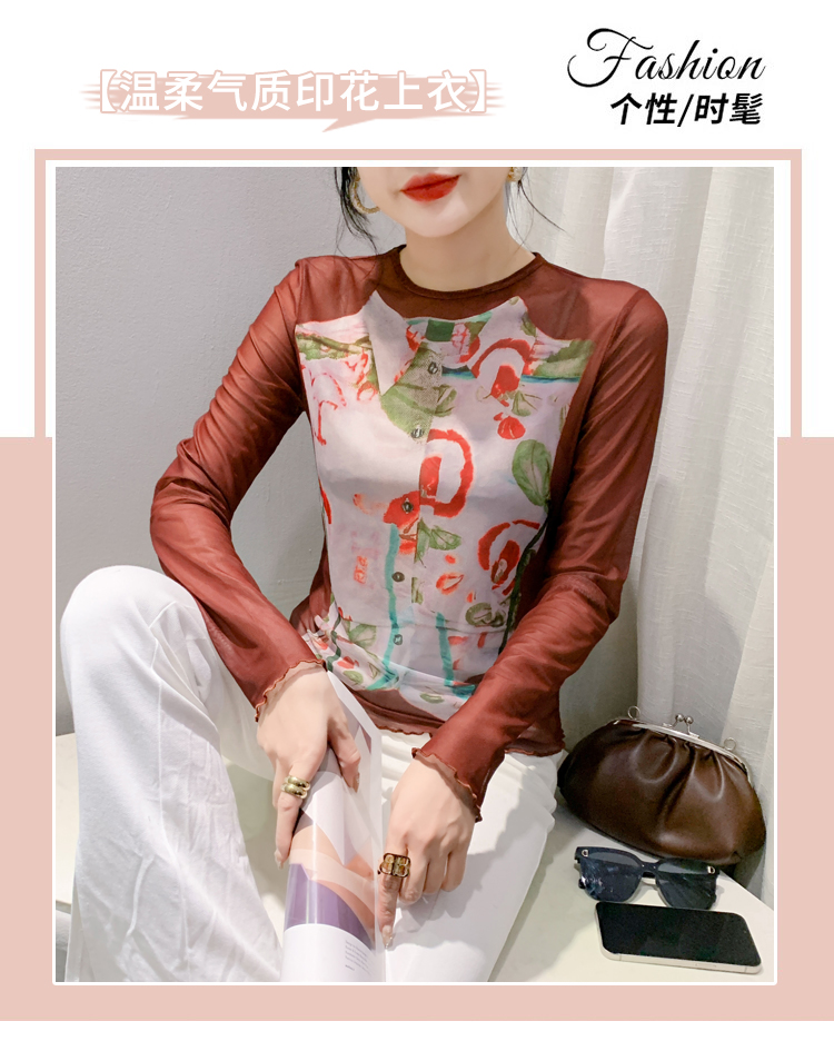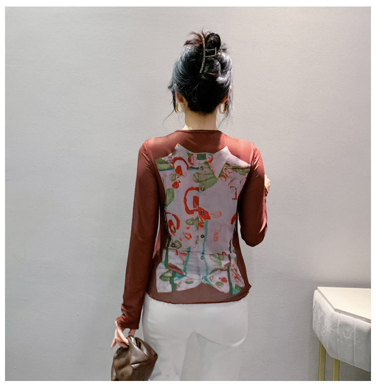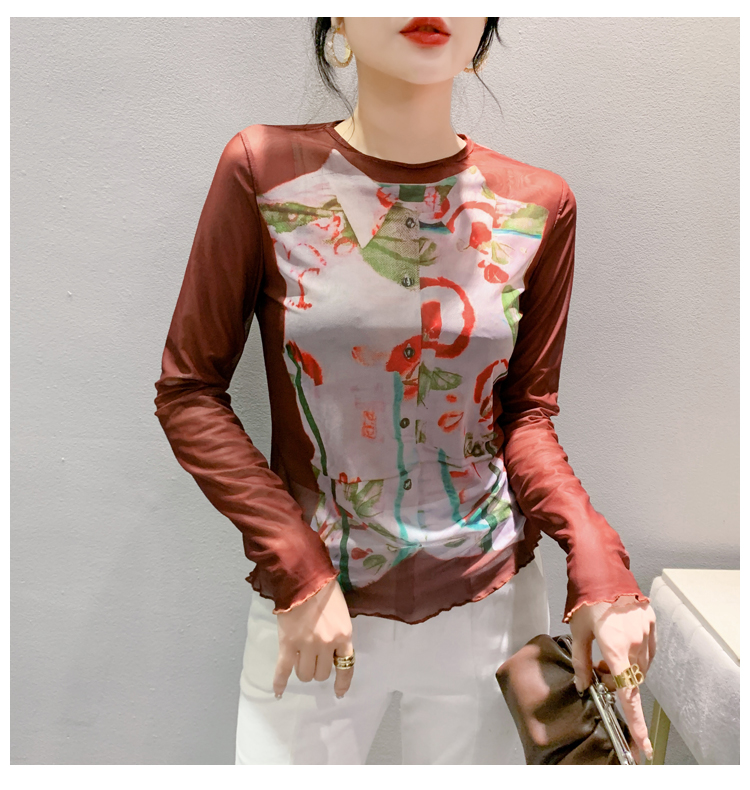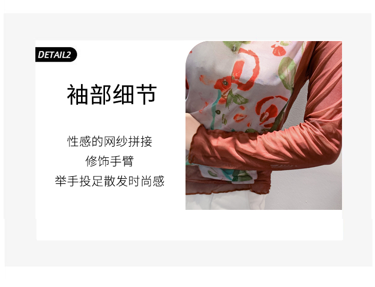 PF1242#欧货 新款修身时尚网纱印花拼接圆领长袖T恤防晒衣女