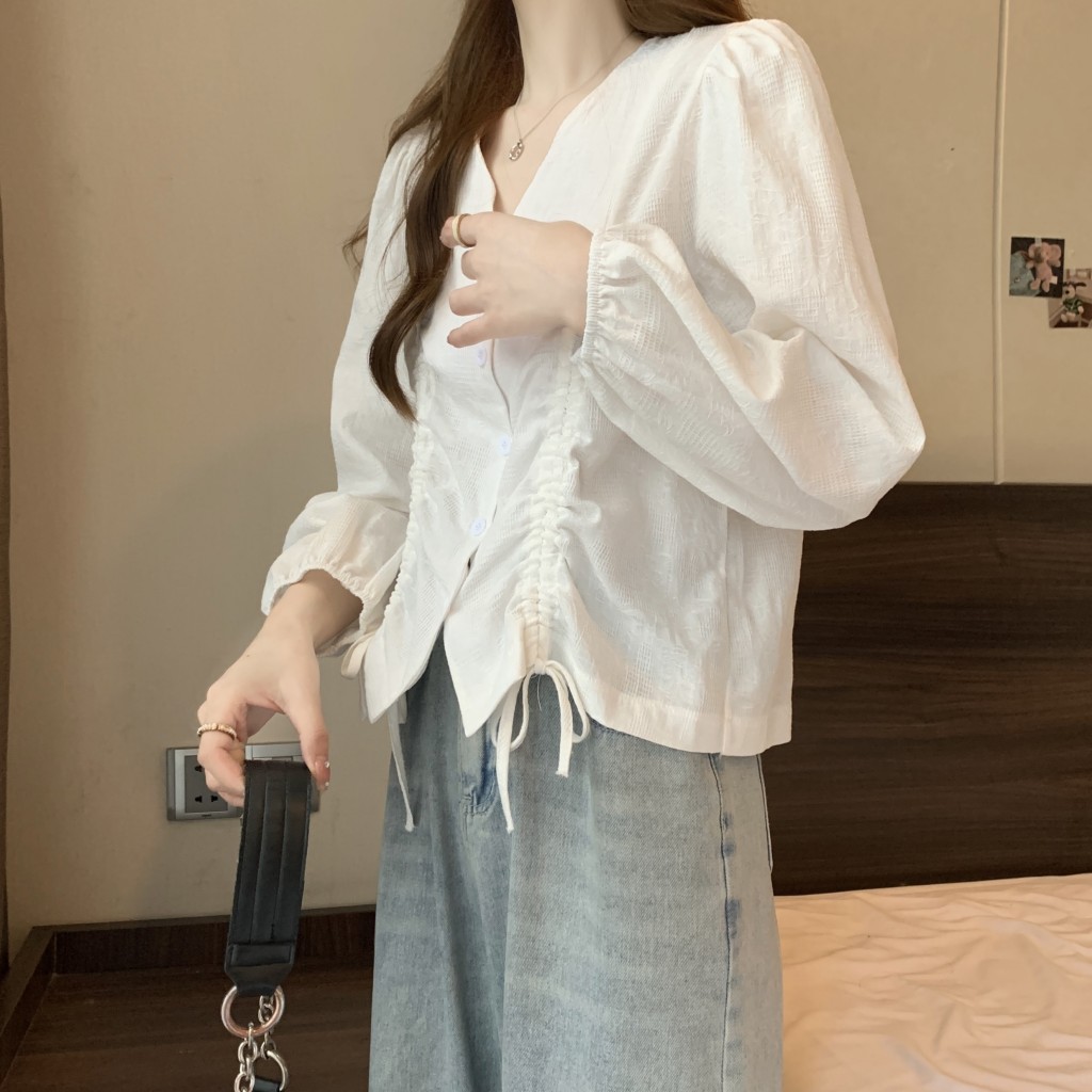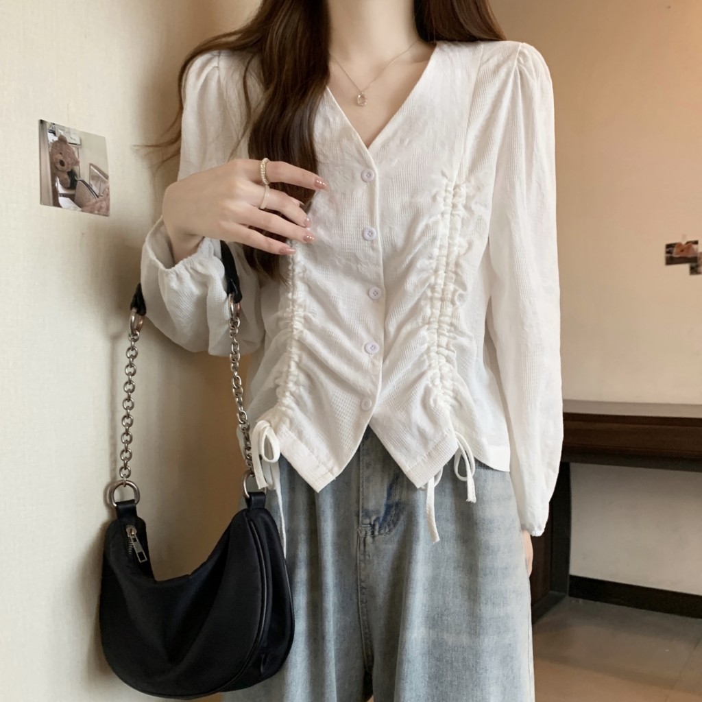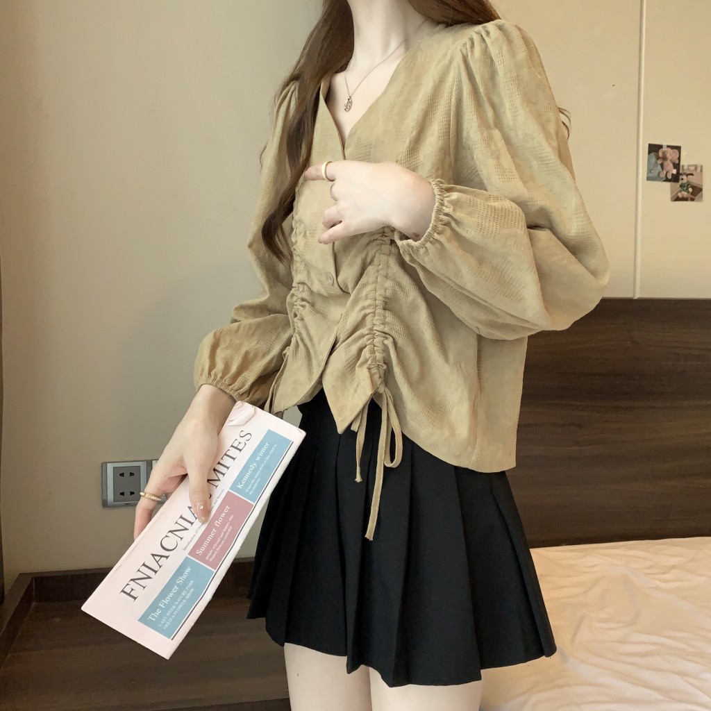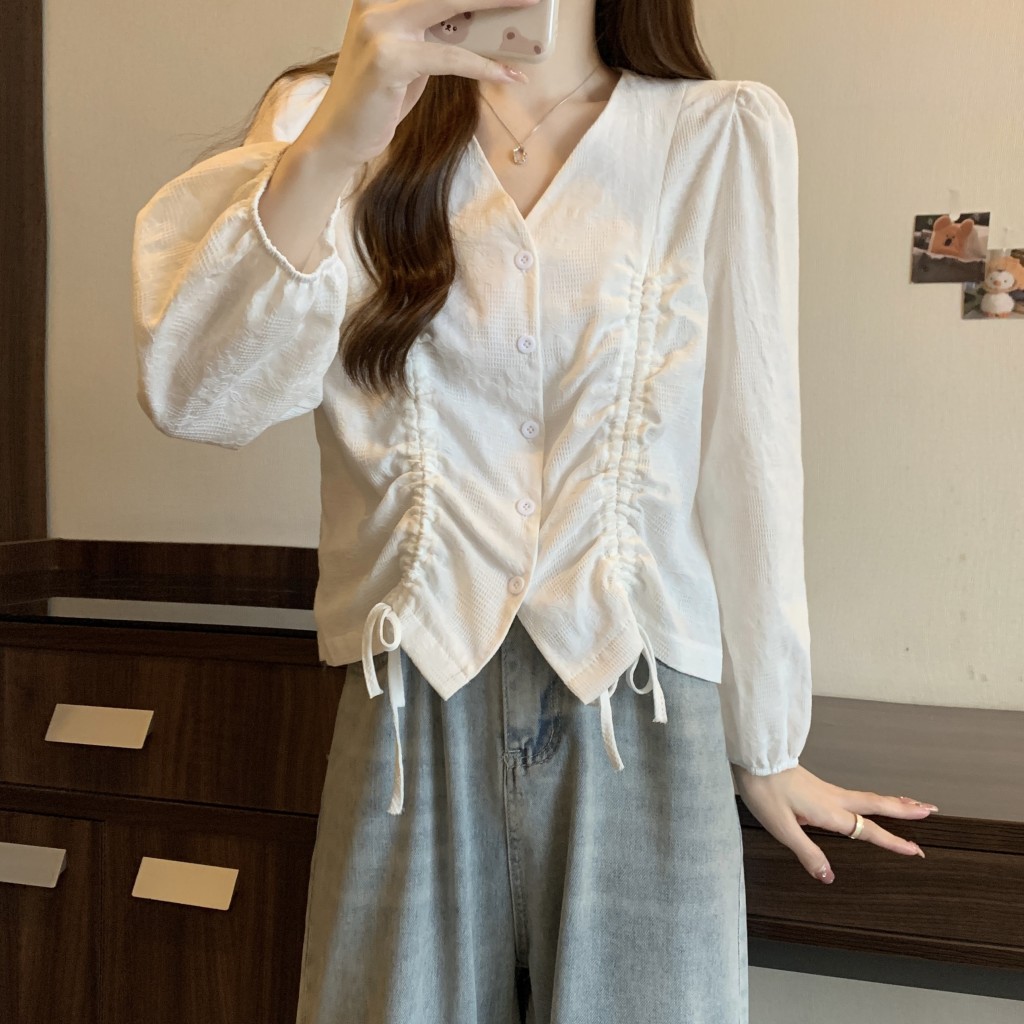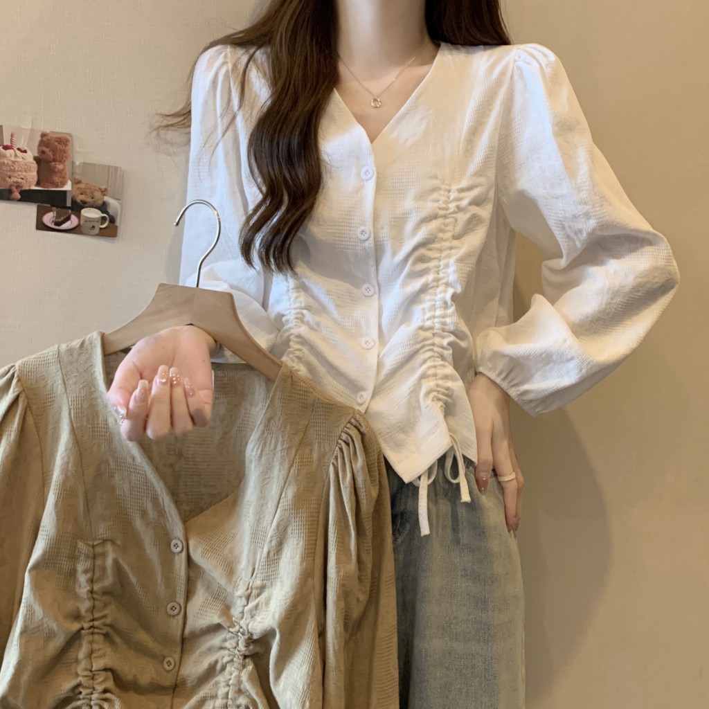 PF1254#大码~慵懒复古长袖V领衬衫设计感小众春装新款衬衣外套上衣