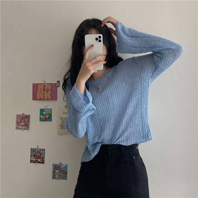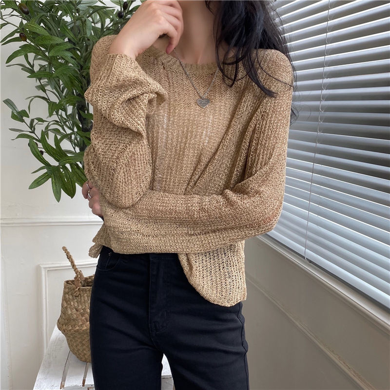 PF1271#夏季新款韩版冰丝镂空针织罩衫女慵懒宽松外穿薄款套头长袖毛衣潮