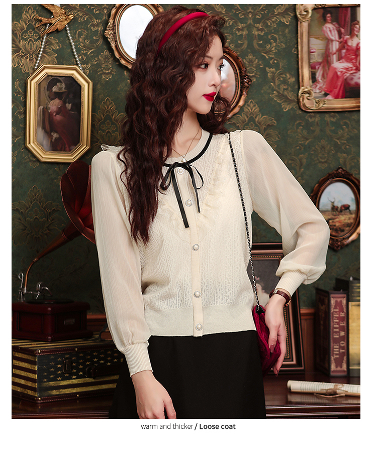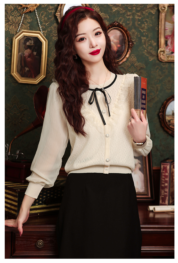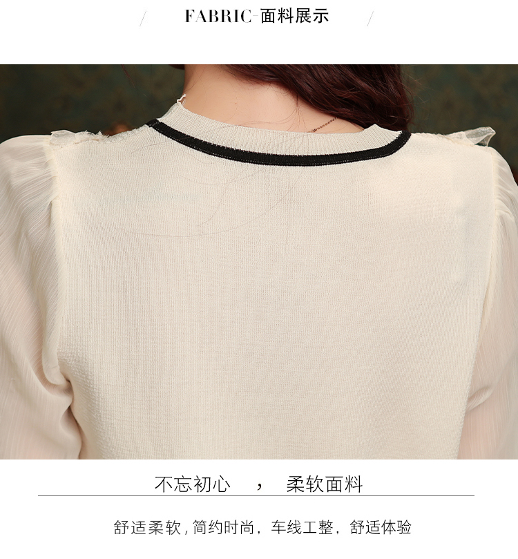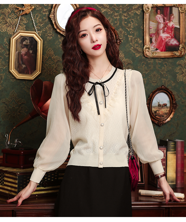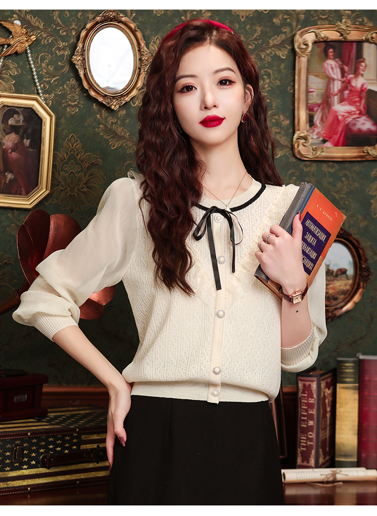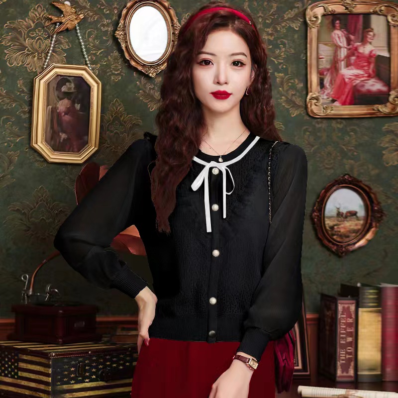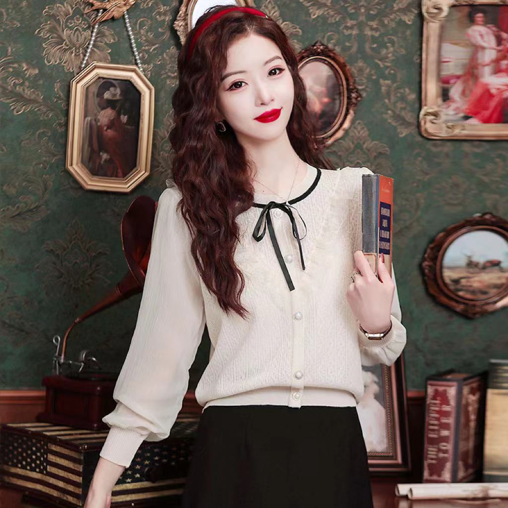 PF1332#新款雪纺拼接欧根纱针织衬衫港风蝴蝶结设计小衫