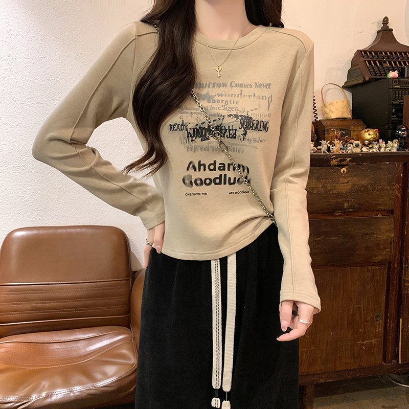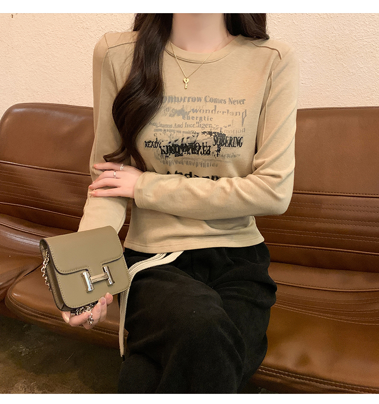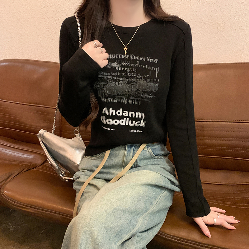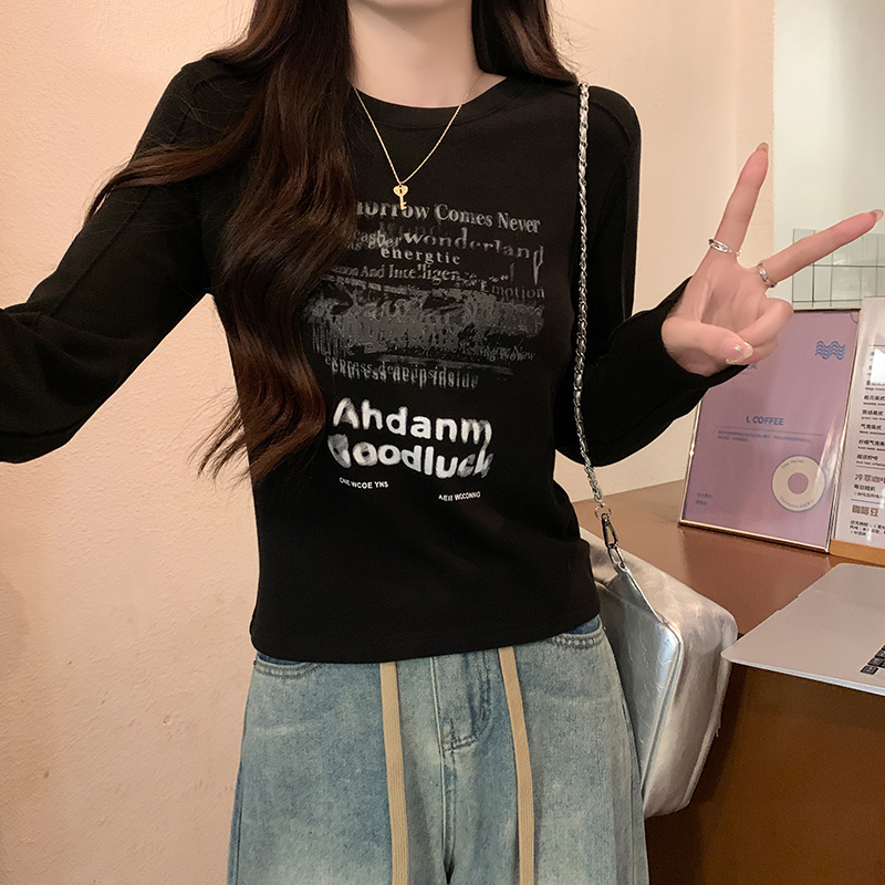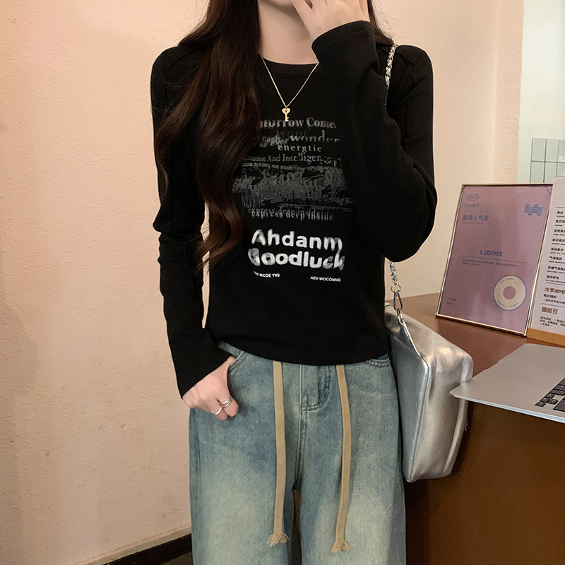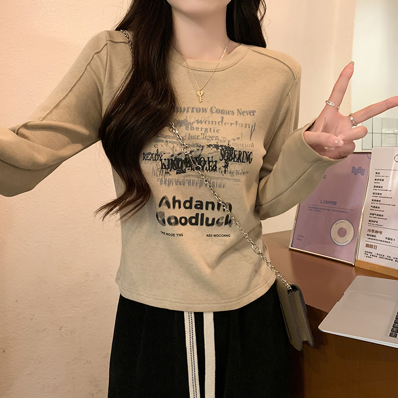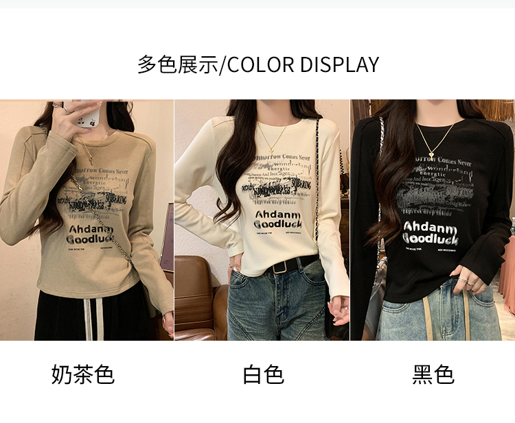 PF1379#螺纹 长袖t恤女春秋薄款圆领印花打底衫上衣大码女装