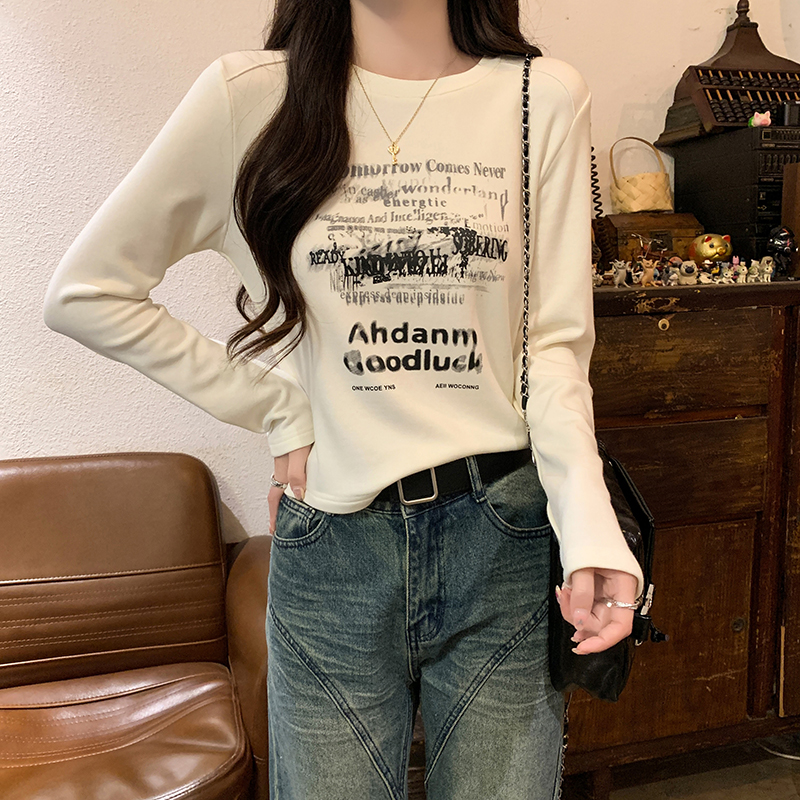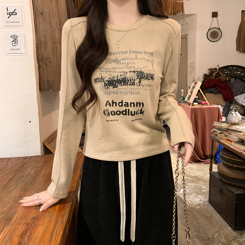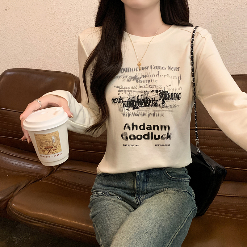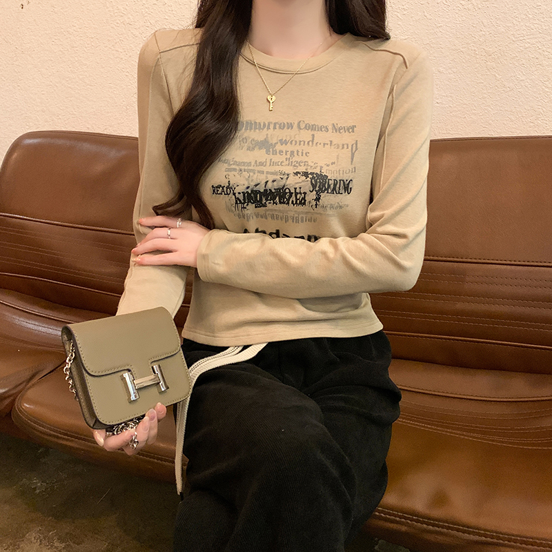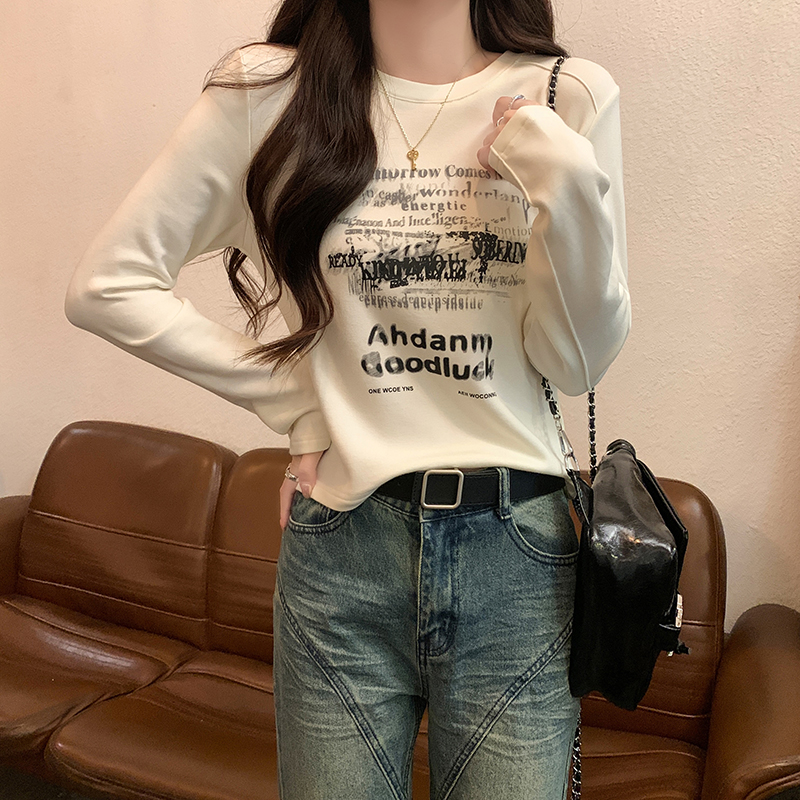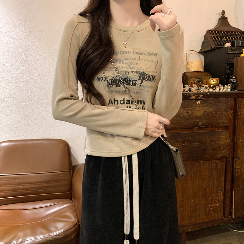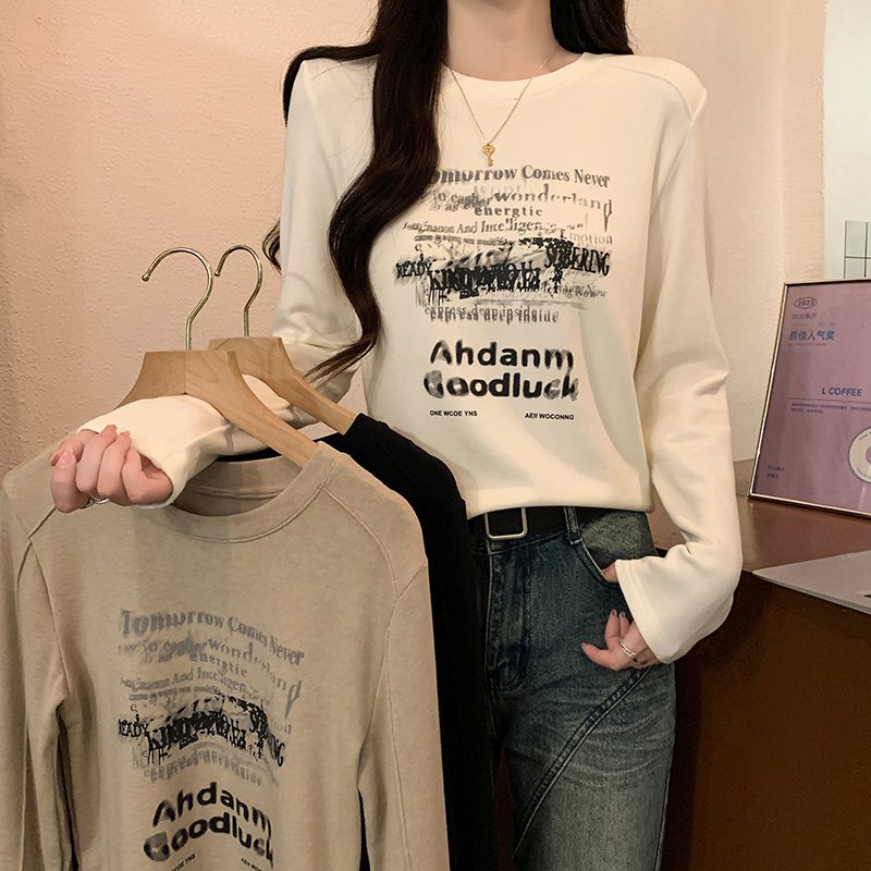 PF1379#螺纹 长袖t恤女春秋薄款圆领印花打底衫上衣大码女装