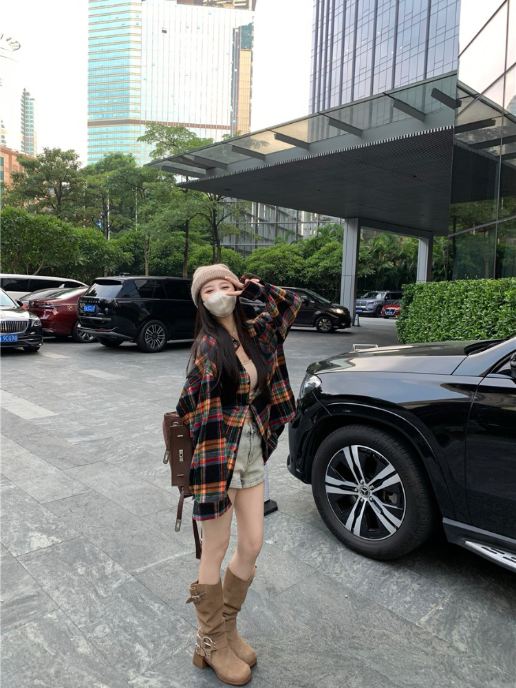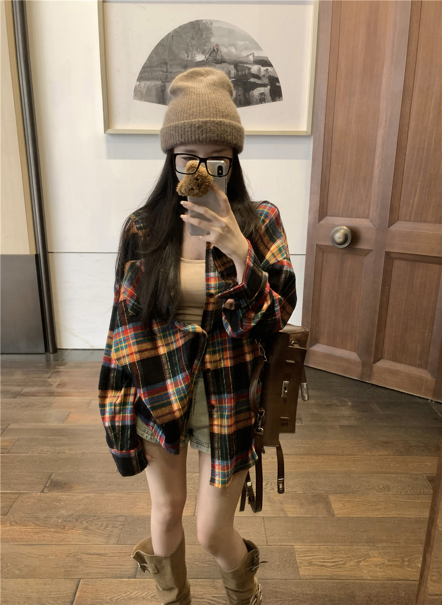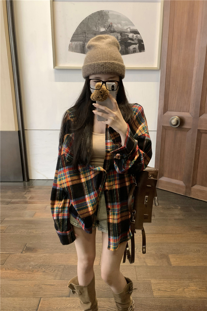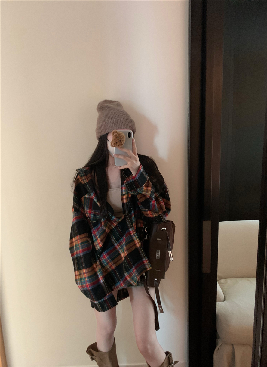 PF1380#复古格子polo领衬衫外套女春季韩版小个子中长款宽松衬衣别致上衣