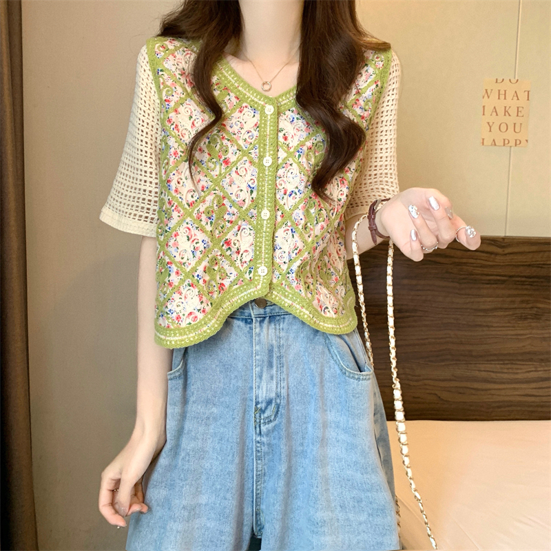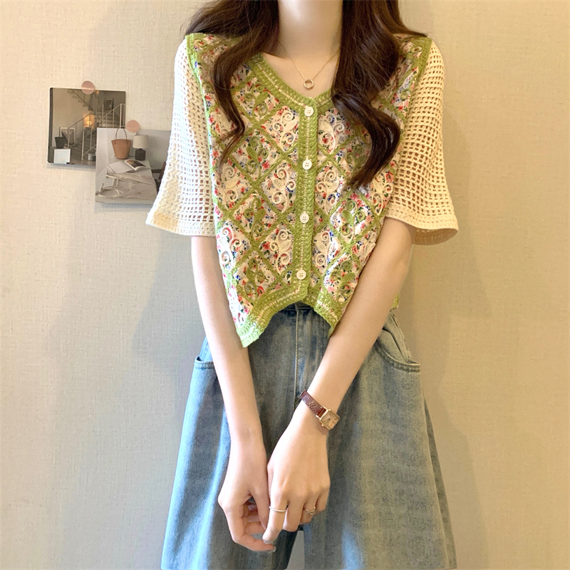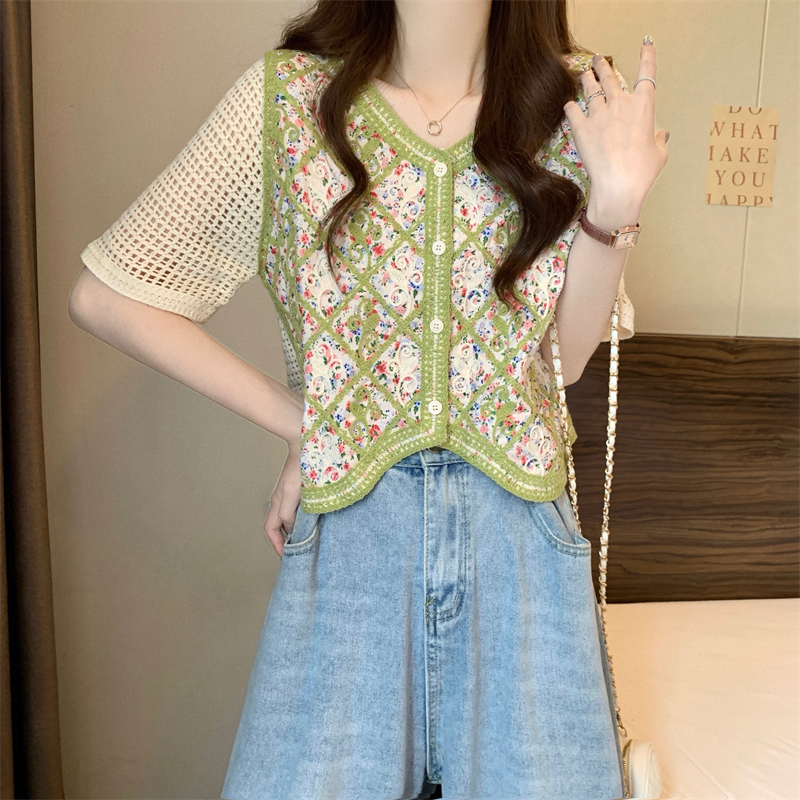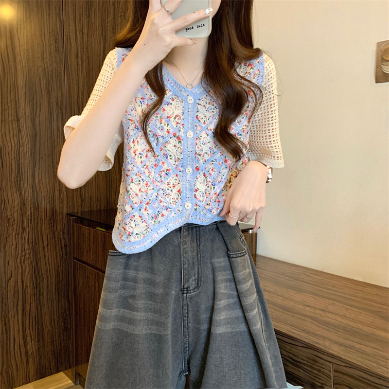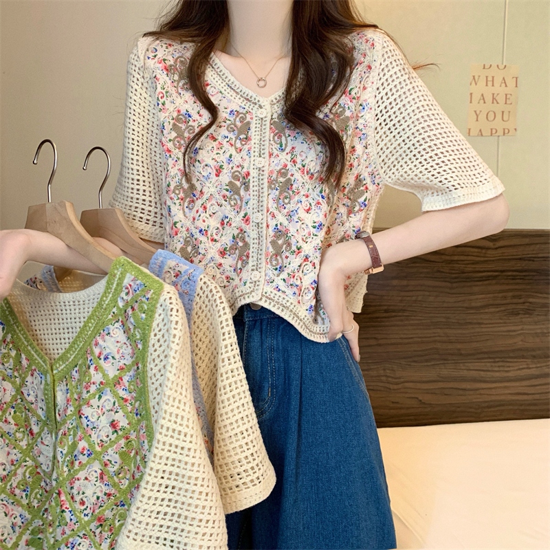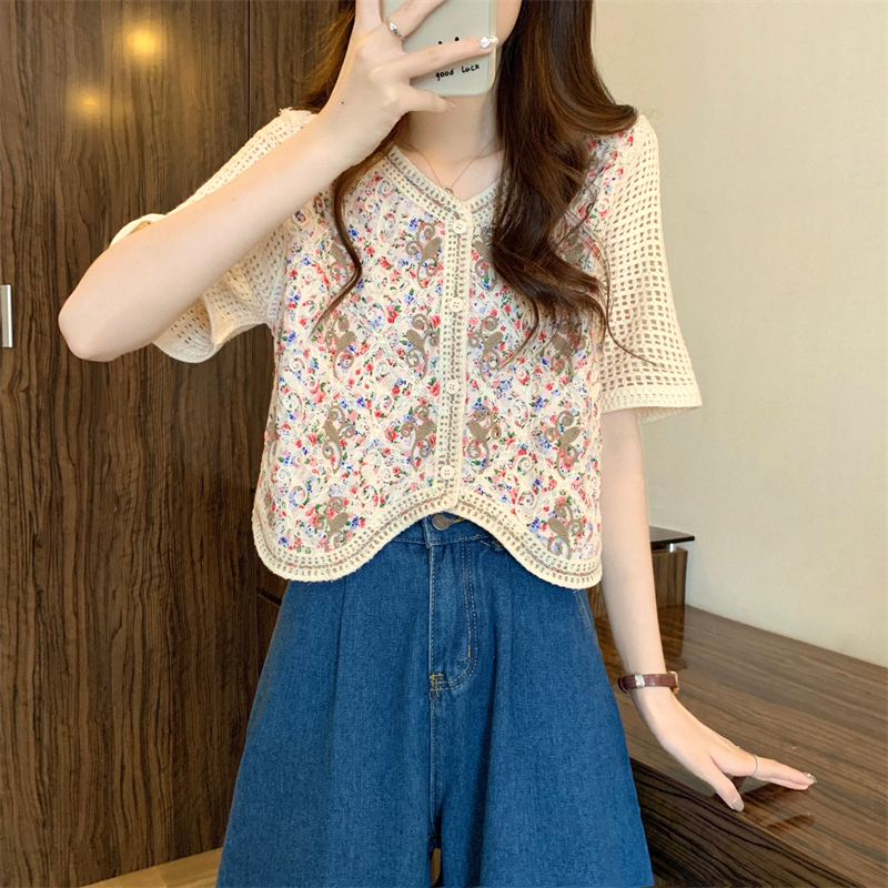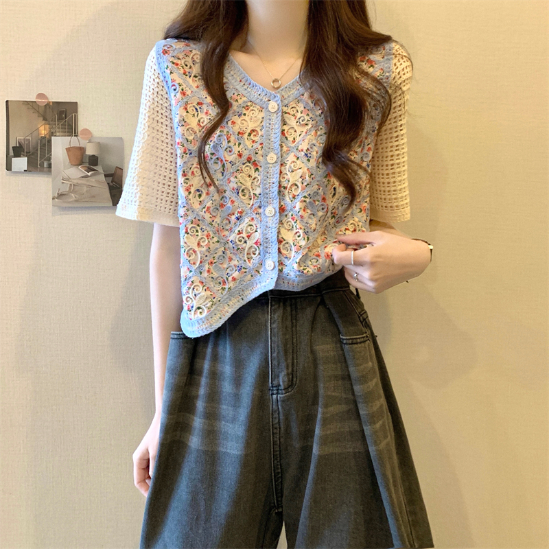 PF1394#新版韩风镂空钩花设计感针织短袖小开衫