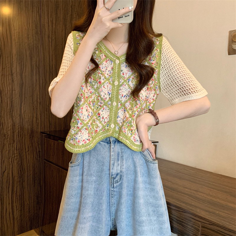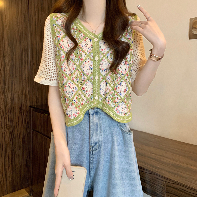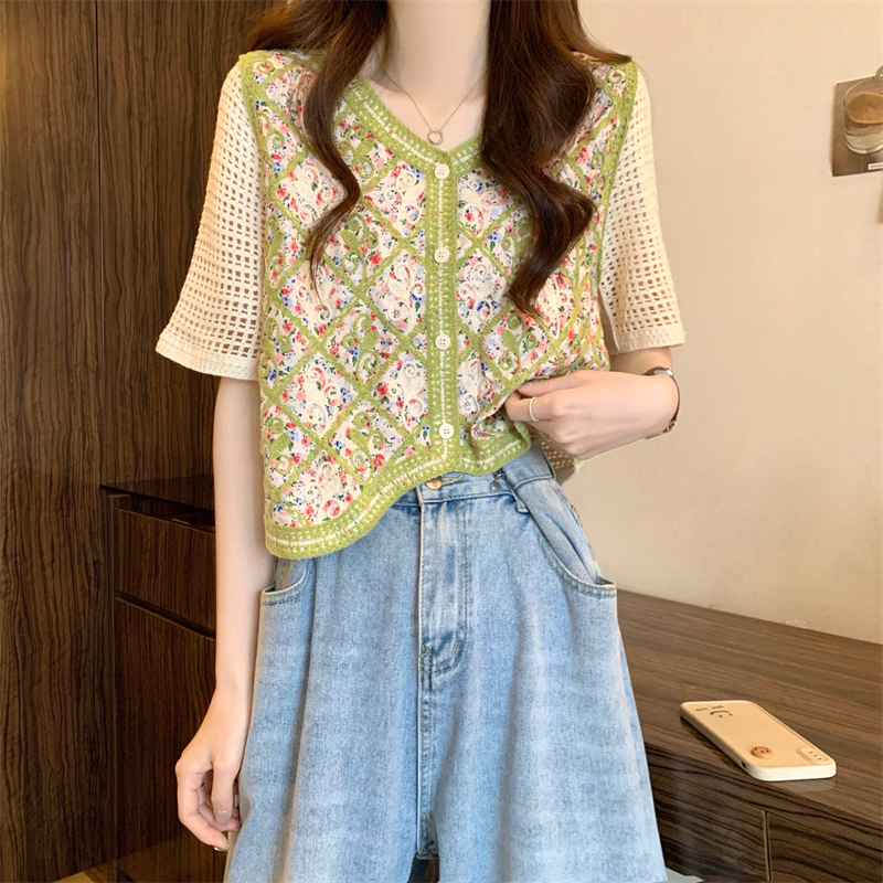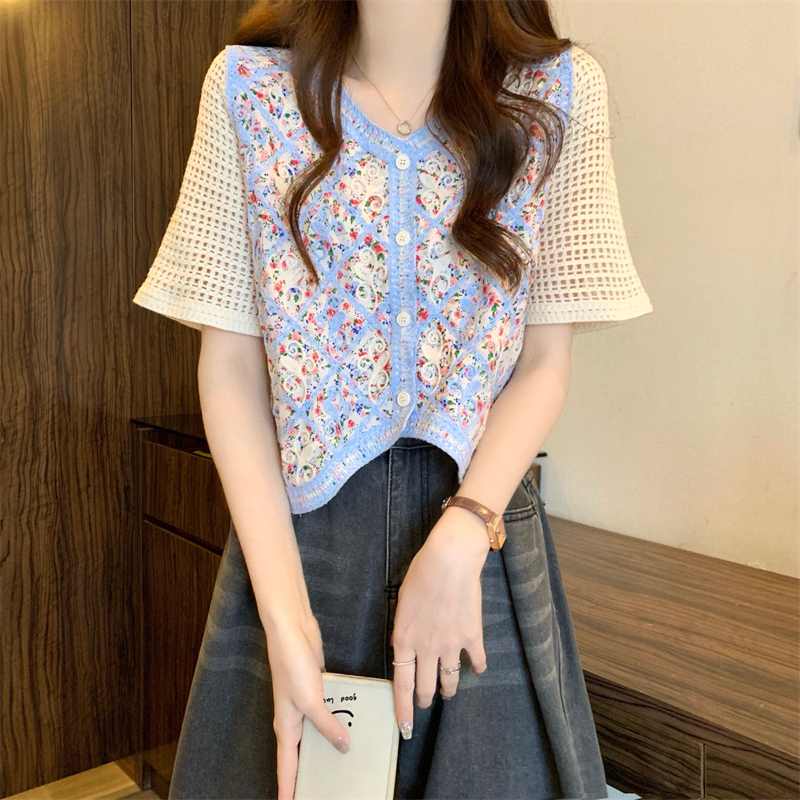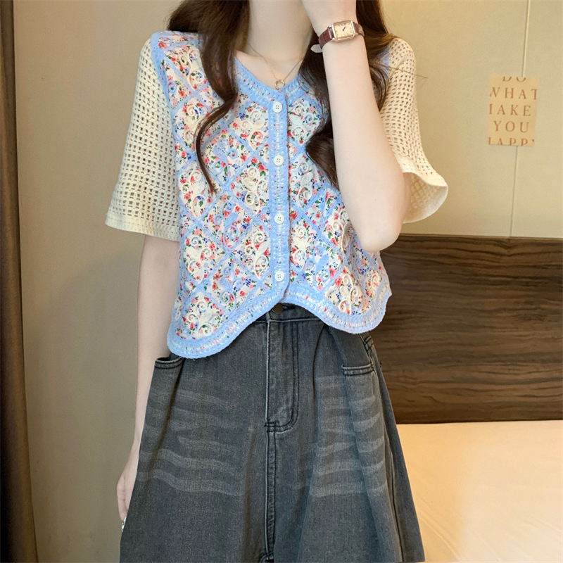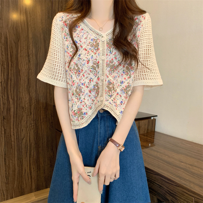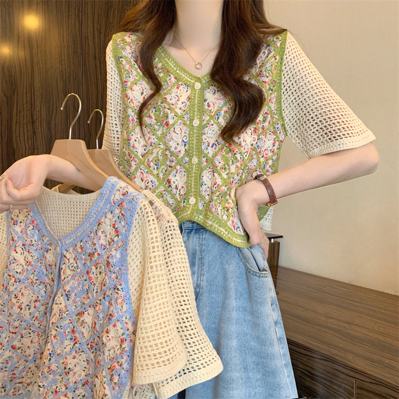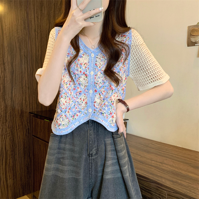 PF1394#新版韩风镂空钩花设计感针织短袖小开衫