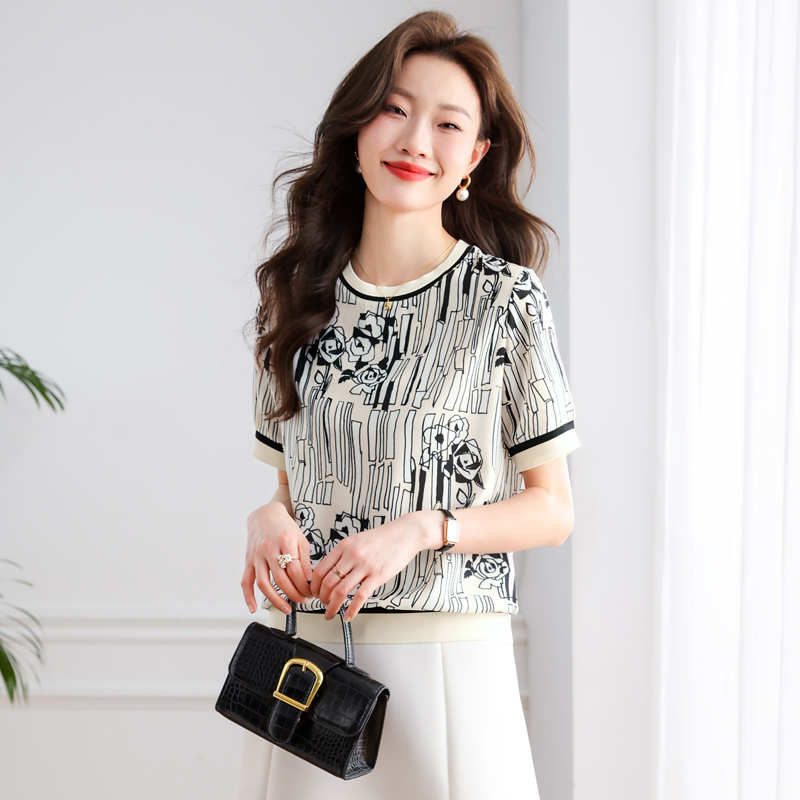 PF1428#蚕丝上衣女短袖 夏季新款显瘦印花仿真丝邹气质半袖T恤