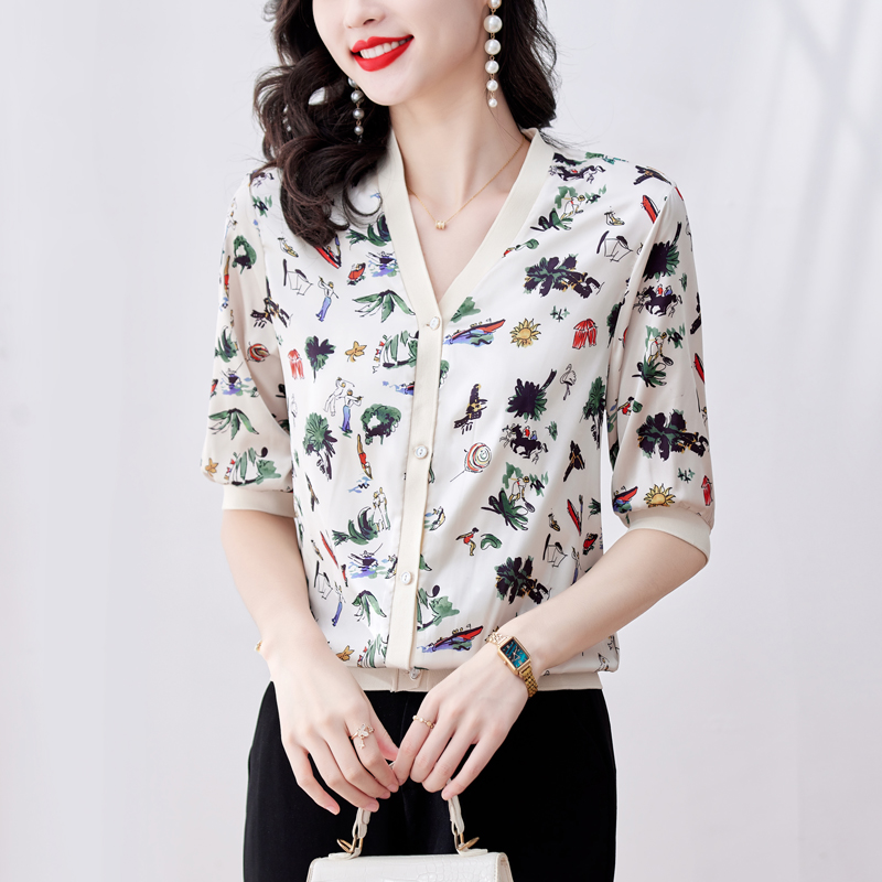 PF1431#新款高端锻面数码印开衫V领时尚防嗮衣半袖外搭休闲上衣