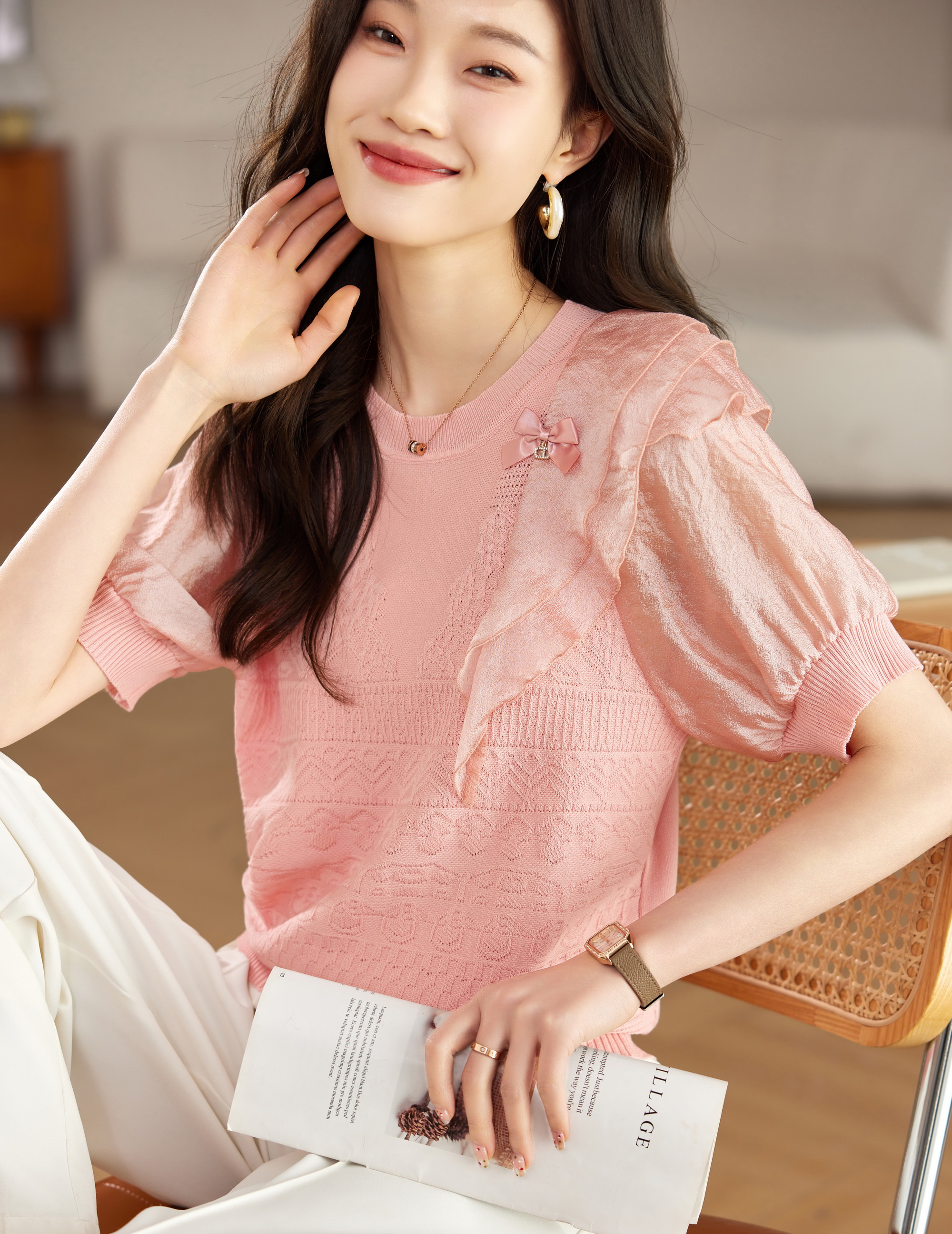 PF1433#针织衫t恤女短袖 新款粉色韩版宽松时尚设计感上衣