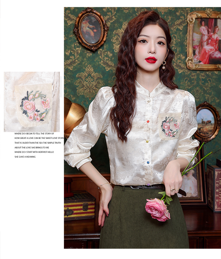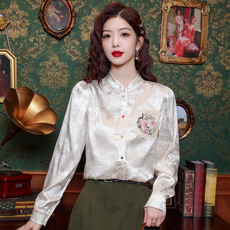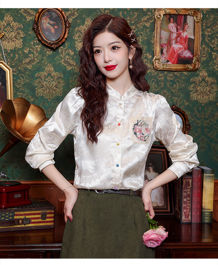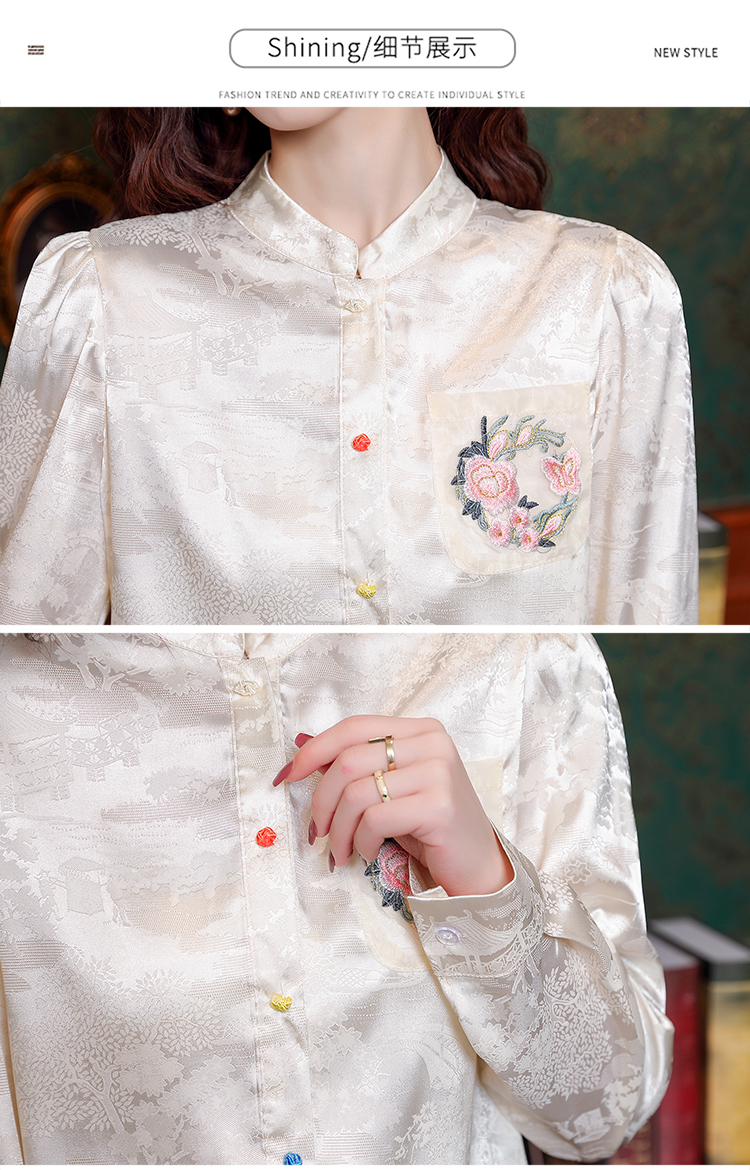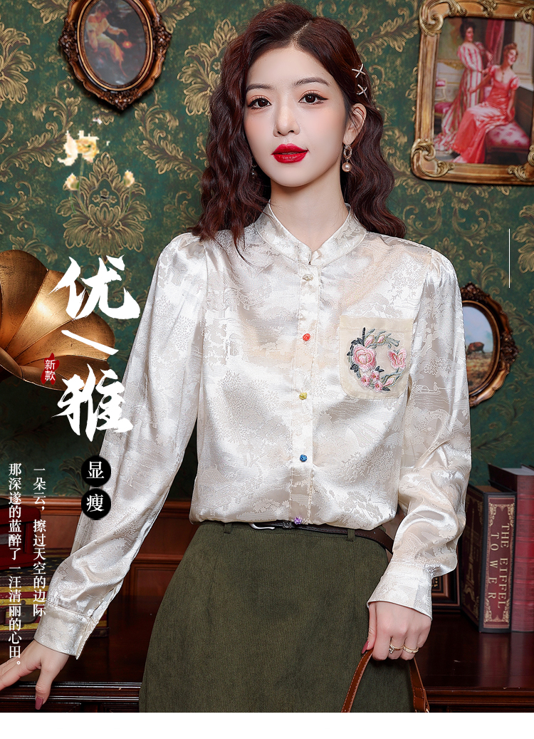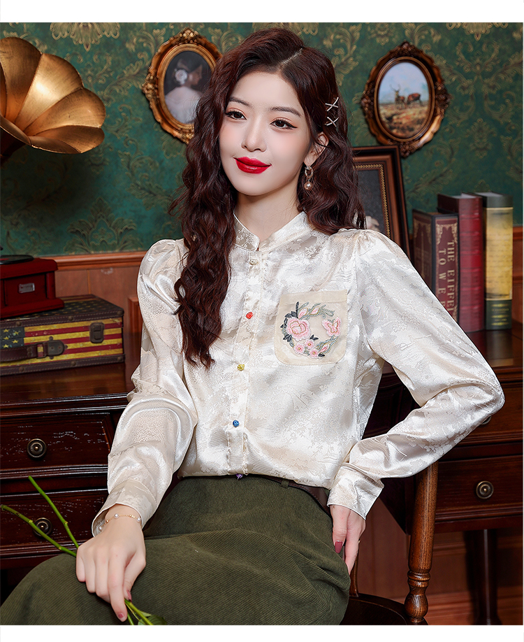 PF1436#新中式立领刺绣长袖提花衬衫女 新款宫廷风上衣