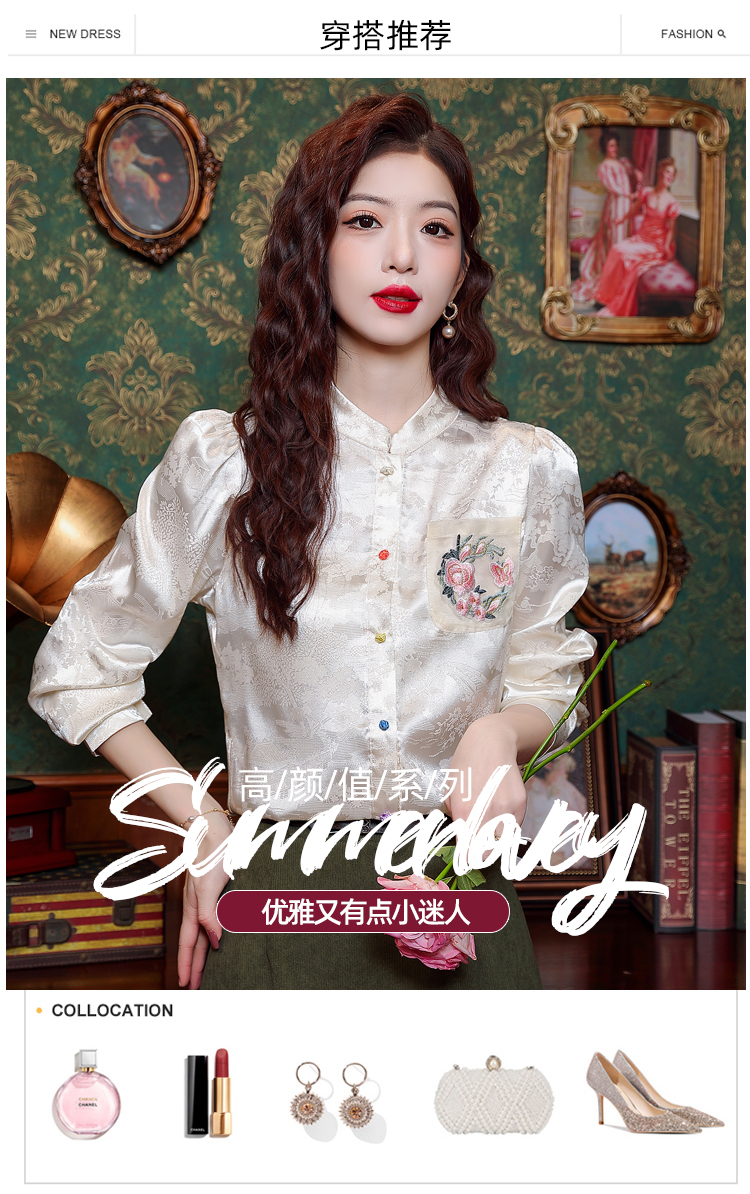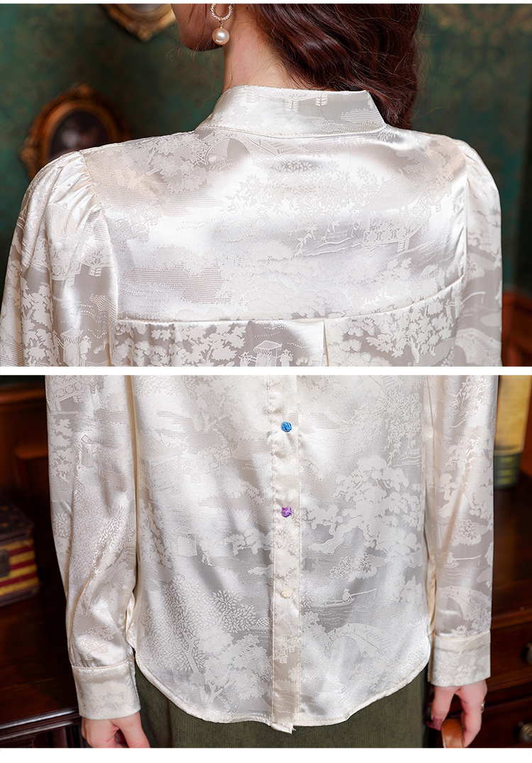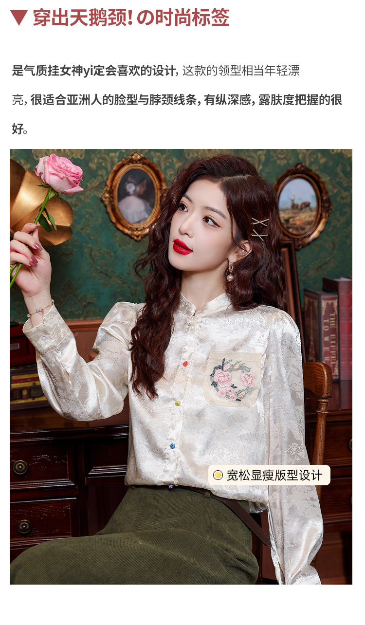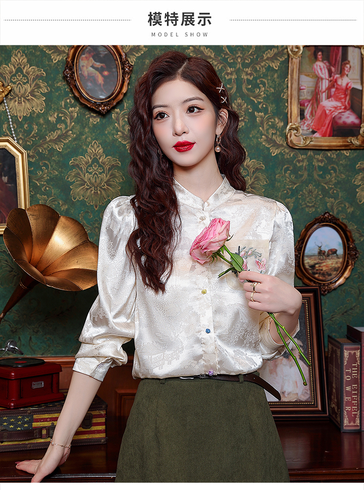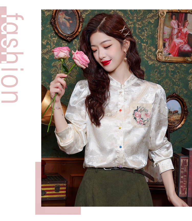 PF1436#新中式立领刺绣长袖提花衬衫女 新款宫廷风上衣