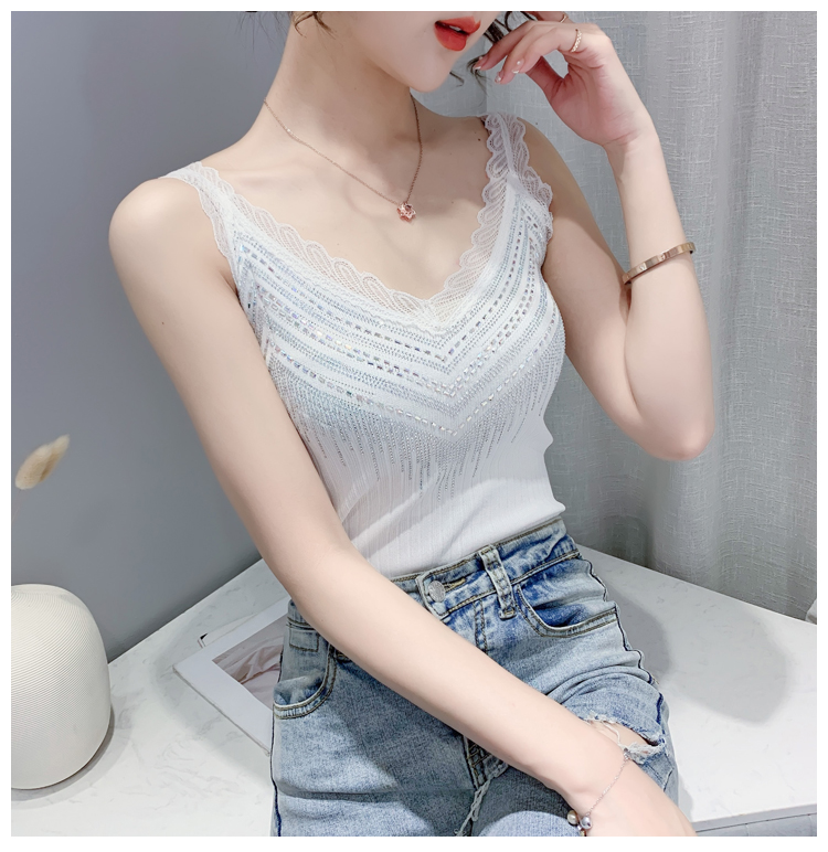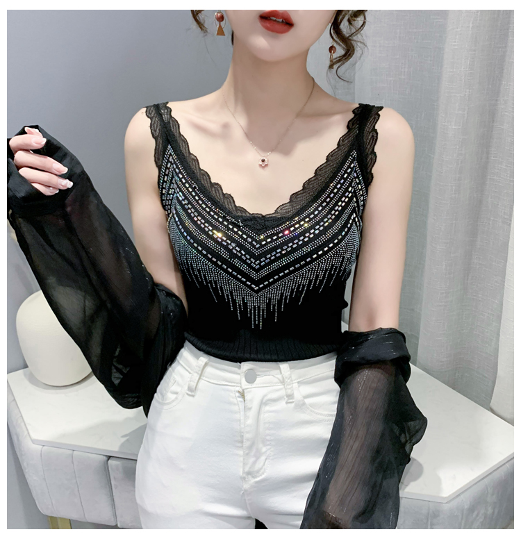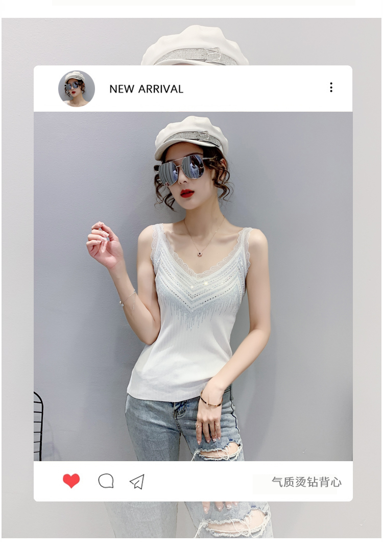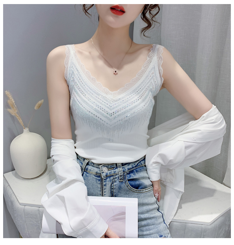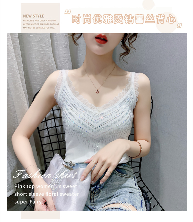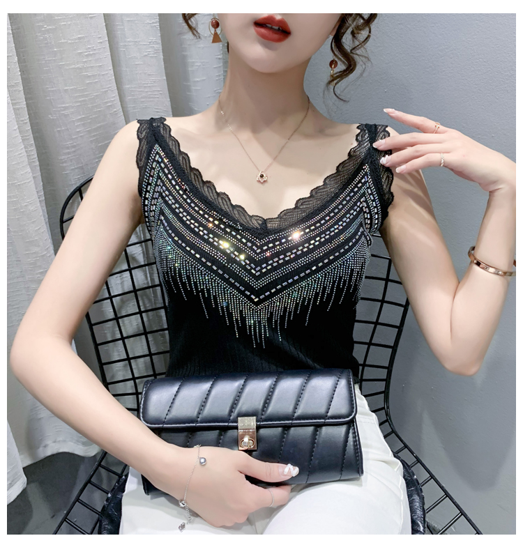 PF1528#春夏新款V领烫钻蕾丝花边无袖打底衫修身套头上衣女背心吊带
